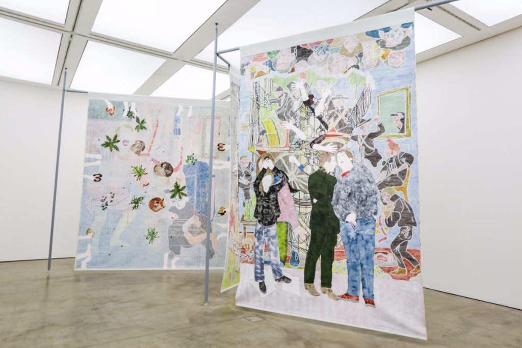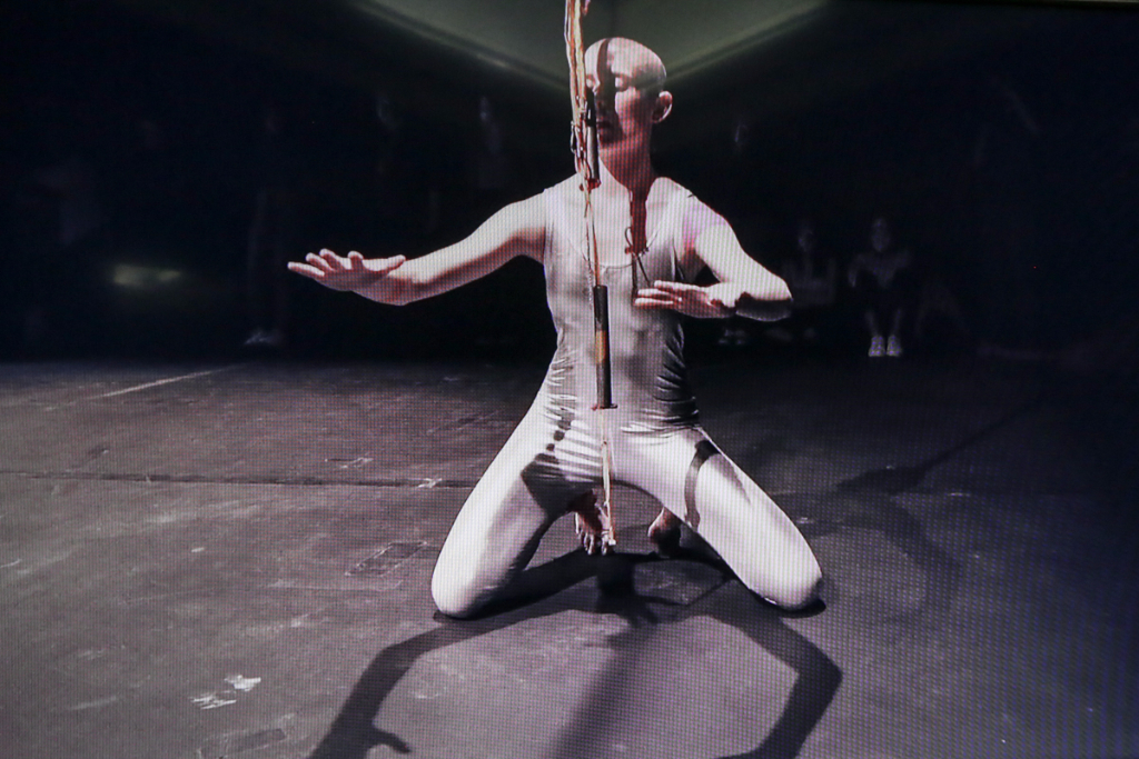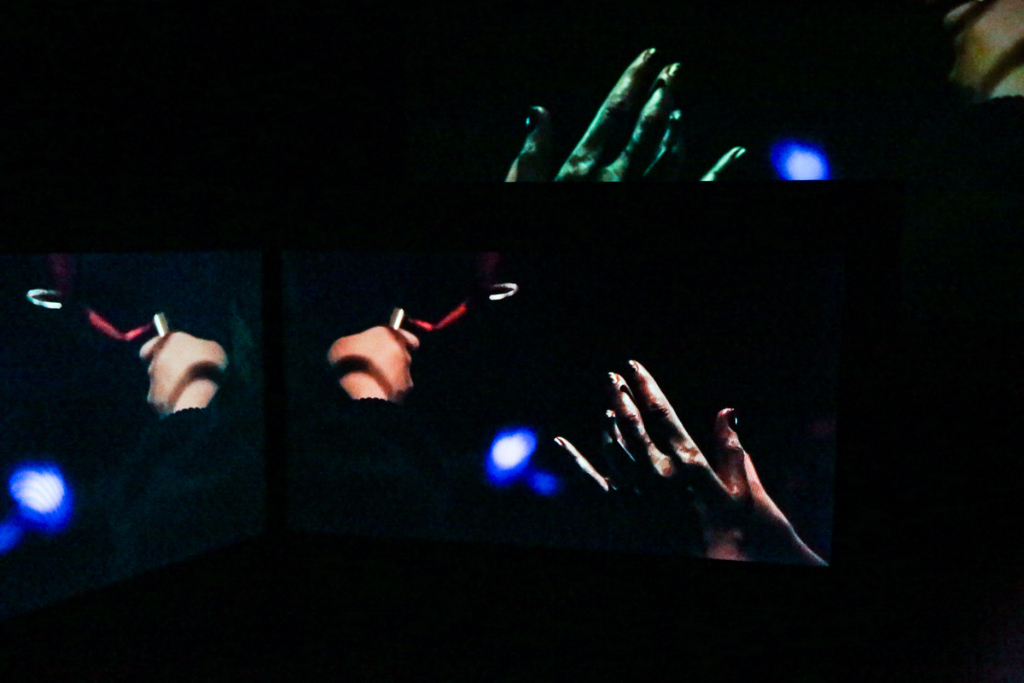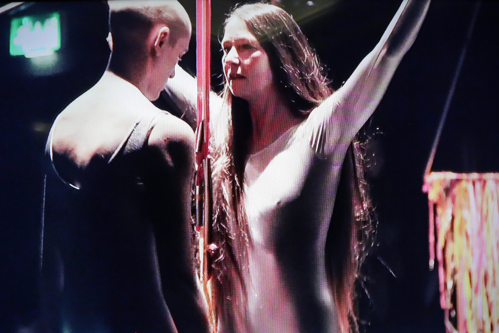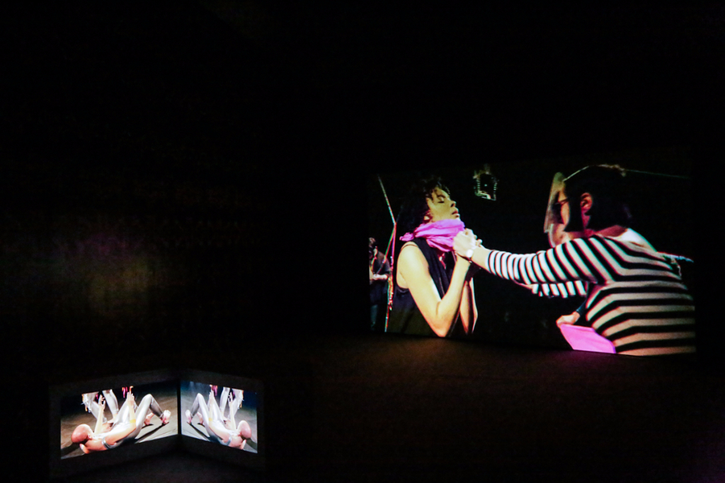 Boyce’s We Move In Her Way is a multimedia presentation of the moving form. Dancers in her installation make childish and playful movements – many of them are masked or wearing tight silver spandex and spontaneously break out into fervent clapping. The videos are on loop in two separate rooms, with each screen displaying a specific area of the stage, which requires the viewer to actively move around to experience each aspect of Boyce’s piece. It’s odd, but also highly interactive. The work is actually a documentation of an initial live performance, where the audience could participate alongside the performers and follow an improvised pattern free from constraint.