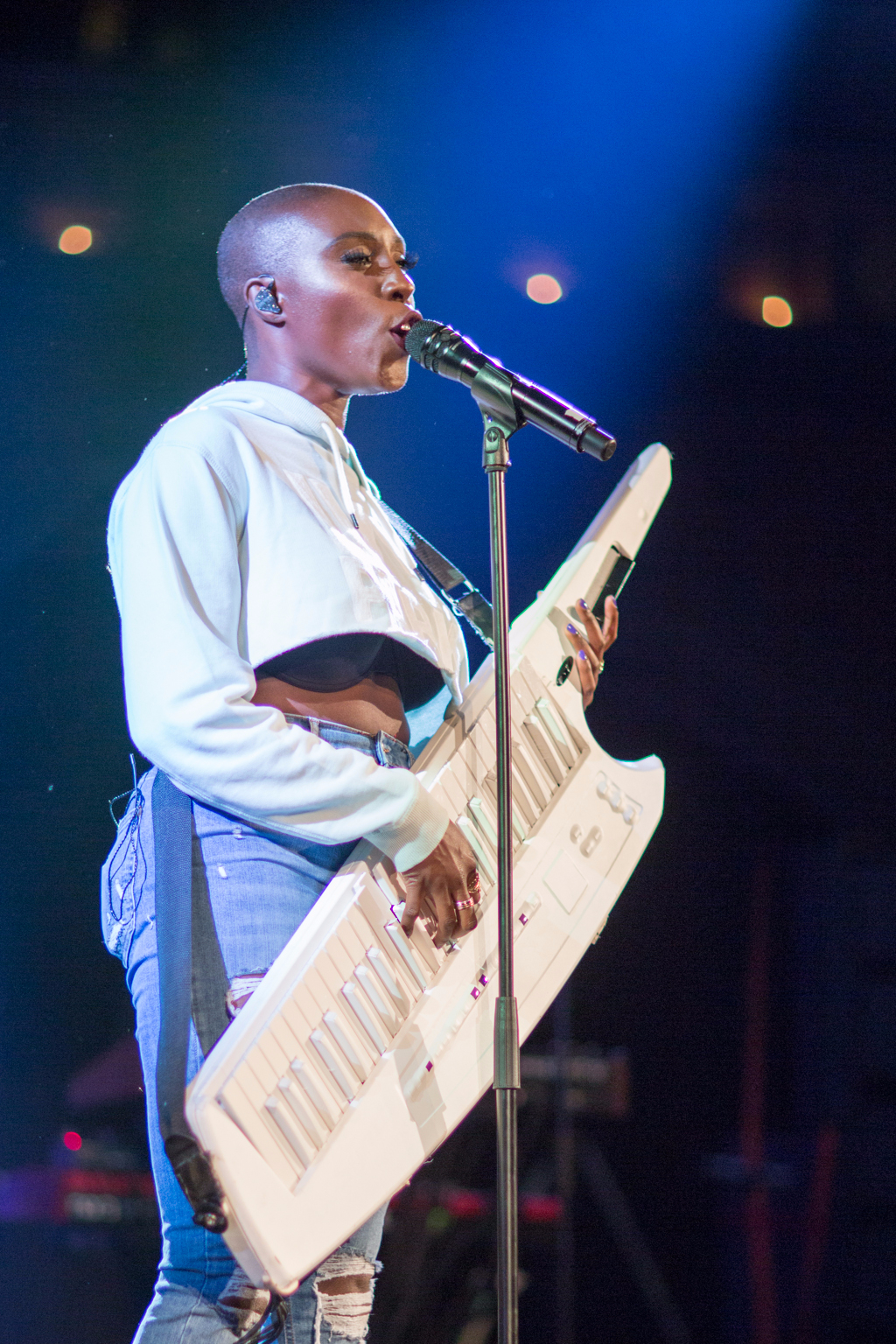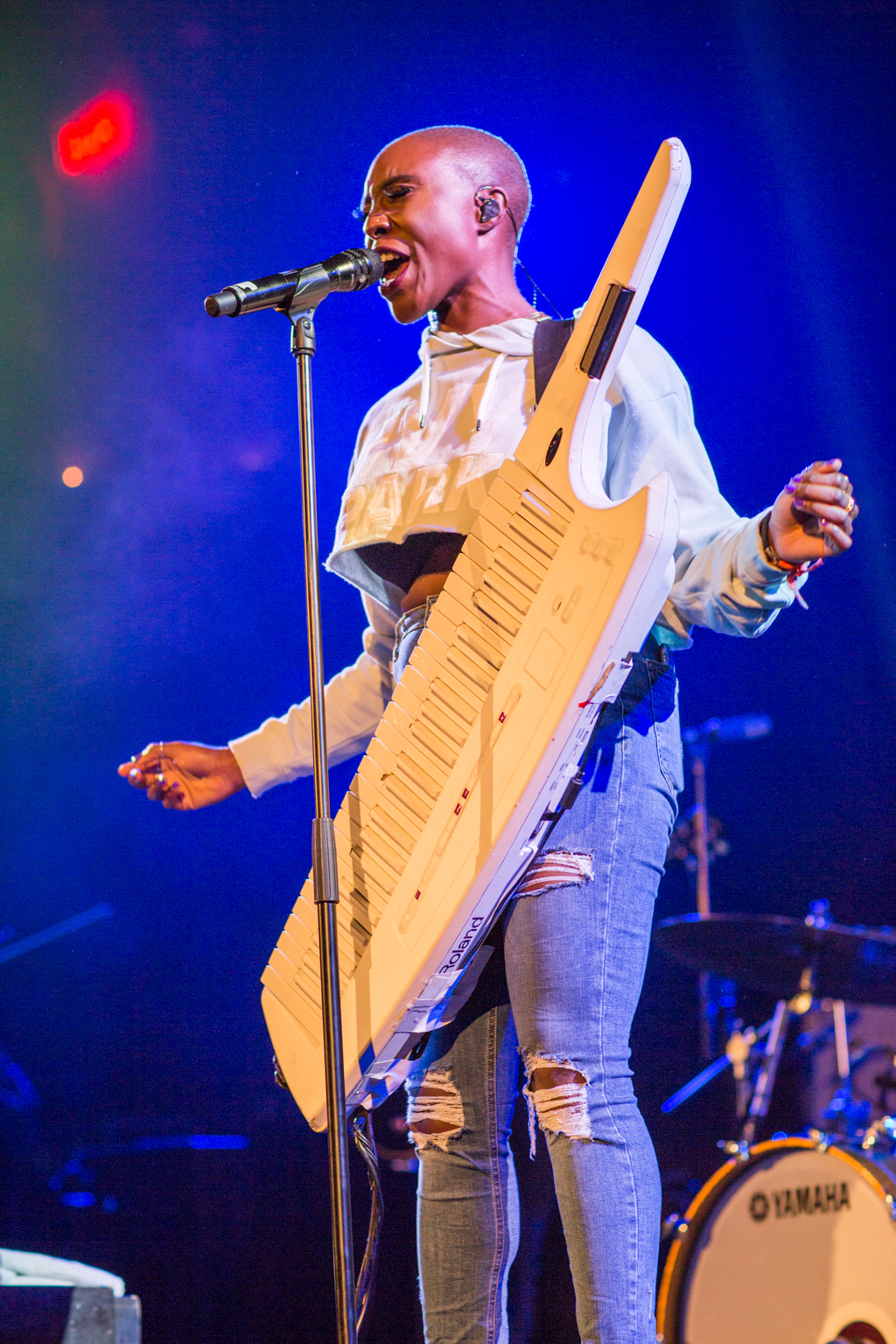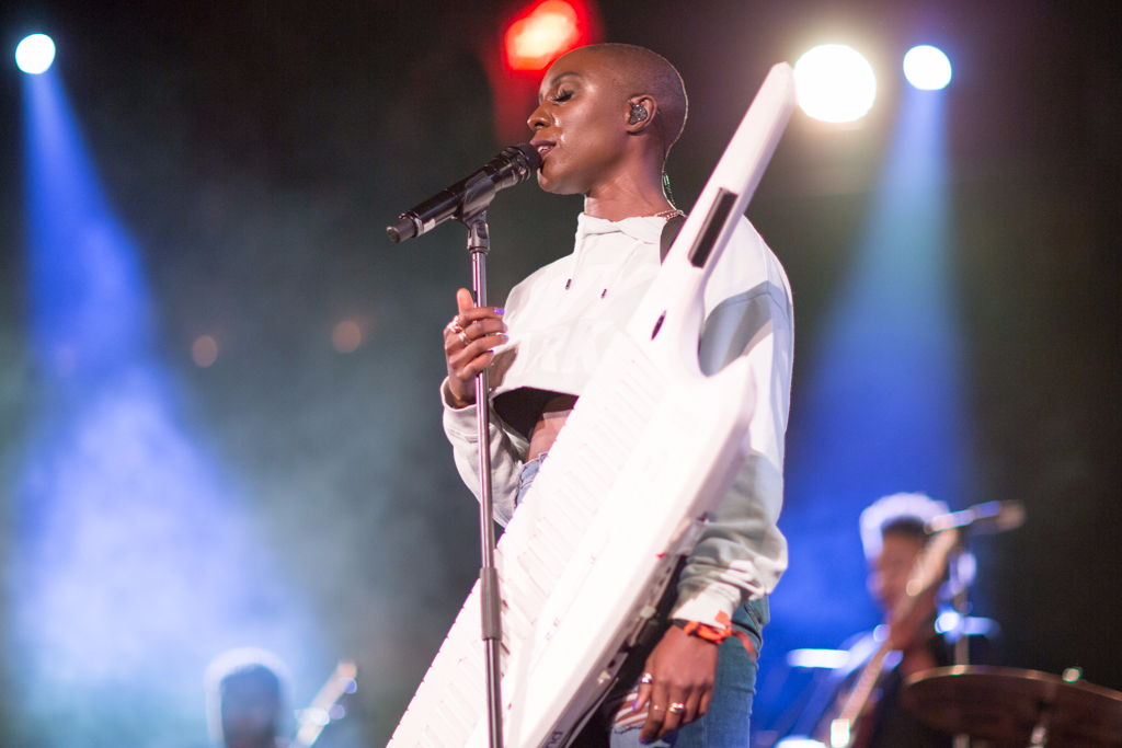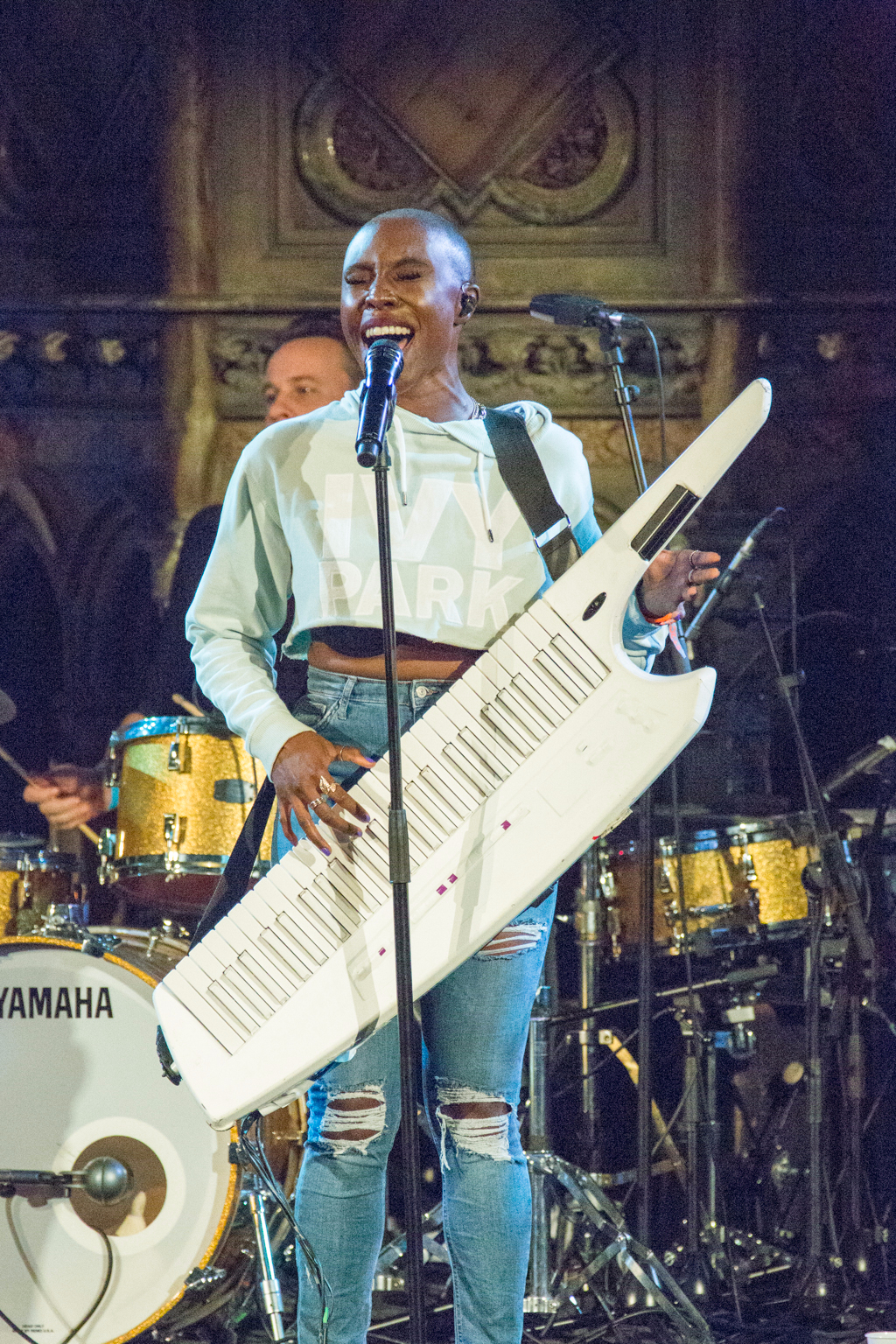 But it was Laura Mvula who stole the show. In the unique setting, it was not only her mesmeric vocals that captured the collective imaginations of those present but her looming personality and infectious warmth. Kicking off her unwearable white platforms, she owned the stage like a second home in bare feet, ripped jeans, an Ivy Park cut-off hoodie with an enormous white “keytar” across her front. Euphoric tracks such as Flying Without You were introduced in the context of “in a world where a guy with a big orange face and yellow hair rules most of the world, this song – and concerts like this – reminds me we can make something beautiful out of chaos”. She dedicated People to the new President himself and Kiss My Feet to the guy who ghosted her for a BAFTA party. Green Garden had everyone up on their feet while 2013 album track Sing to the Moon, played especially for her mum, was nothing less than ethereal, embodying all that is unique about Mvula’s music – experimental yet melodic, simple yet rich, with an upbeat Bjork-like quality. The Birmingham lass and her band – the cellist and guitarist/violinist her obliging siblings – left the fundraiser on just the right note: filled with emotion yet determinedly positive.