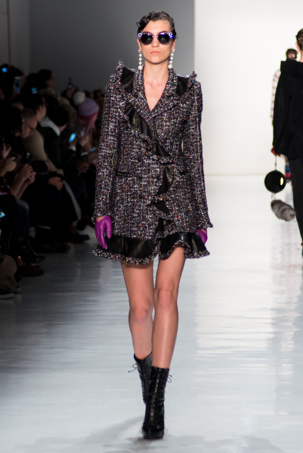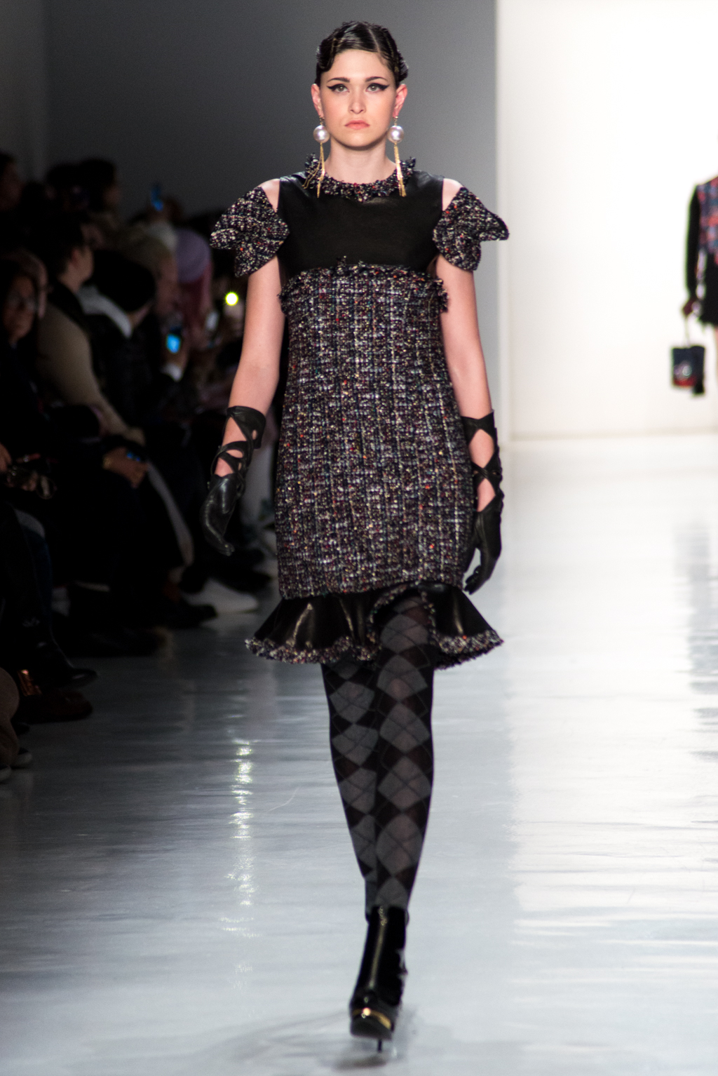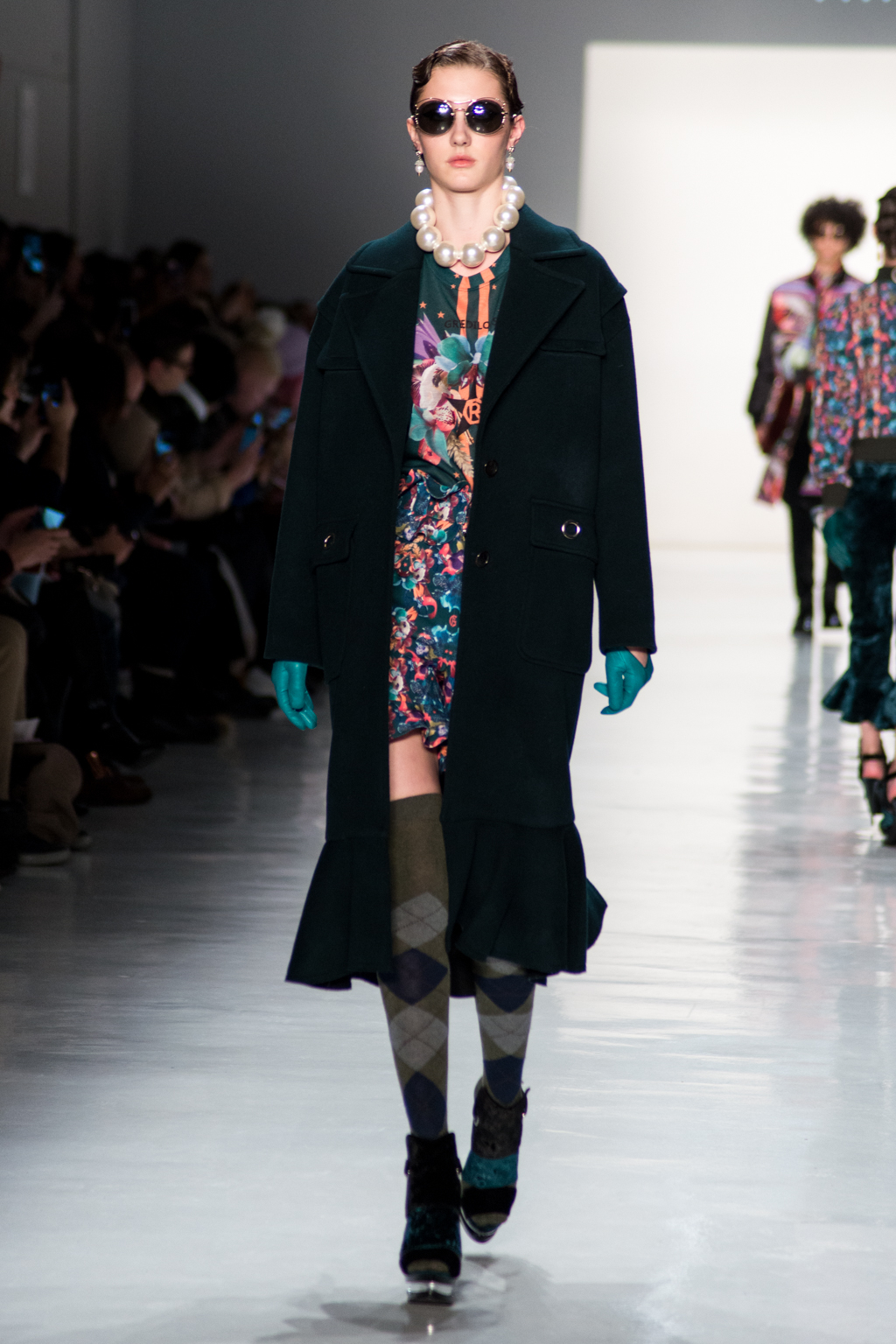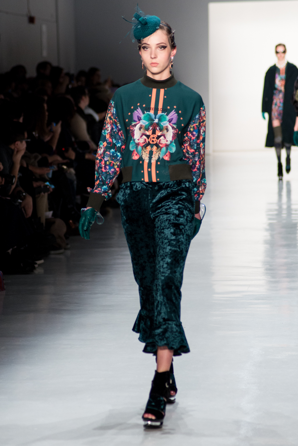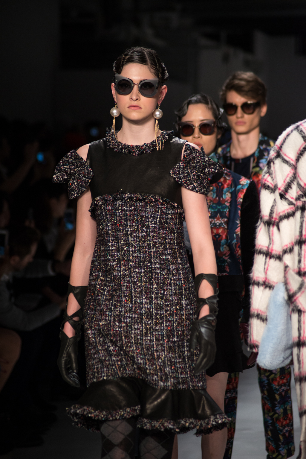 The collection by Greedilous strongly referenced Chanel, taking many of the storied house’s hallmarks and amping them up in an intentionally over-the-top manner. As the show progressed, they began to put an increasingly street-style spin on the iconic brand making it truly their own. Tweeds and dark colors were prevalent in the beginning of the show; these pieces made it clear that the Greedilous could make technically beautiful clothing. After showing the mastery of the classics, the designer branched out into more modern shapes punctuated with bright colours proving that modern designs and classical techniques can coexist in a contemporary brand.