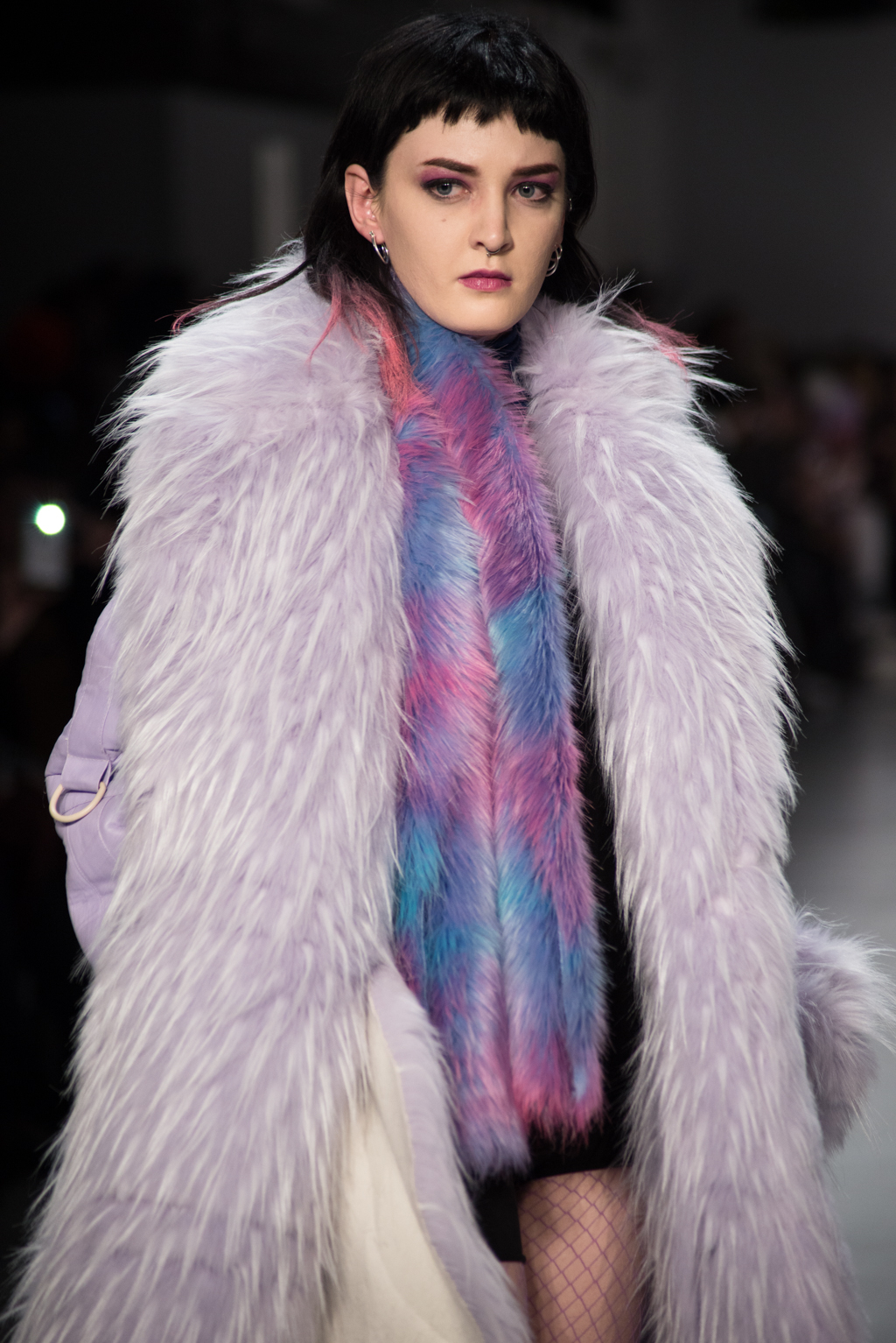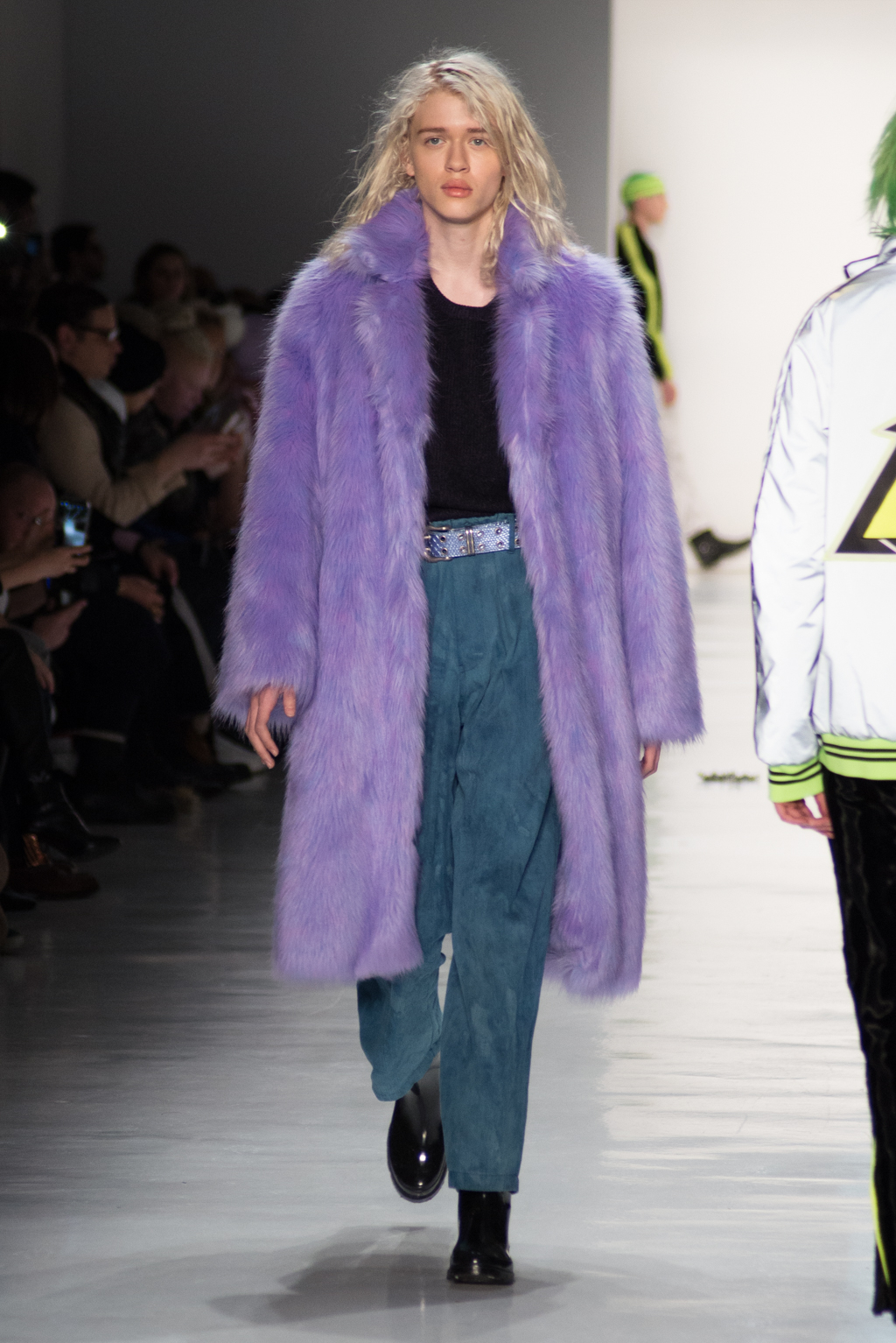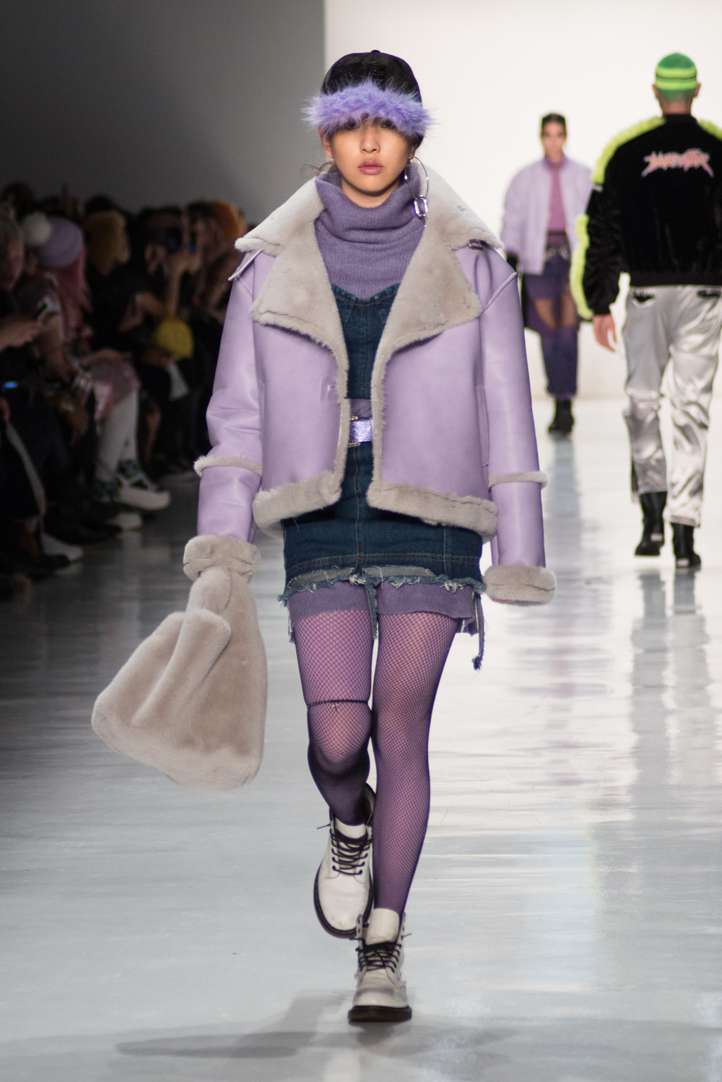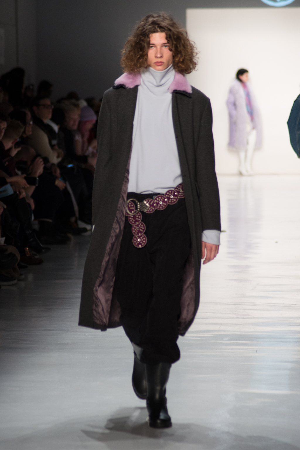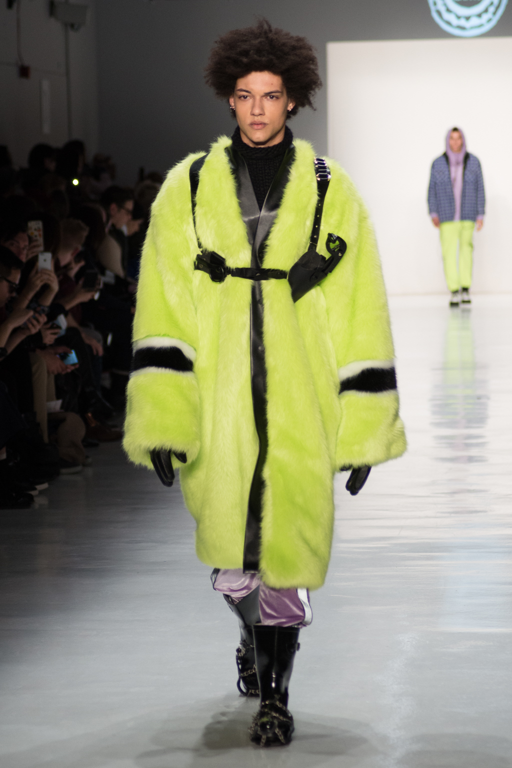 Kimmy J’s brand showed a collection that was rooted in the outsider esthetic. The show had a sporty skater look as well as reference to grunge culture. The brand played with proportions especially with their oversized outerwear that was a theme in both their men’s and womenswear looks. Accesories like chain belts and fishnets played off the soft look of the bright faux fur that the designer used and helped the collection keep a hard, boundary-pushing edge.