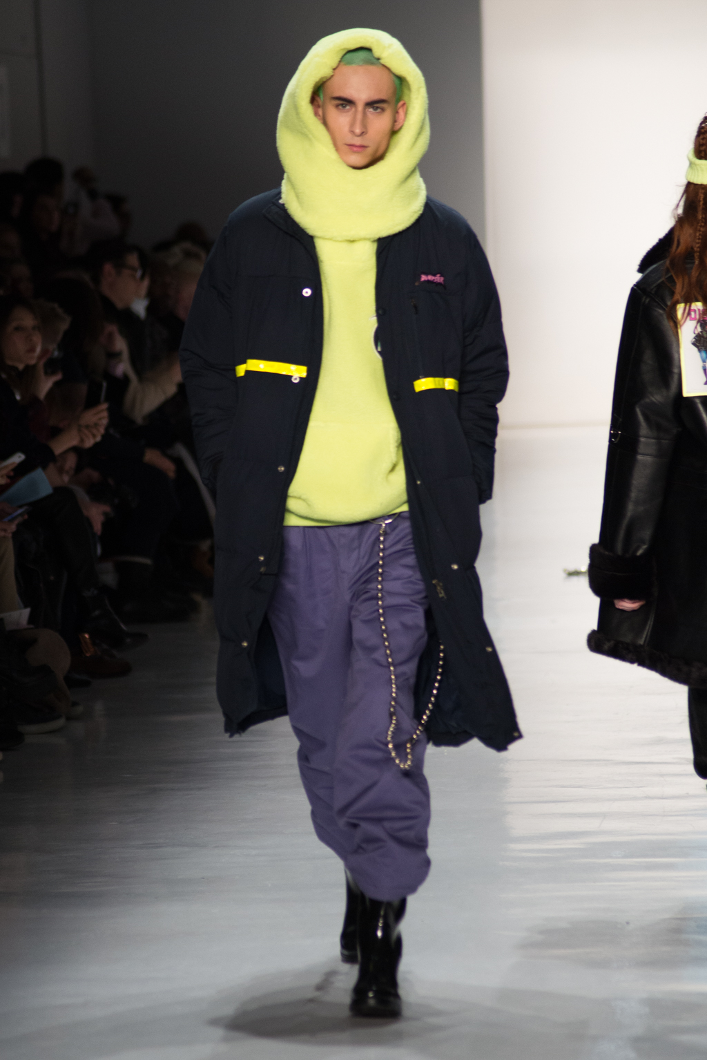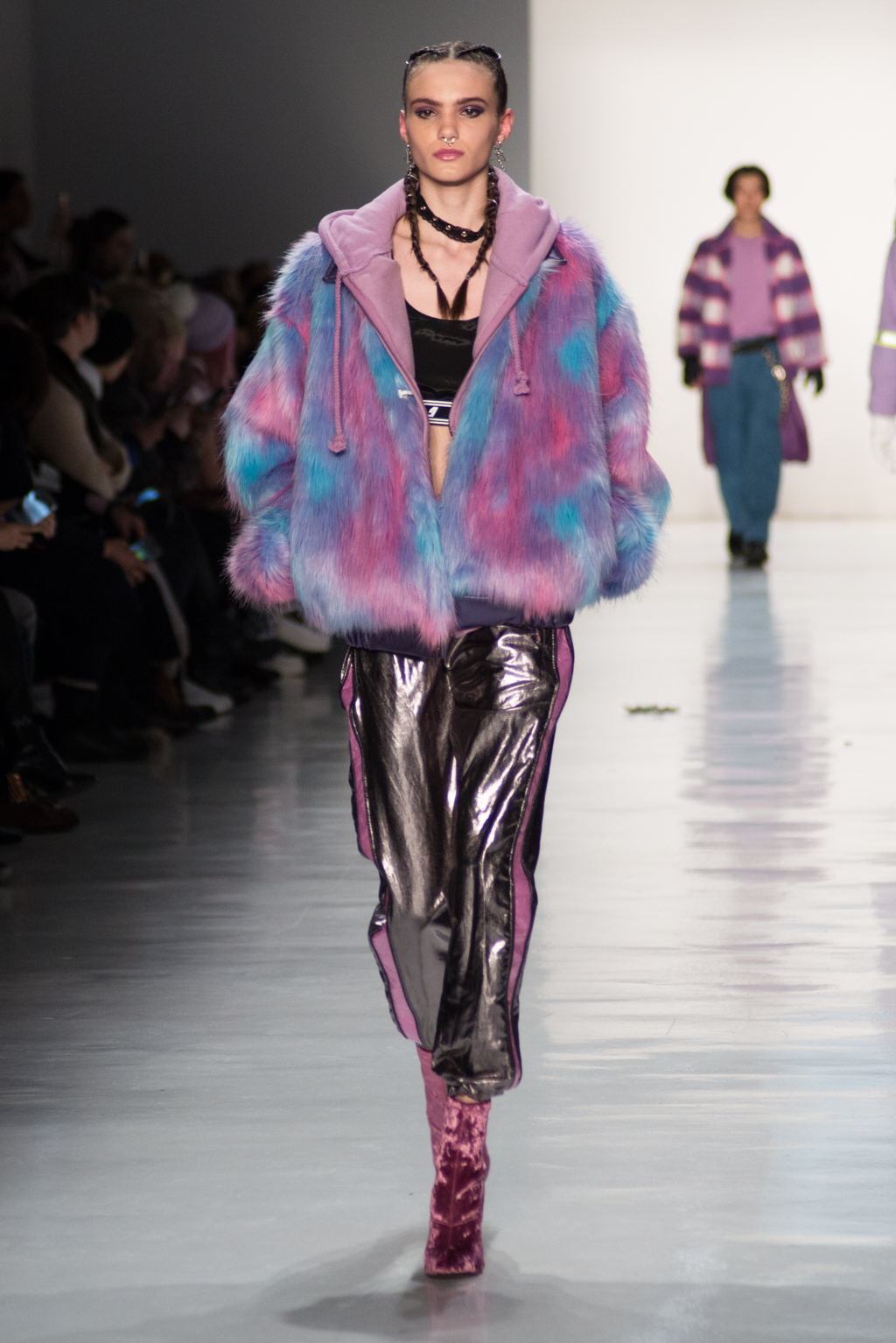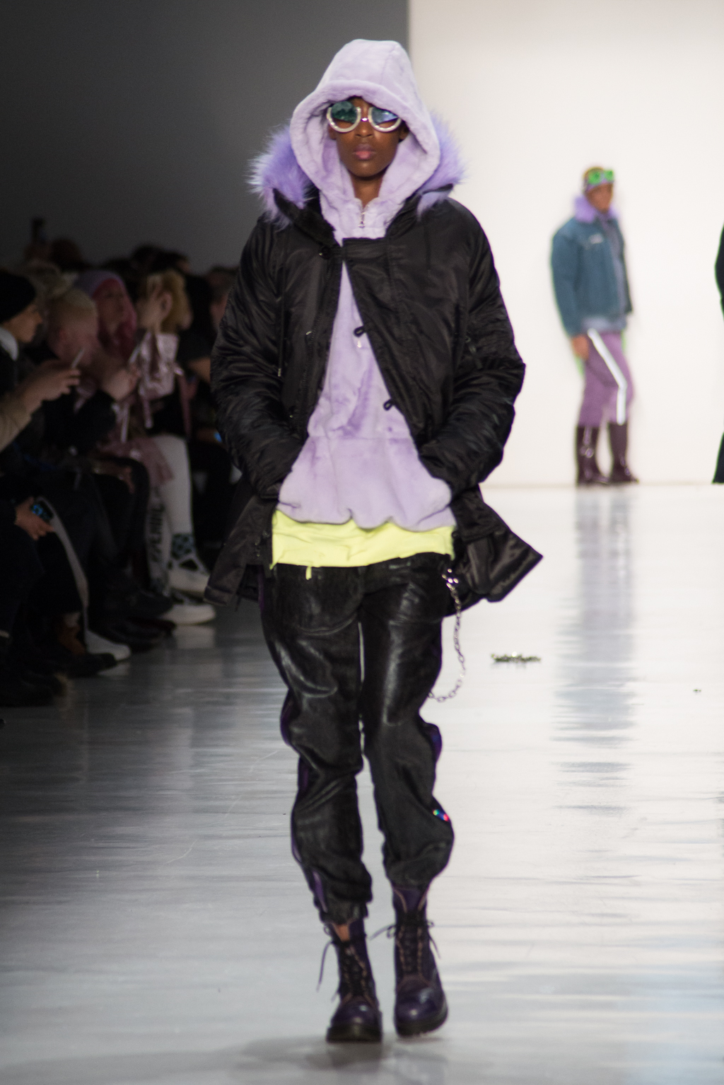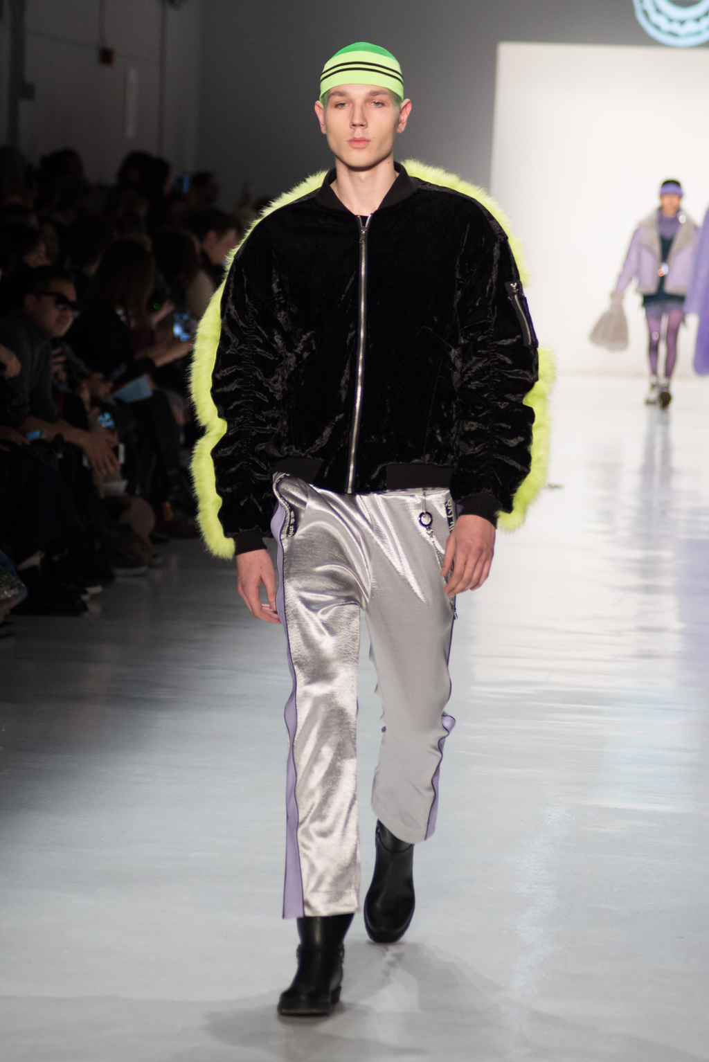 Kimmy J’s brand showed a collection that was rooted in the outsider esthetic. The show had a sporty skater look as well as reference to grunge culture. The brand played with proportions especially with their oversized outerwear that was a theme in both their men’s and womenswear looks. Accesories like chain belts and fishnets played off the soft look of the bright faux fur that the designer used and helped the collection keep a hard, boundary-pushing edge.
