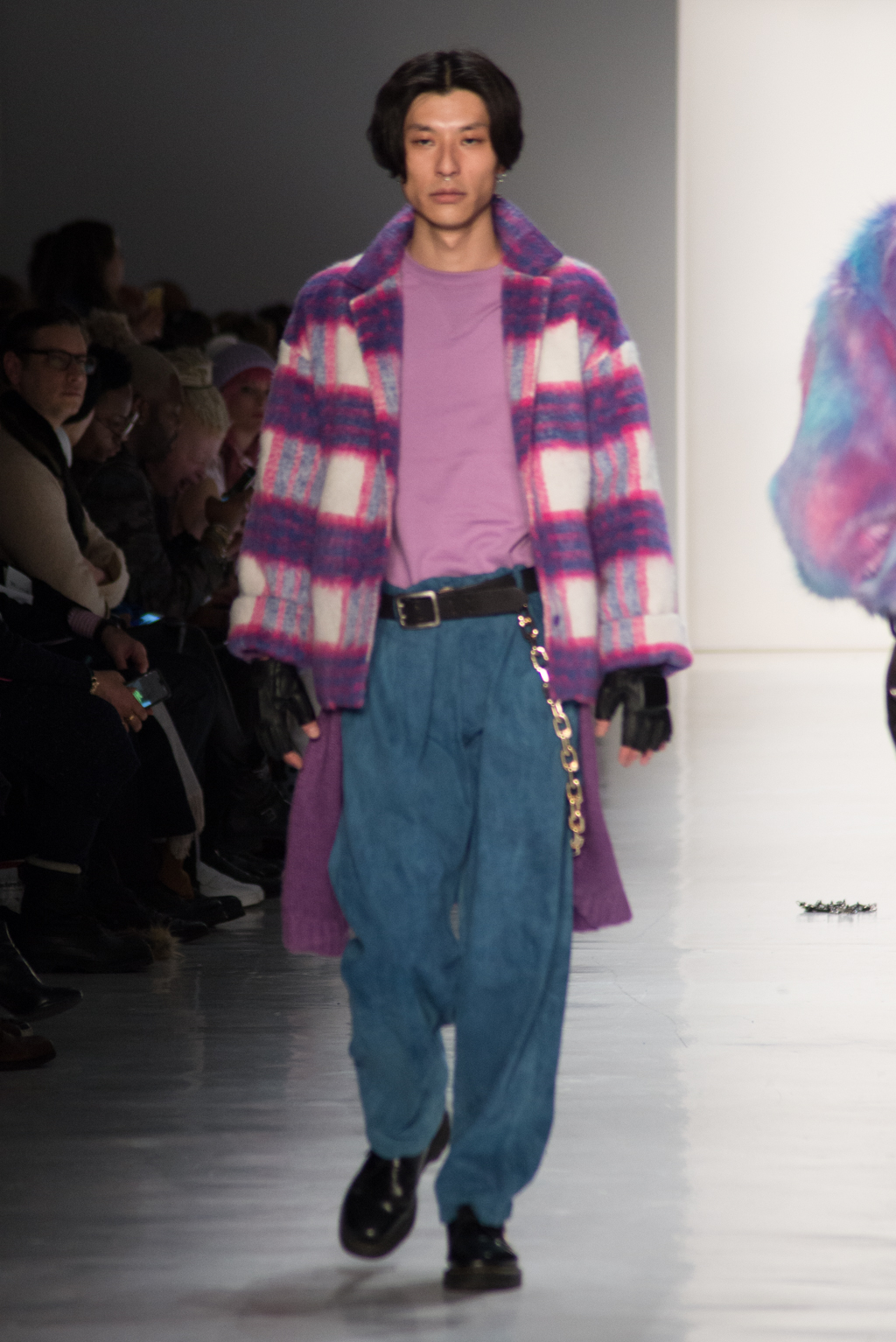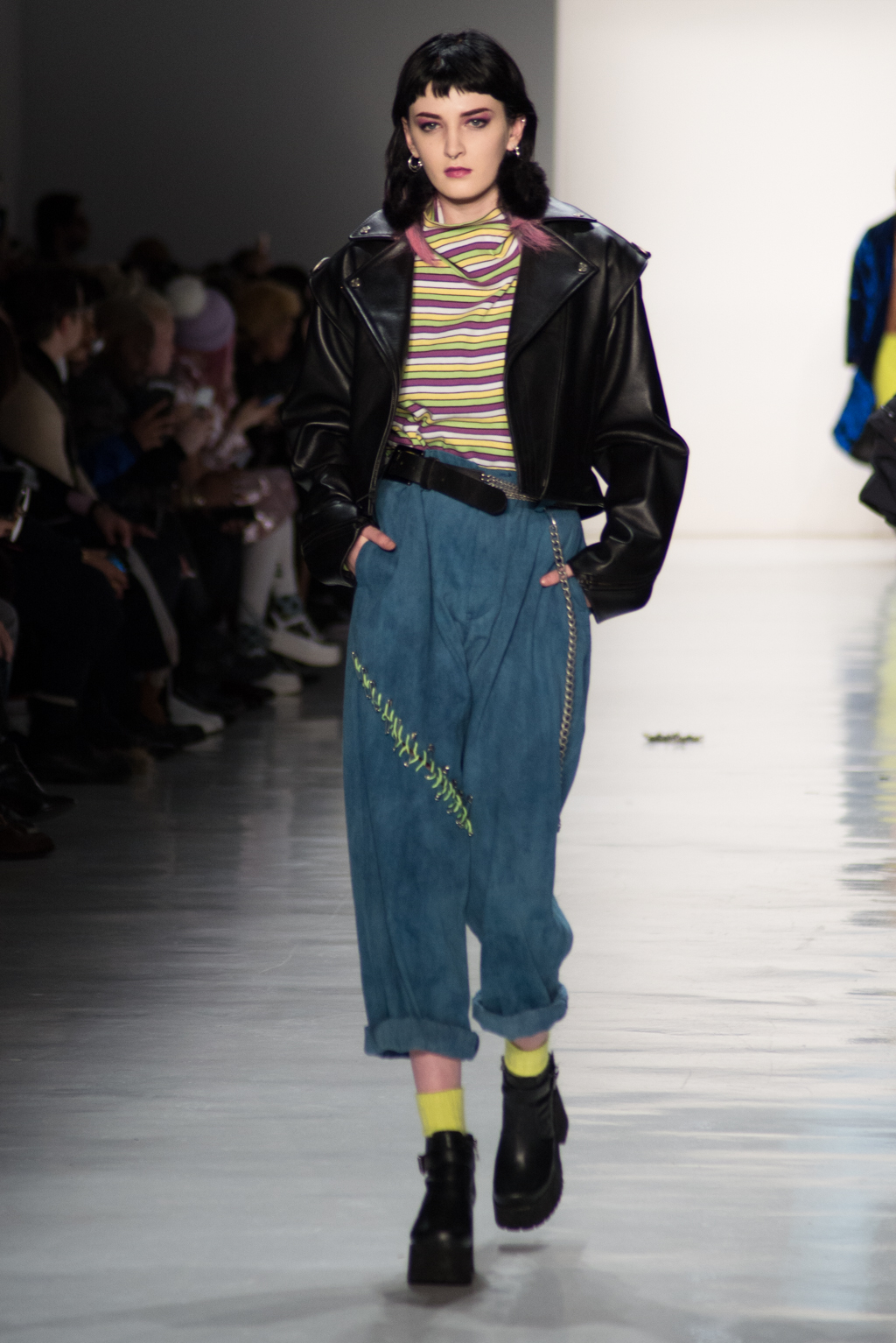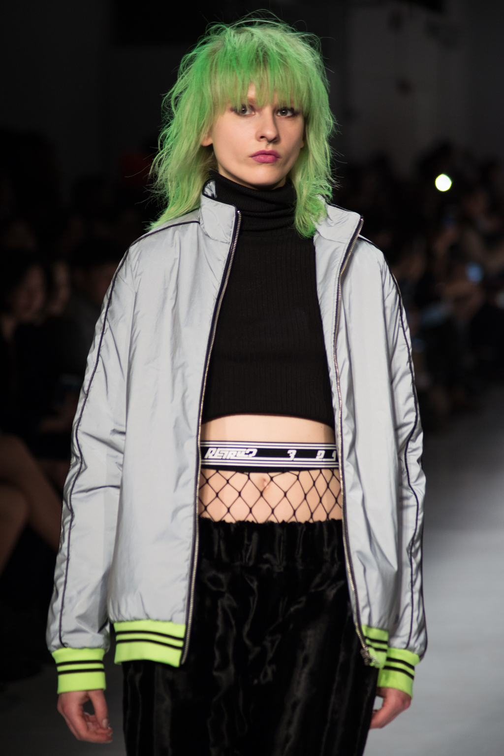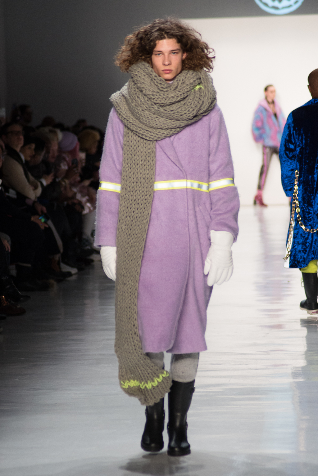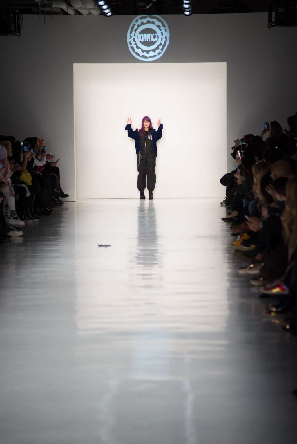 Kimmy J’s brand showed a collection that was rooted in the outsider esthetic. The show had a sporty skater look as well as reference to grunge culture. The brand played with proportions especially with their oversized outerwear that was a theme in both their men’s and womenswear looks. Accesories like chain belts and fishnets played off the soft look of the bright faux fur that the designer used and helped the collection keep a hard, boundary-pushing edge.