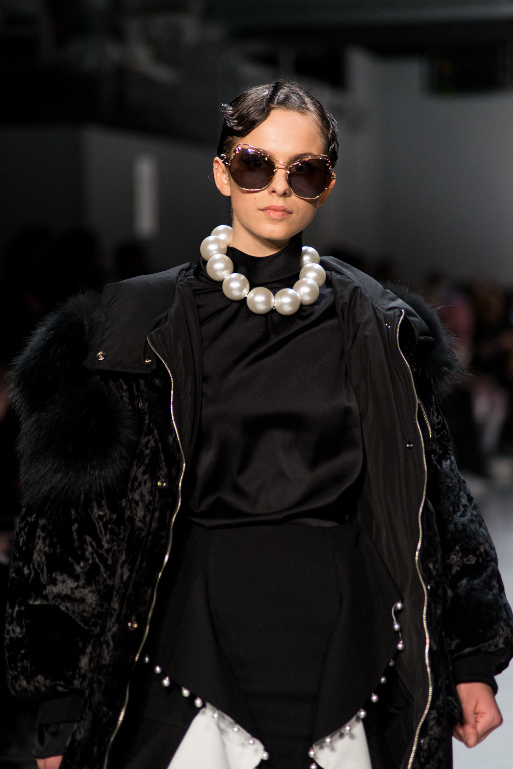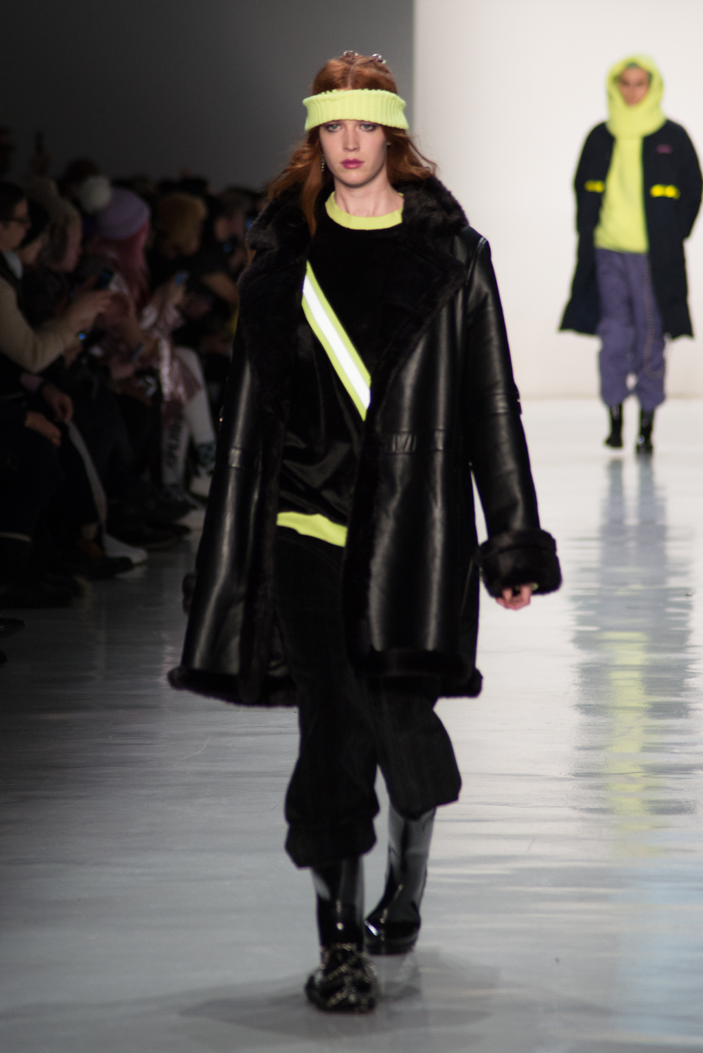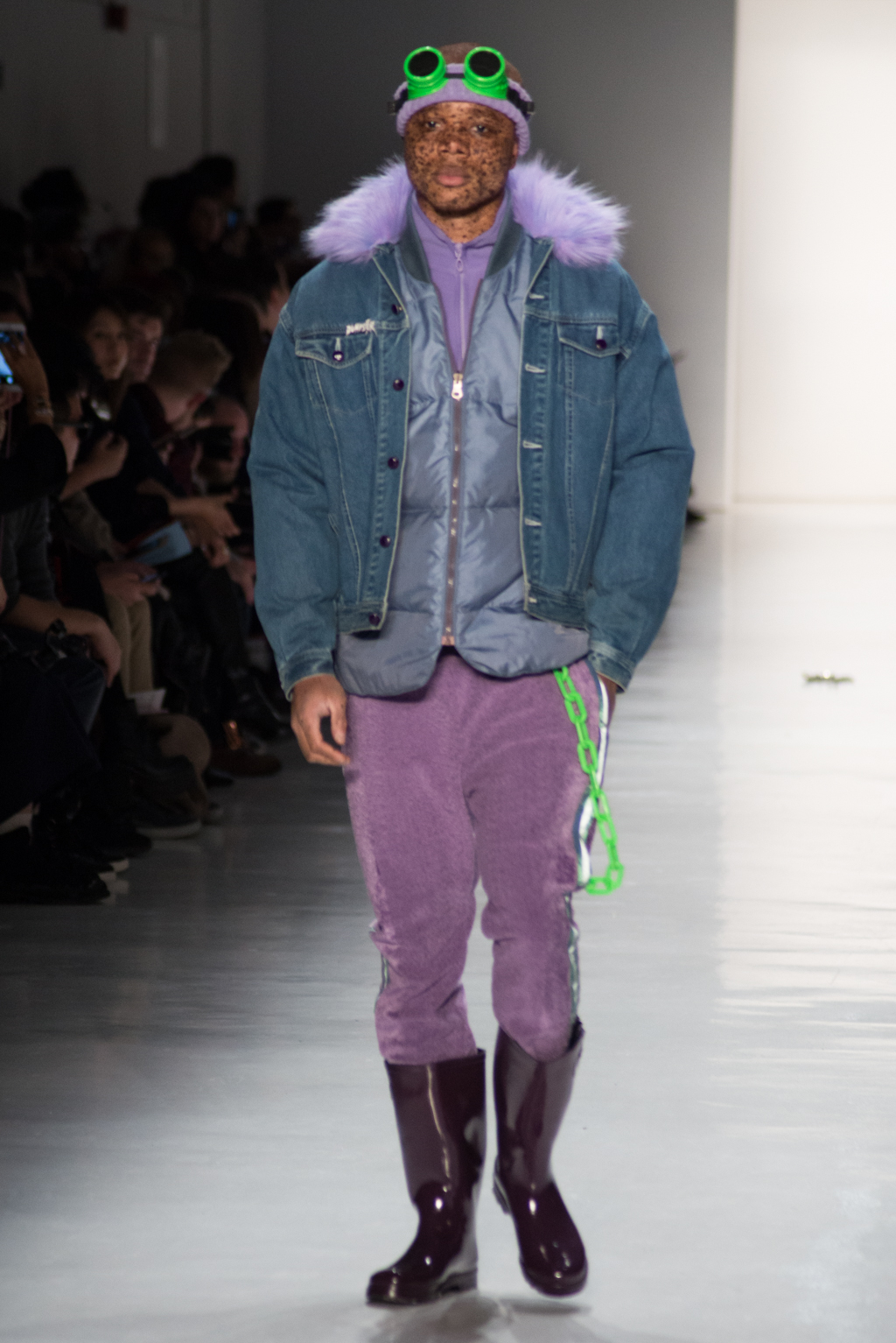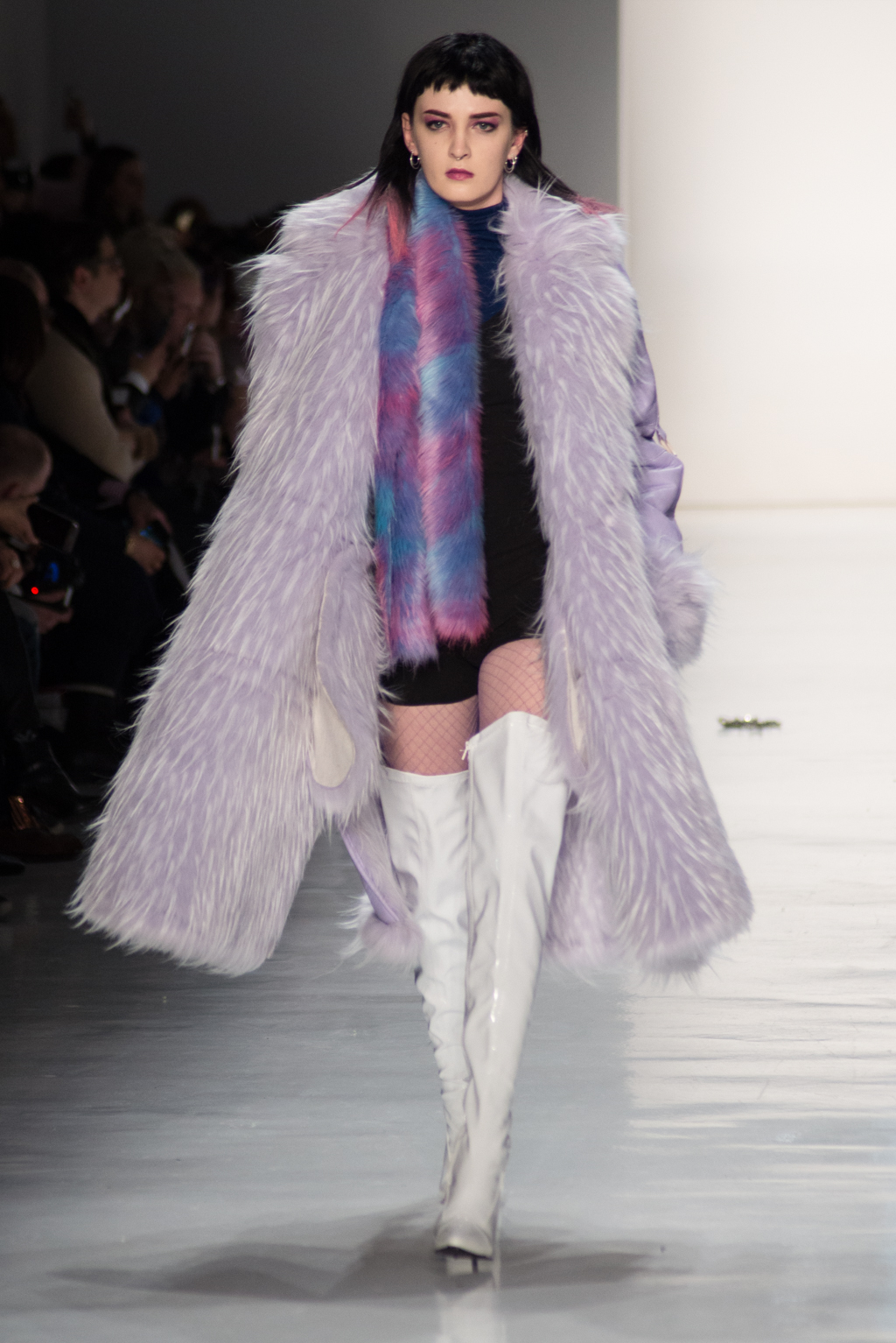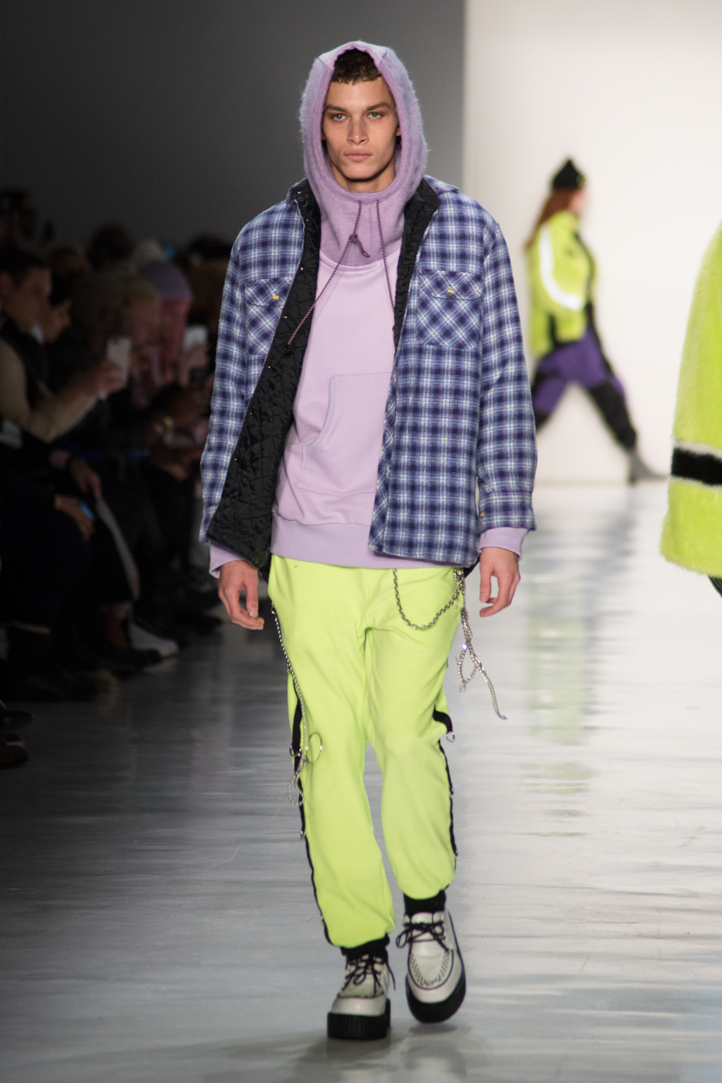 Kimmy J’s brand showed a collection that was rooted in the outsider esthetic. The show had a sporty skater look as well as reference to grunge culture. The brand played with proportions especially with their oversized outerwear that was a theme in both their men’s and womenswear looks. Accesories like chain belts and fishnets played off the soft look of the bright faux fur that the designer used and helped the collection keep a hard, boundary-pushing edge.