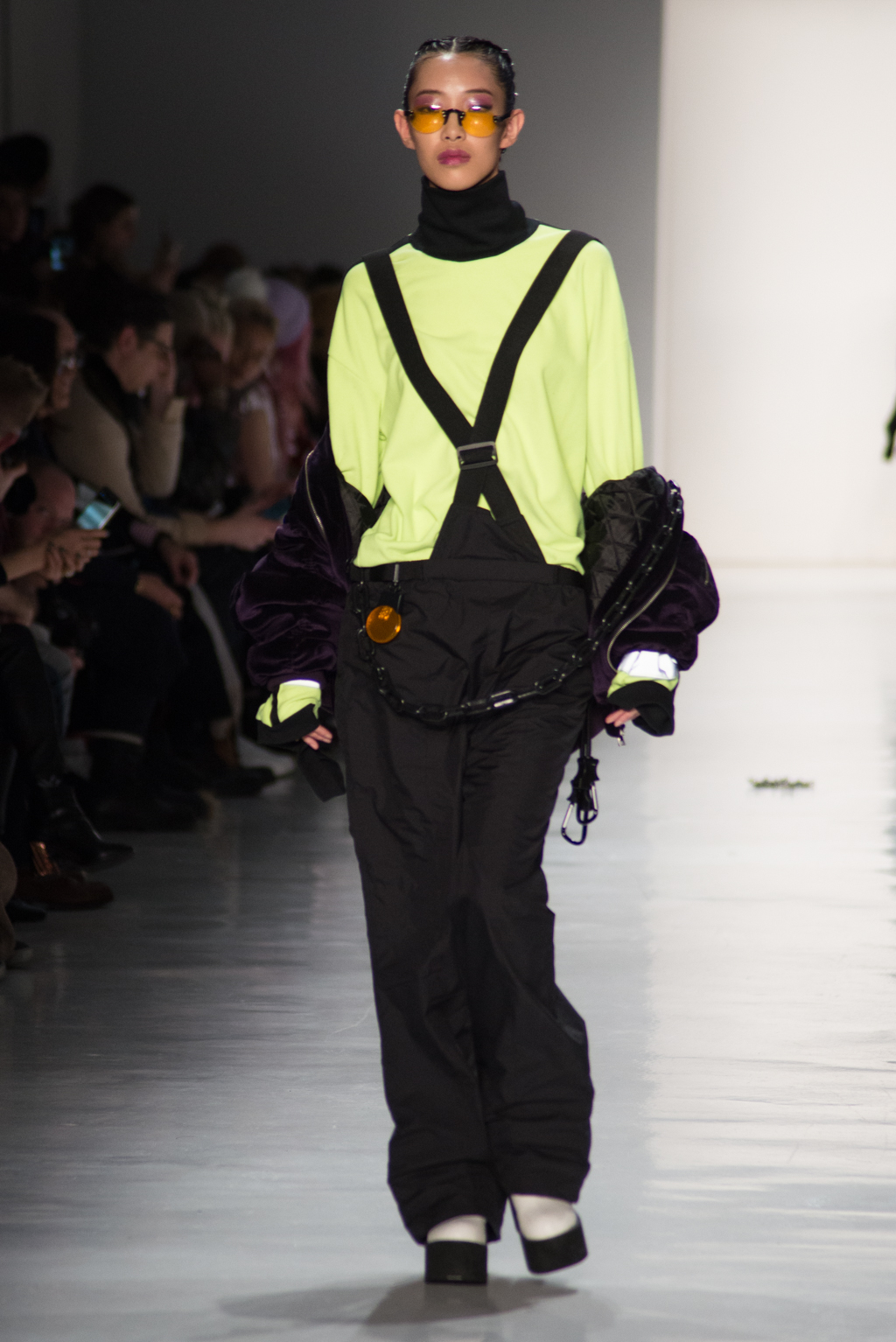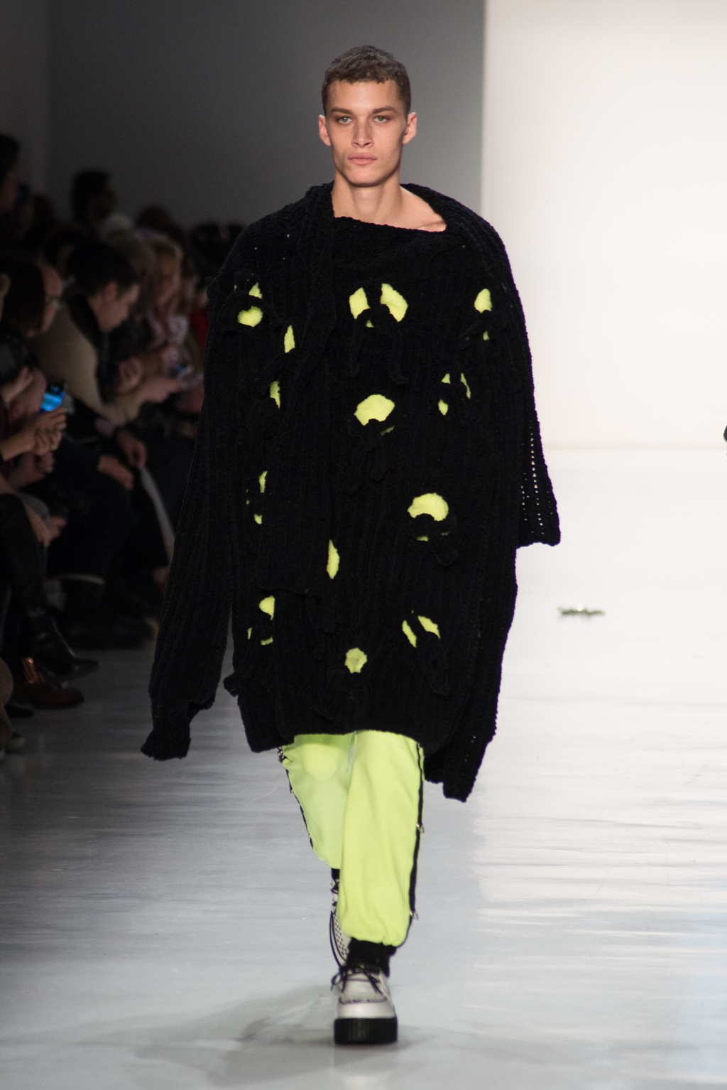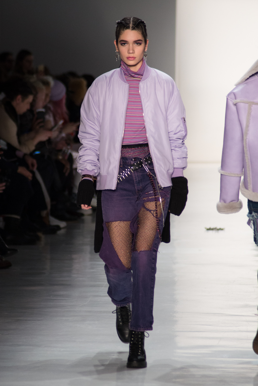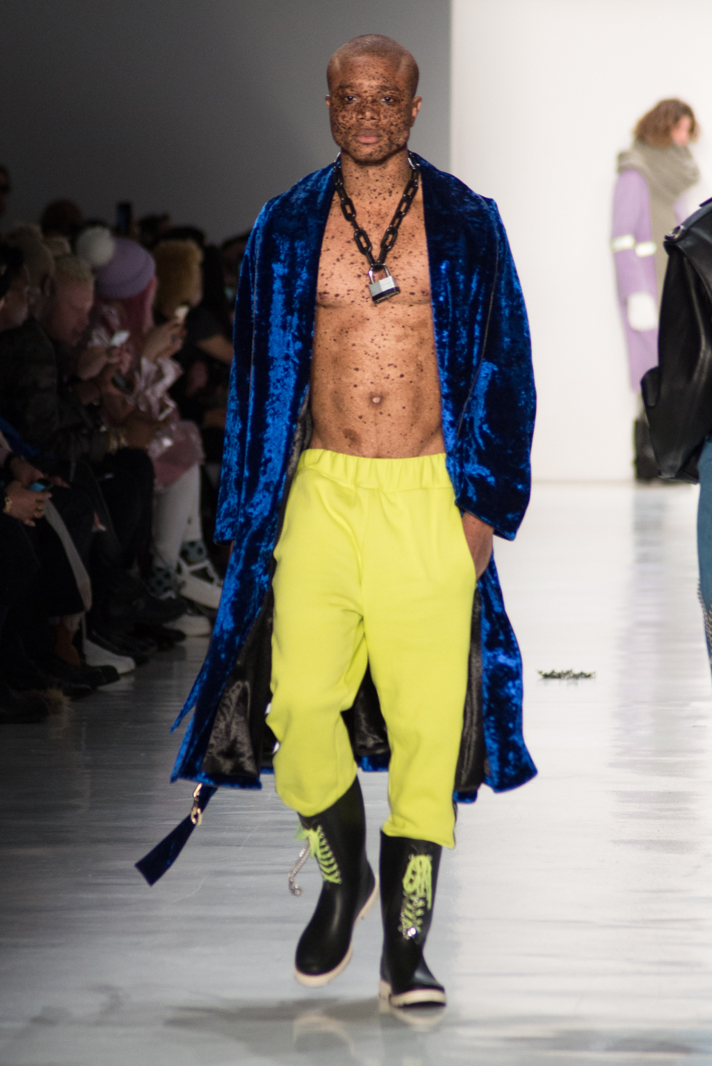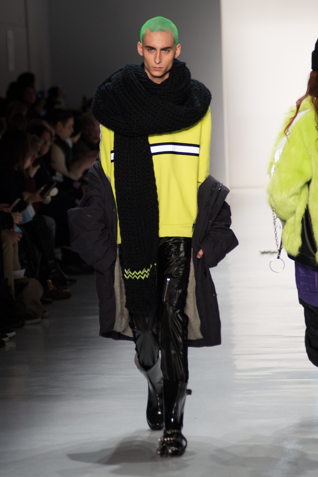 Kimmy J’s brand showed a collection that was rooted in the outsider esthetic. The show had a sporty skater look as well as reference to grunge culture. The brand played with proportions especially with their oversized outerwear that was a theme in both their men’s and womenswear looks. Accesories like chain belts and fishnets played off the soft look of the bright faux fur that the designer used and helped the collection keep a hard, boundary-pushing edge.