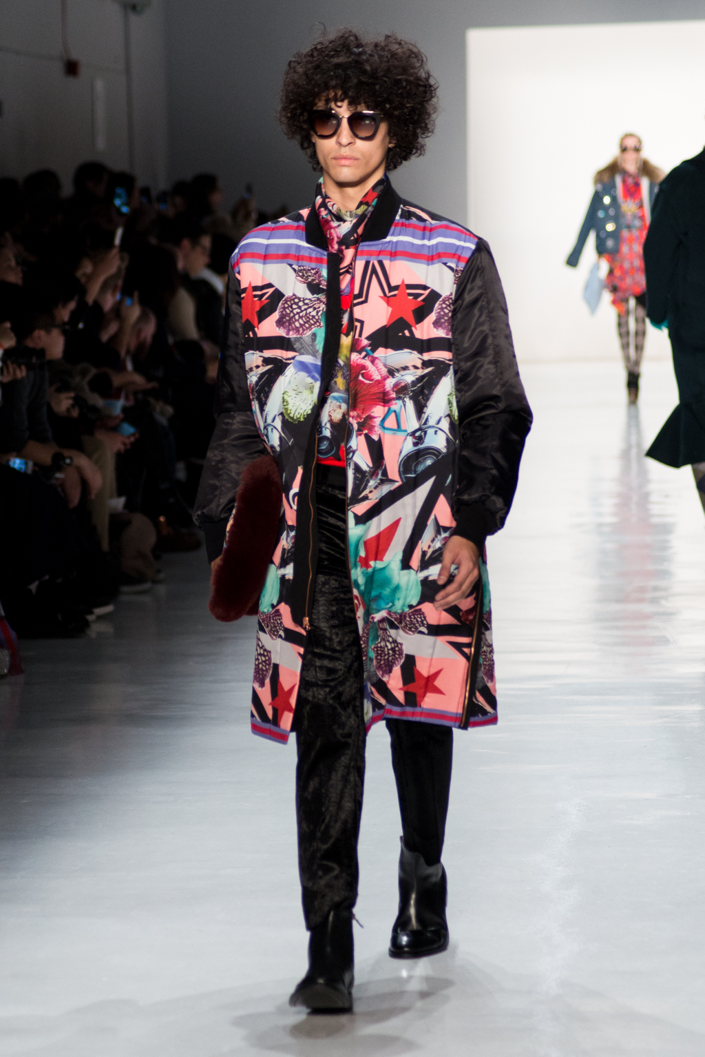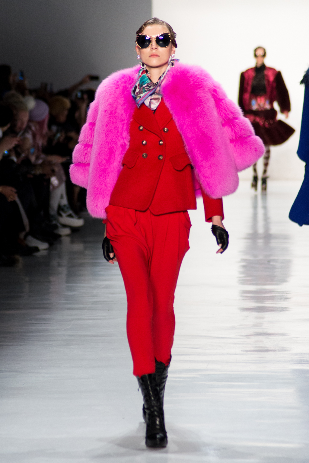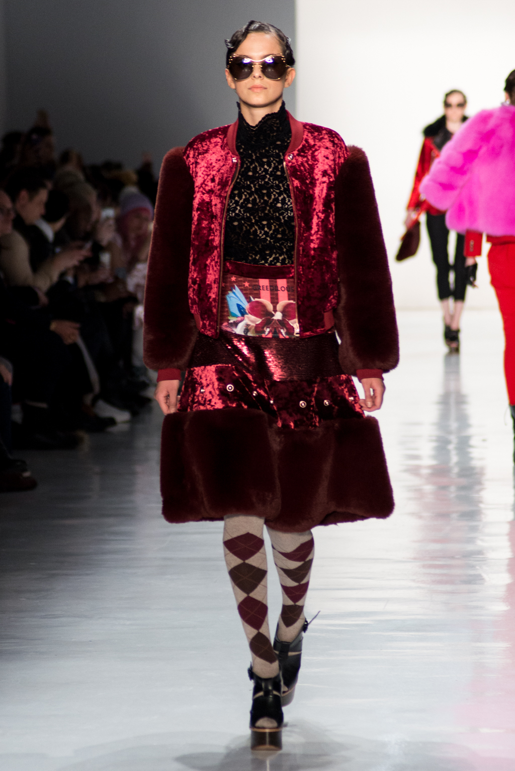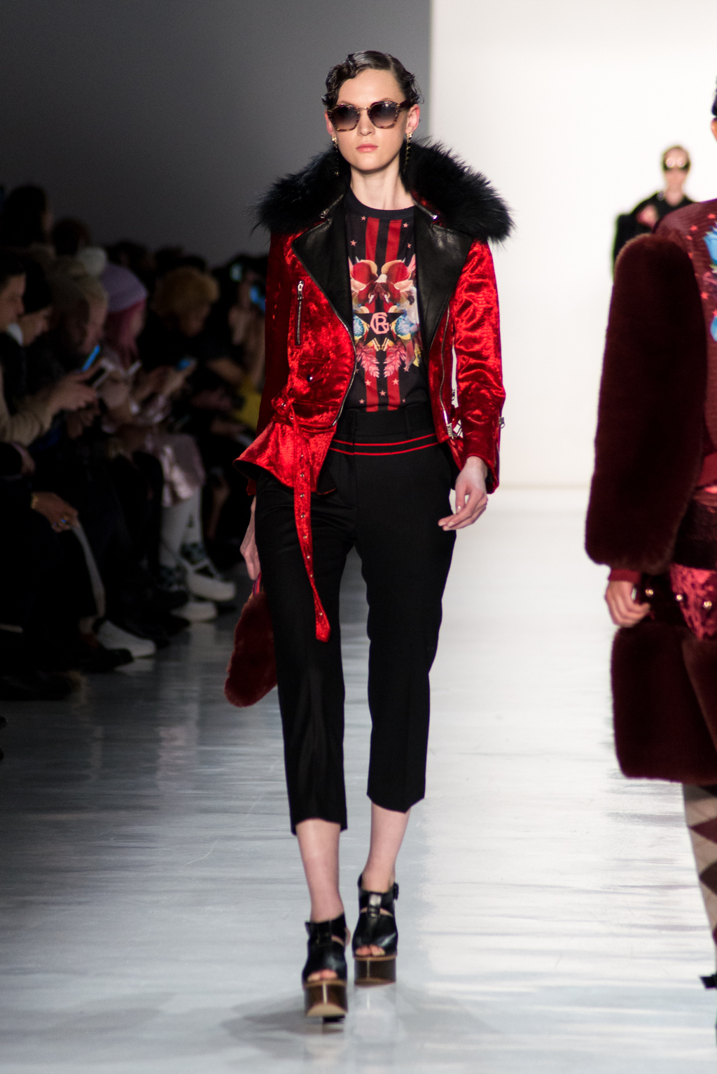 Kimmy J’s brand showed a collection that was rooted in the outsider esthetic. The show had a sporty skater look as well as reference to grunge culture. The brand played with proportions especially with their oversized outerwear that was a theme in both their men’s and womenswear looks. Accesories like chain belts and fishnets played off the soft look of the bright faux fur that the designer used and helped the collection keep a hard, boundary-pushing edge.