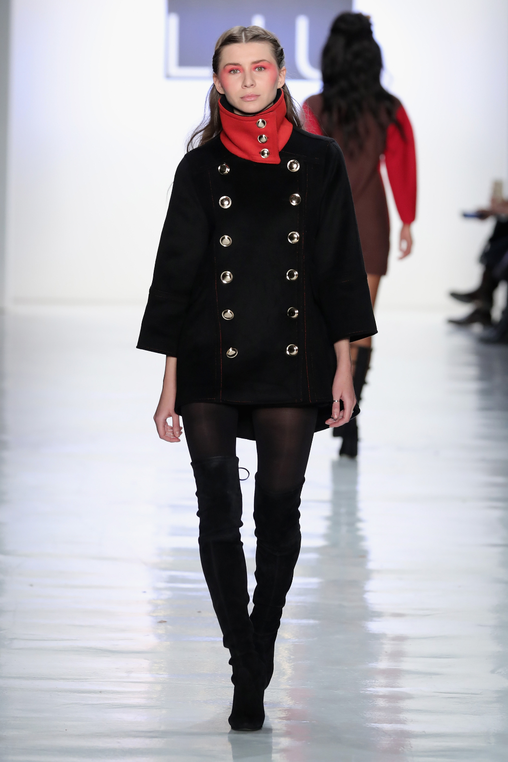 Outerwear was strong and abundant on the Dan Liu runway. Coats for every occasion were shown including an elegant evening cape with a touch of sparkle.