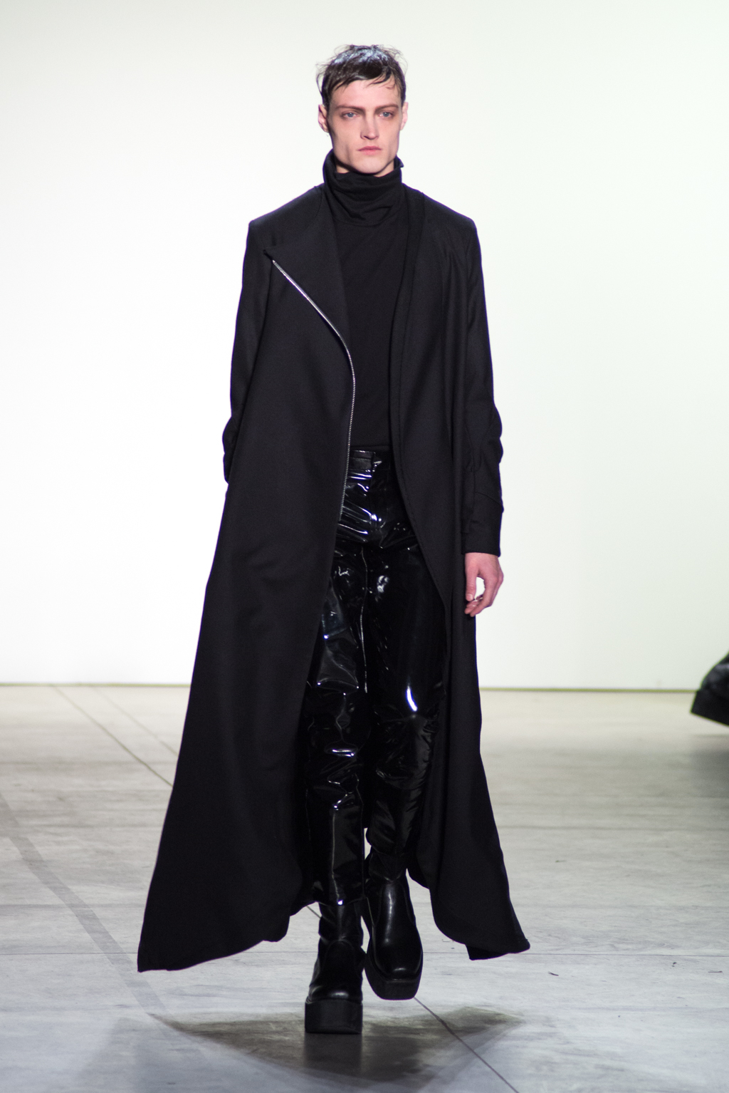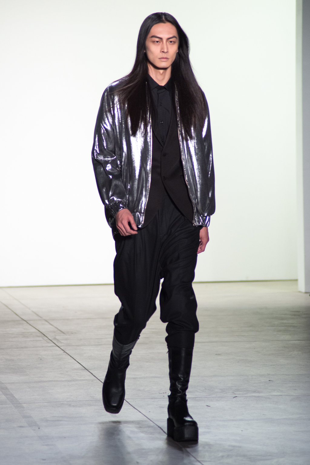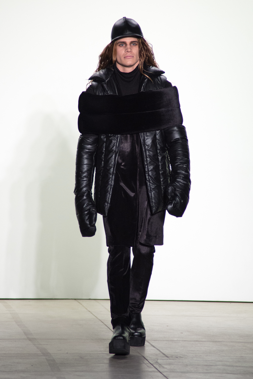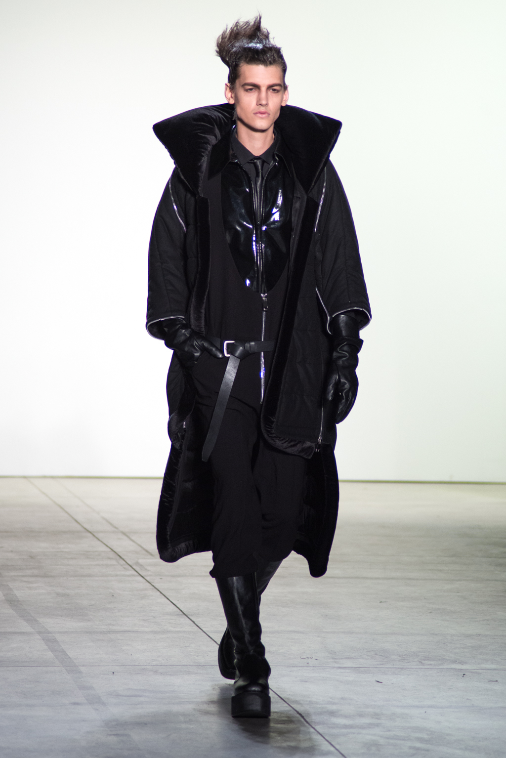 For womenswear, the collection features seen-through tops in metallic seemed fabrics to reveal the under-layer black lingerie. Paired with an oversized puffer coat and knee length boots, the style unites feminine elegance with a domineering aura.