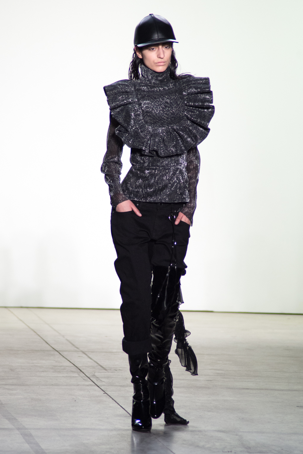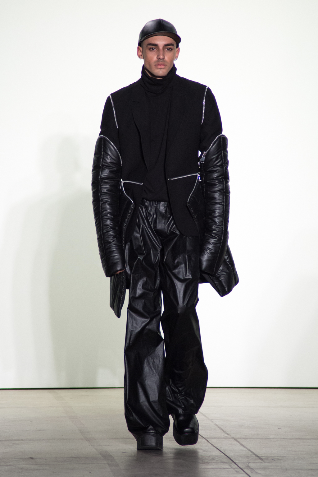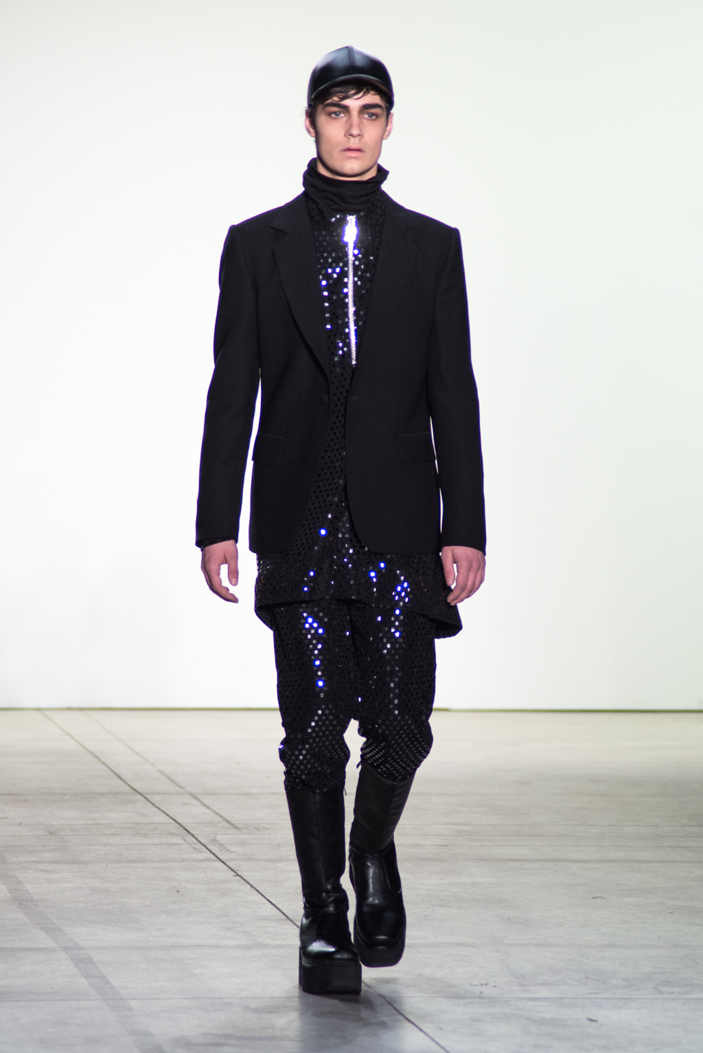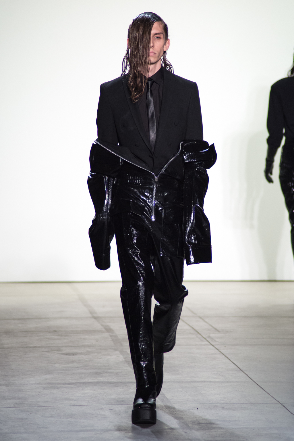 For womenswear, the collection features seen-through tops in metallic seemed fabrics to reveal the under-layer black lingerie. Paired with an oversized puffer coat and knee length boots, the style unites feminine elegance with a domineering aura.