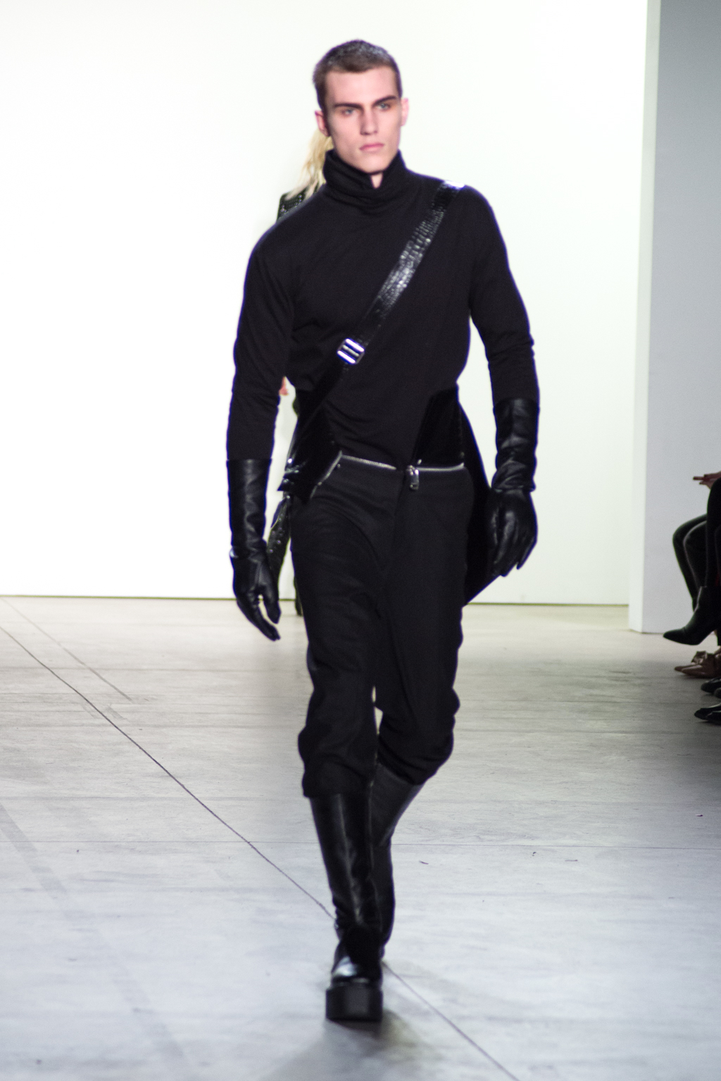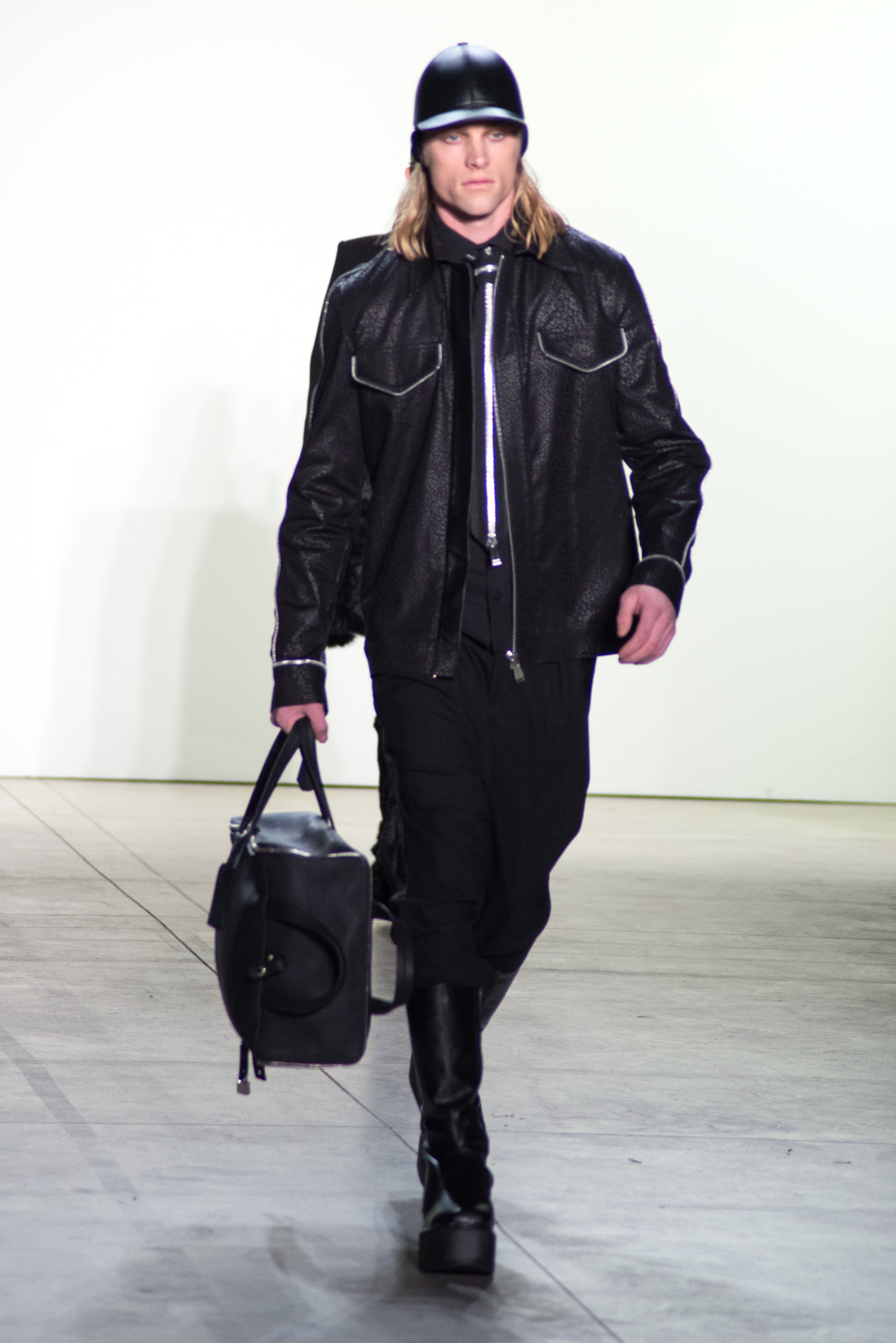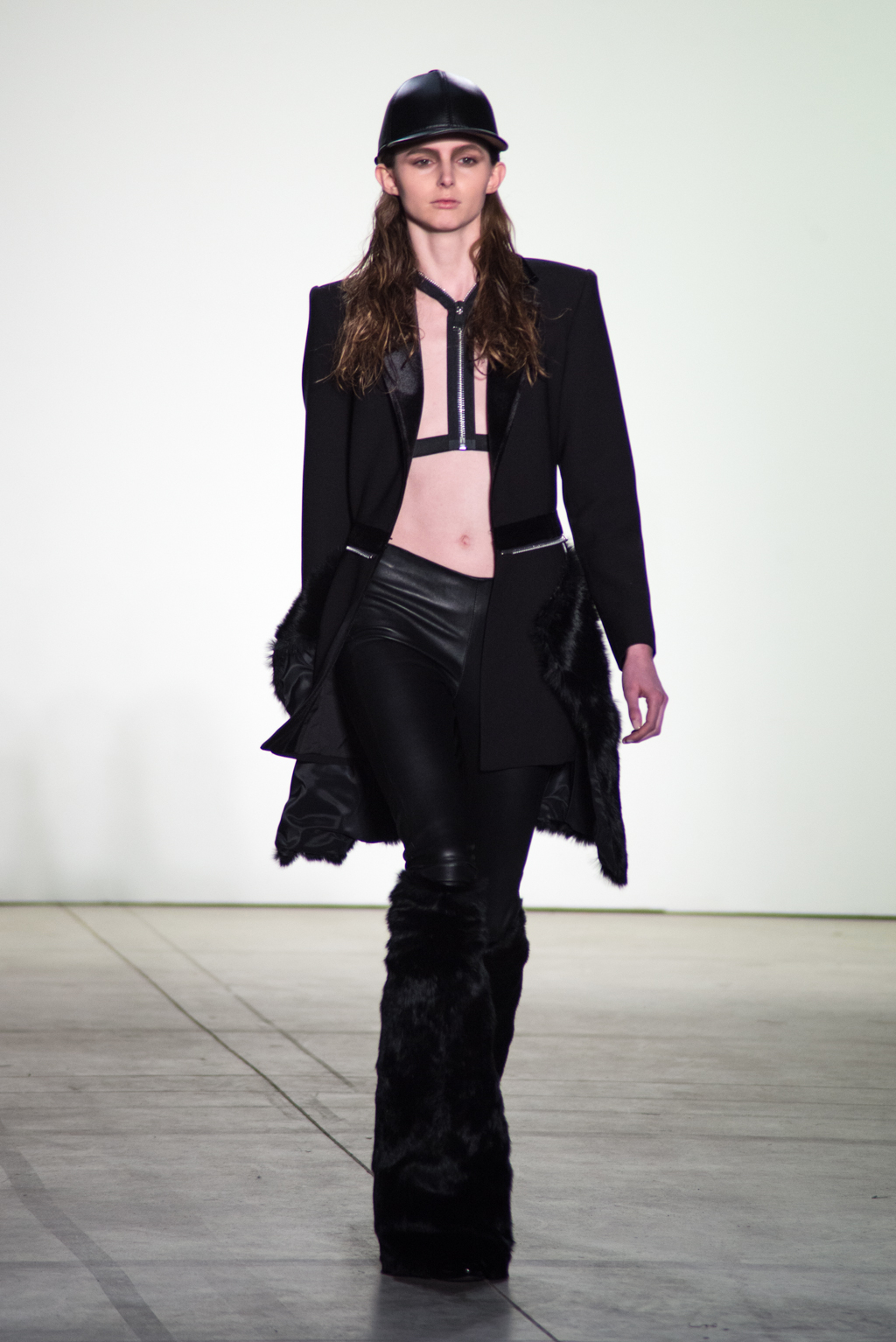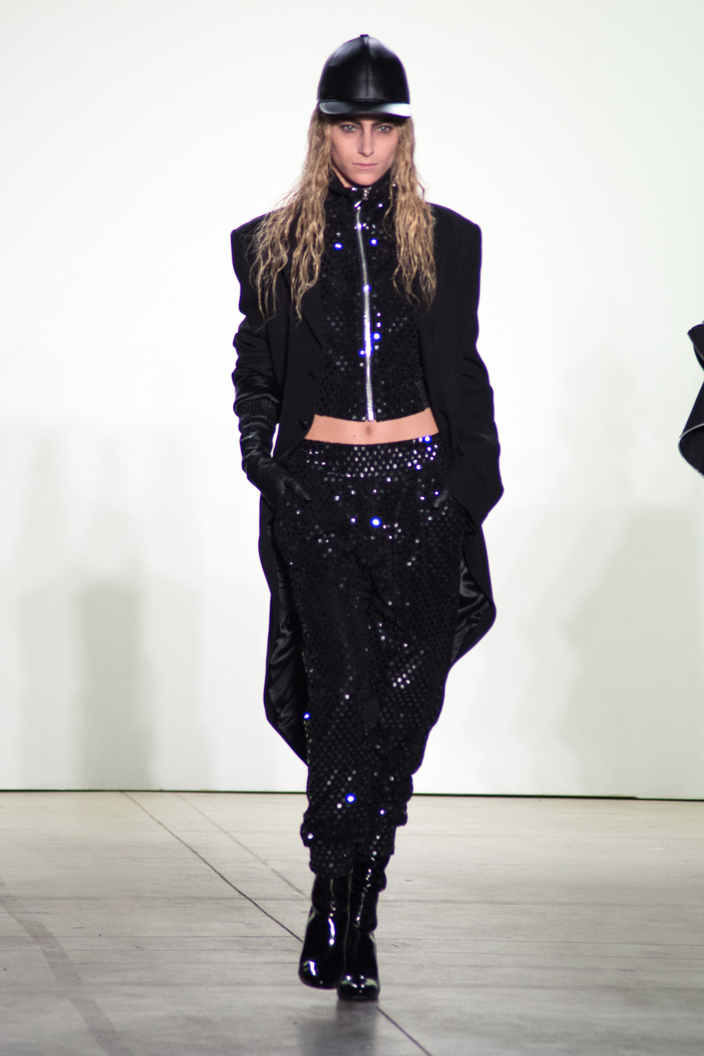 For womenswear, the collection features seen-through tops in metallic seemed fabrics to reveal the under-layer black lingerie. Paired with an oversized puffer coat and knee length boots, the style unites feminine elegance with a domineering aura.