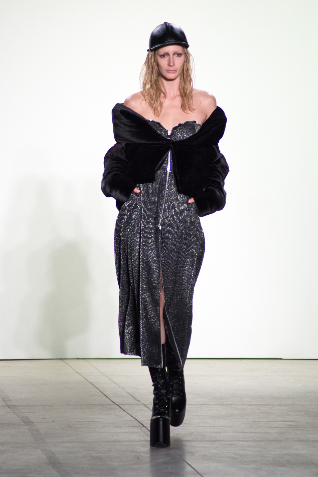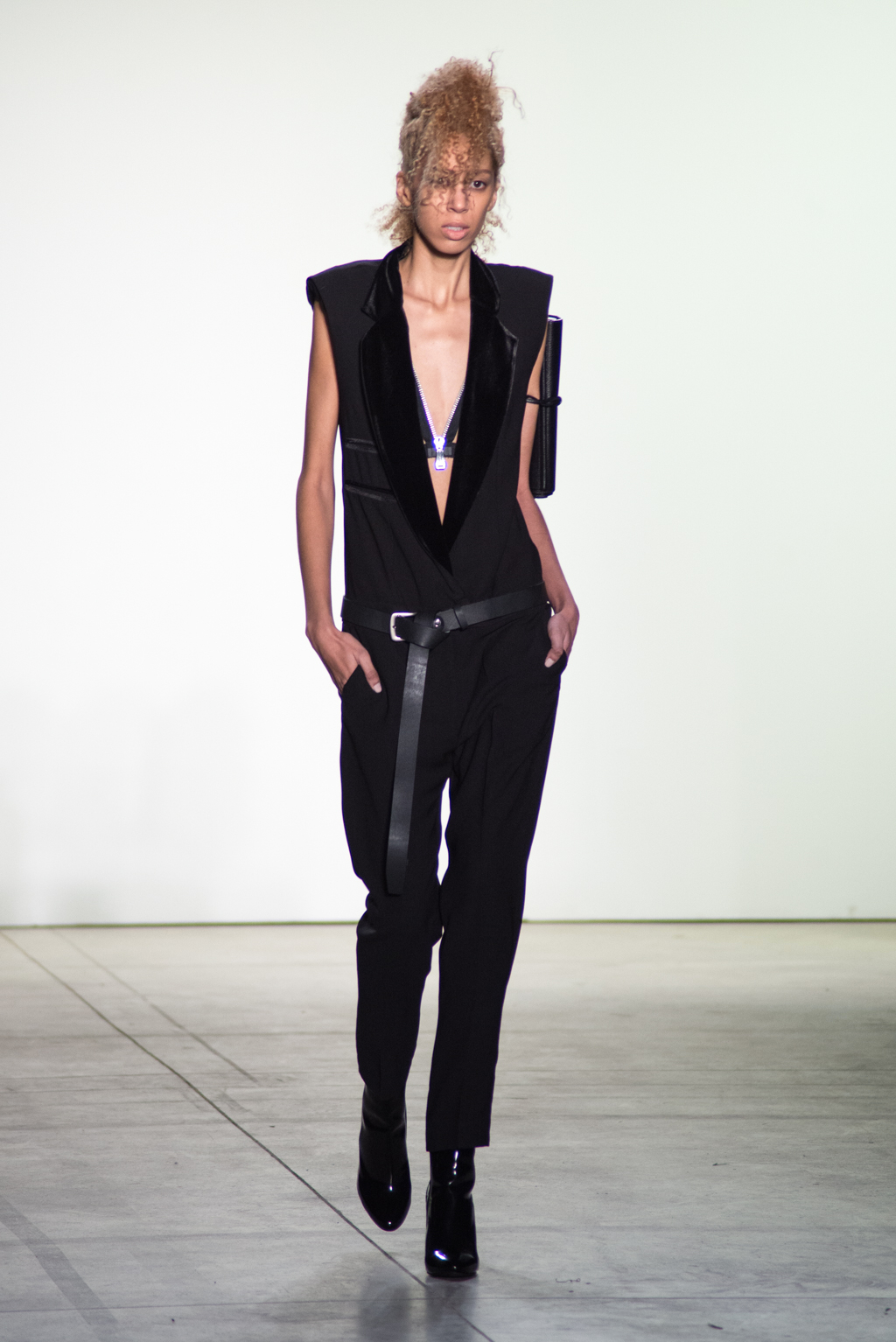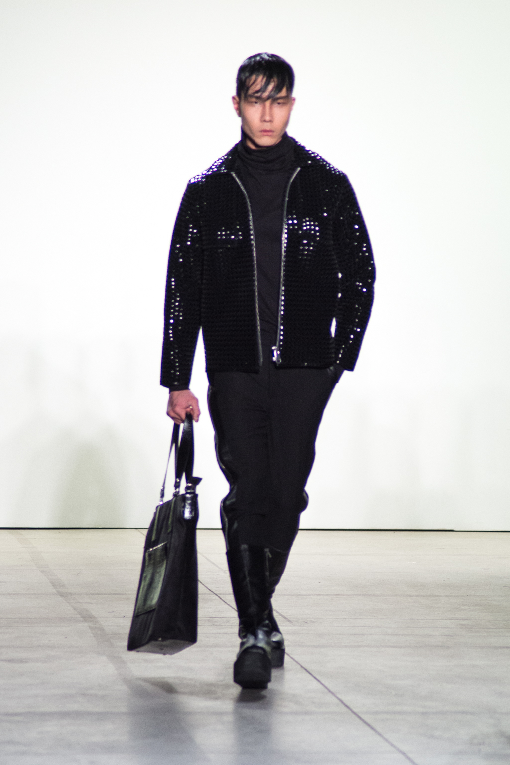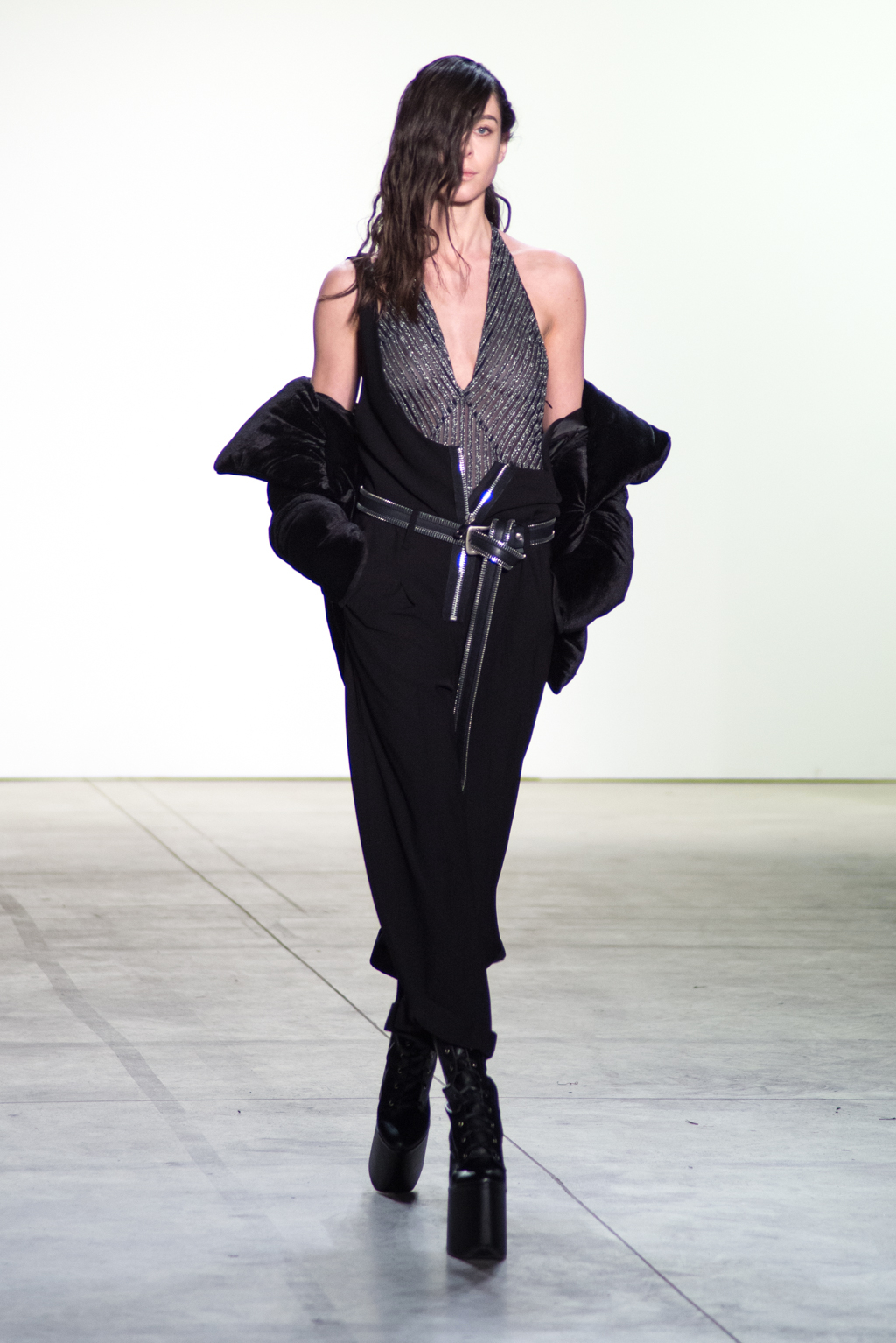 Black dominates the color of the collection. In contrast to the somber color, silver zippers and metallic seemed fabrics stiffens up the pitch-black material into a metallic form. The trendy velvet material is also present in many pieces to unite in harmony with elegance.