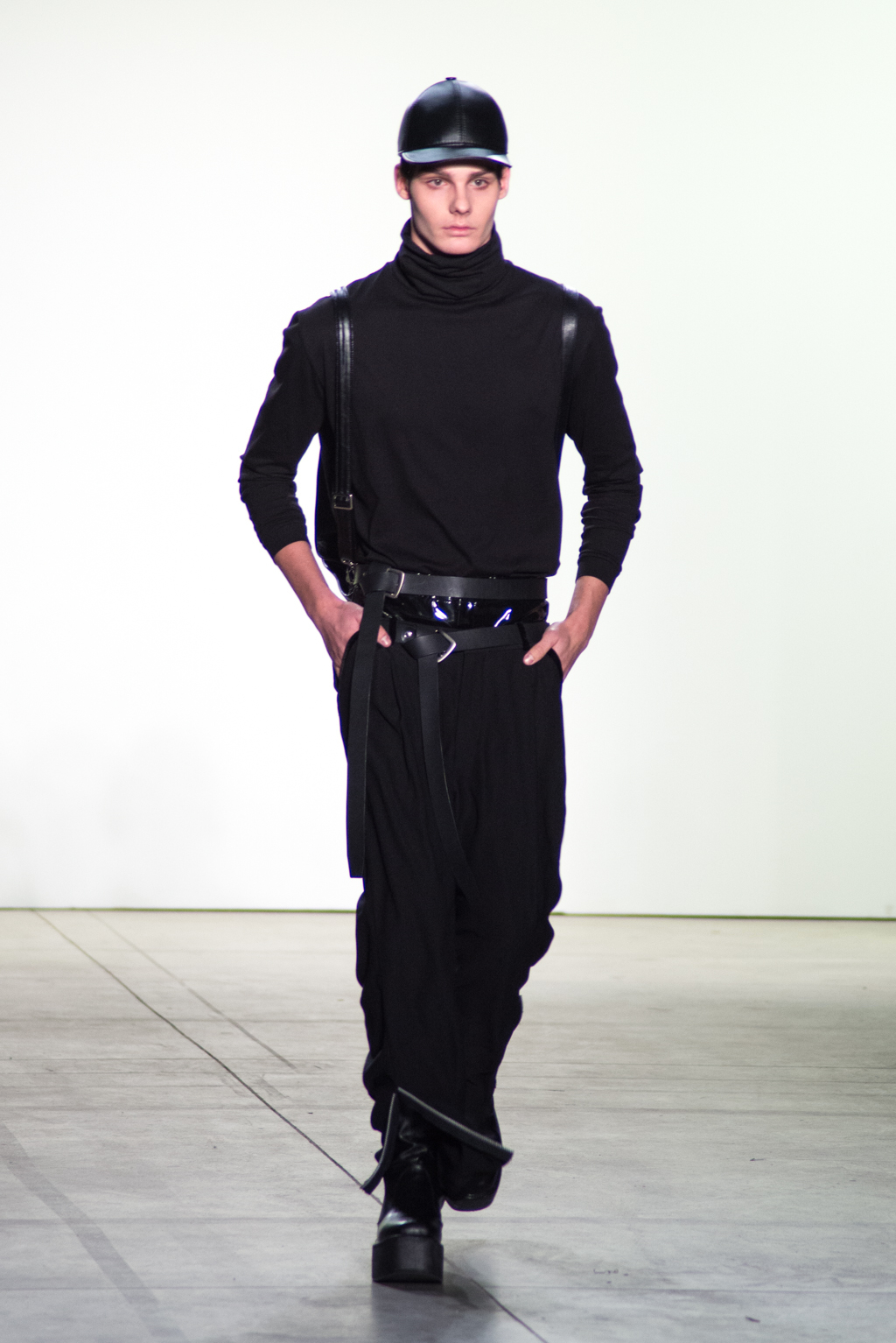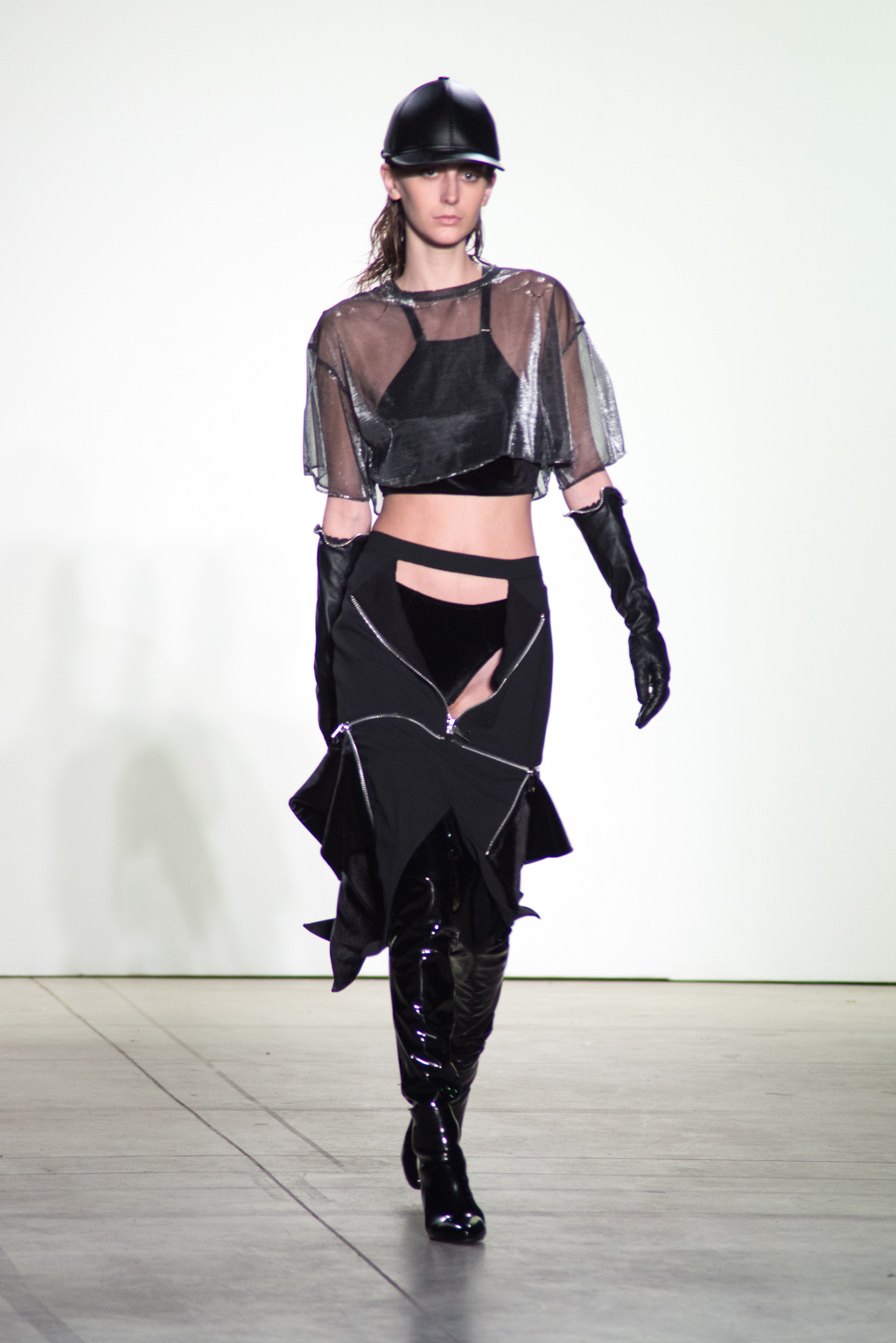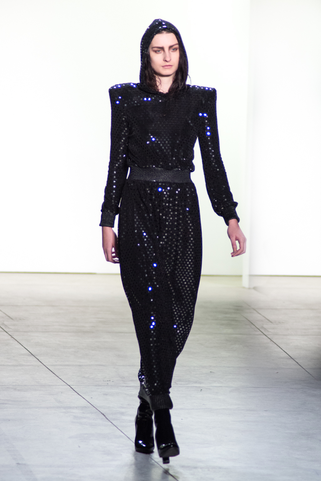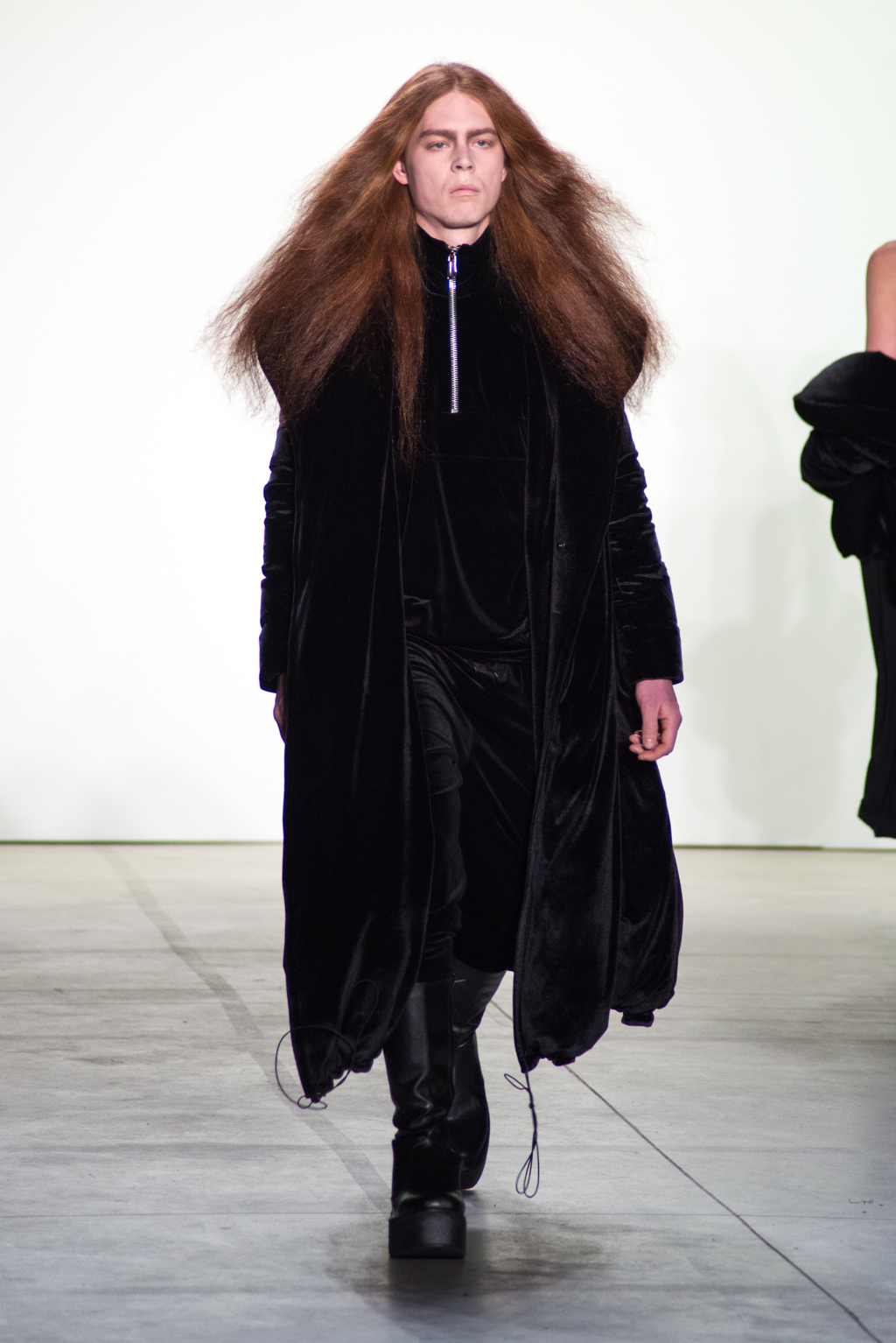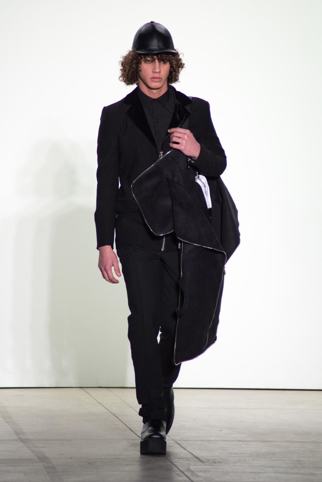 Black dominates the color of the collection. In contrast to the somber color, silver zippers and metallic seemed fabrics stiffens up the pitch-black material into a metallic form. The trendy velvet material is also present in many pieces to unite in harmony with elegance.
