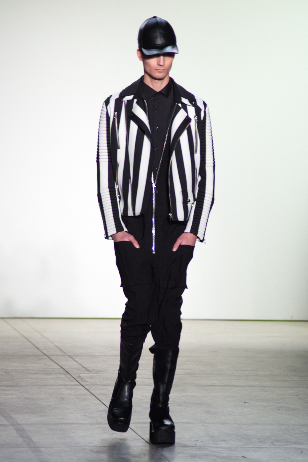 There are menswear and womenswear pieces in this collection. By using black-and-white lined fabrics, the designer emphasises “sporty couture” in masculine and feminine silhouettes.