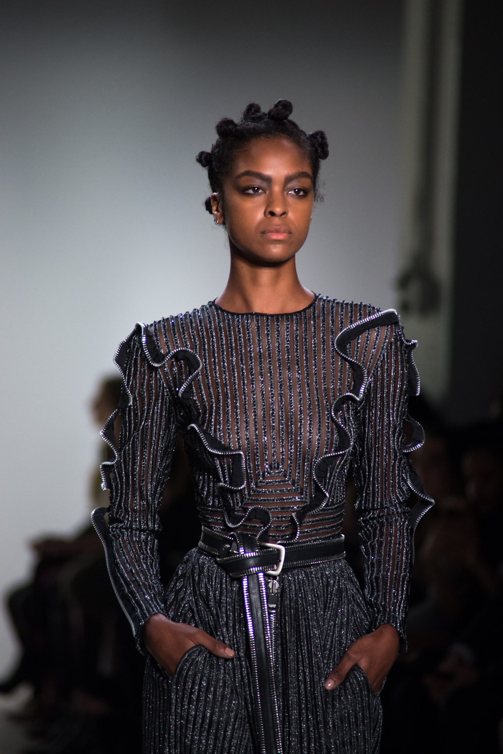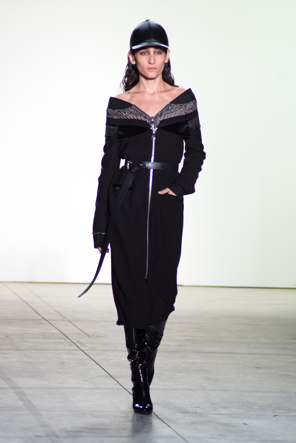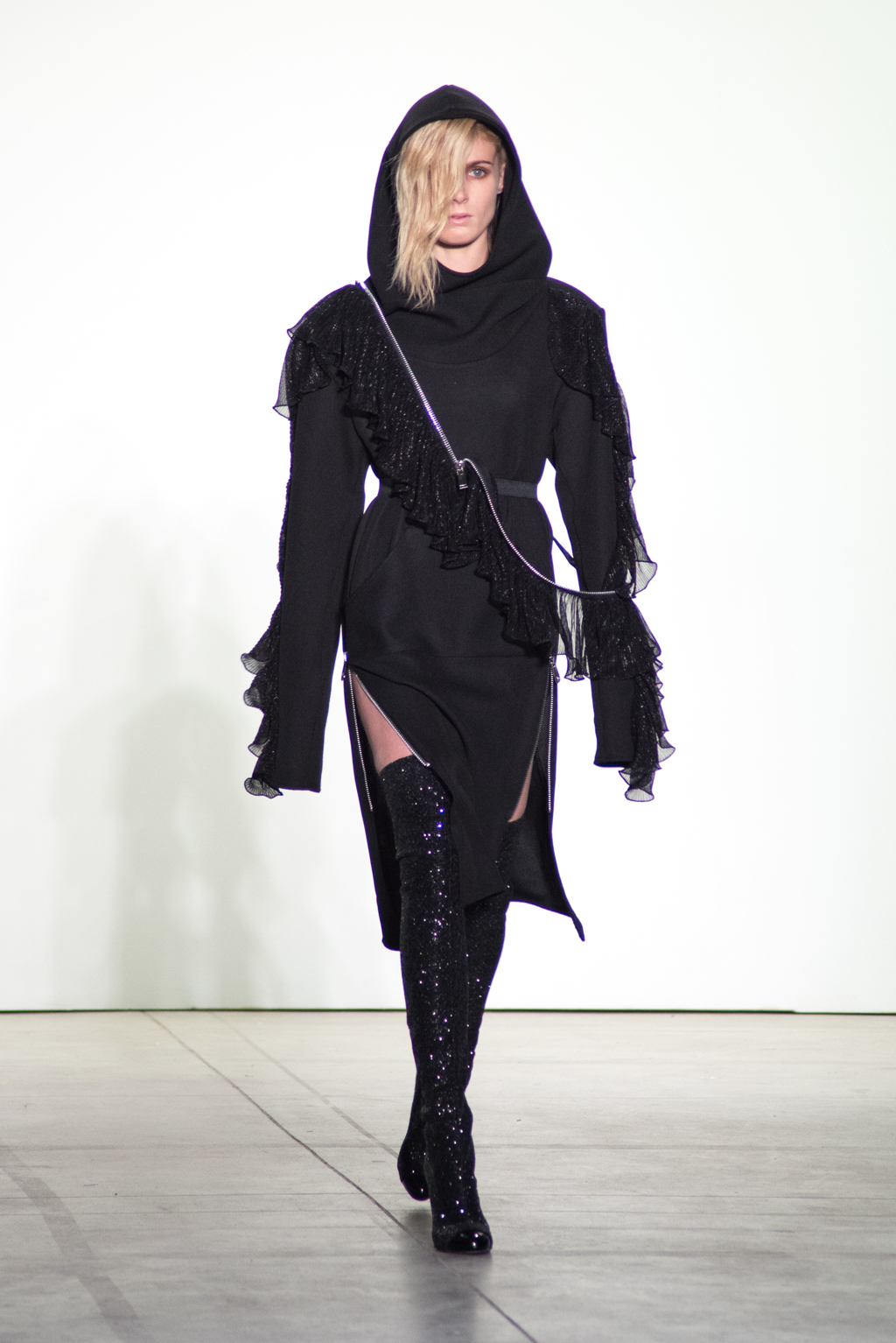 Black knee-length dress features a closed collar, allowing the off shoulder dress and opening on the chest. Weavy frill detail softens the harsh black tone of the collection. Zipper outlining highlights the motion of the frill while matching with the metallic belted dress.