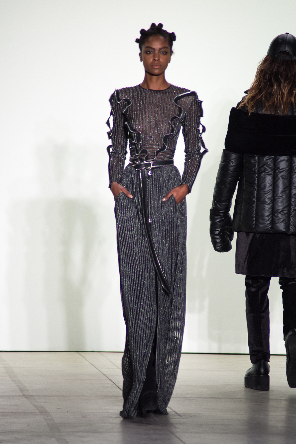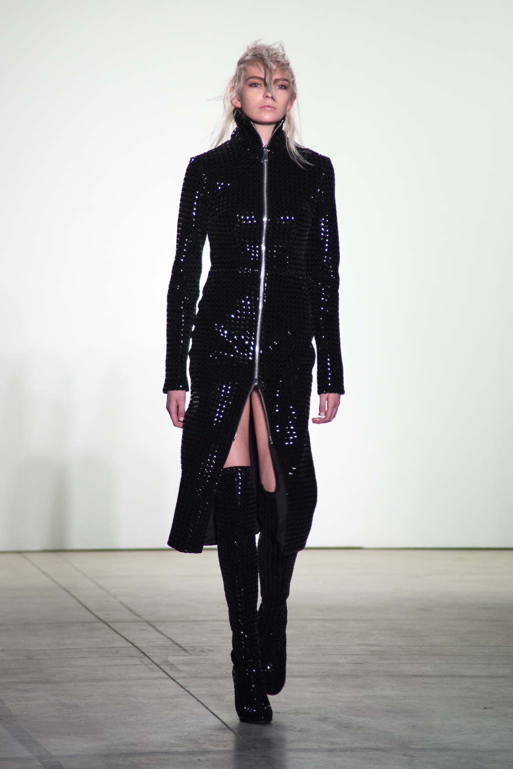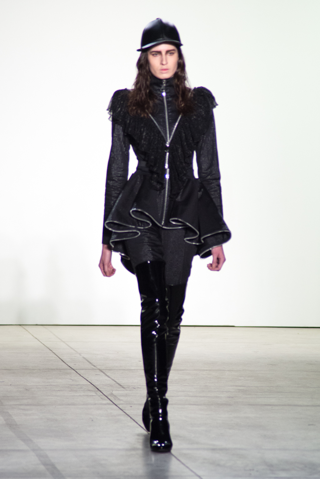 Black knee-length dress features a closed collar, allowing the off shoulder dress and opening on the chest. Weavy frill detail softens the harsh black tone of the collection. Zipper outlining highlights the motion of the frill while matching with the metallic belted dress.
