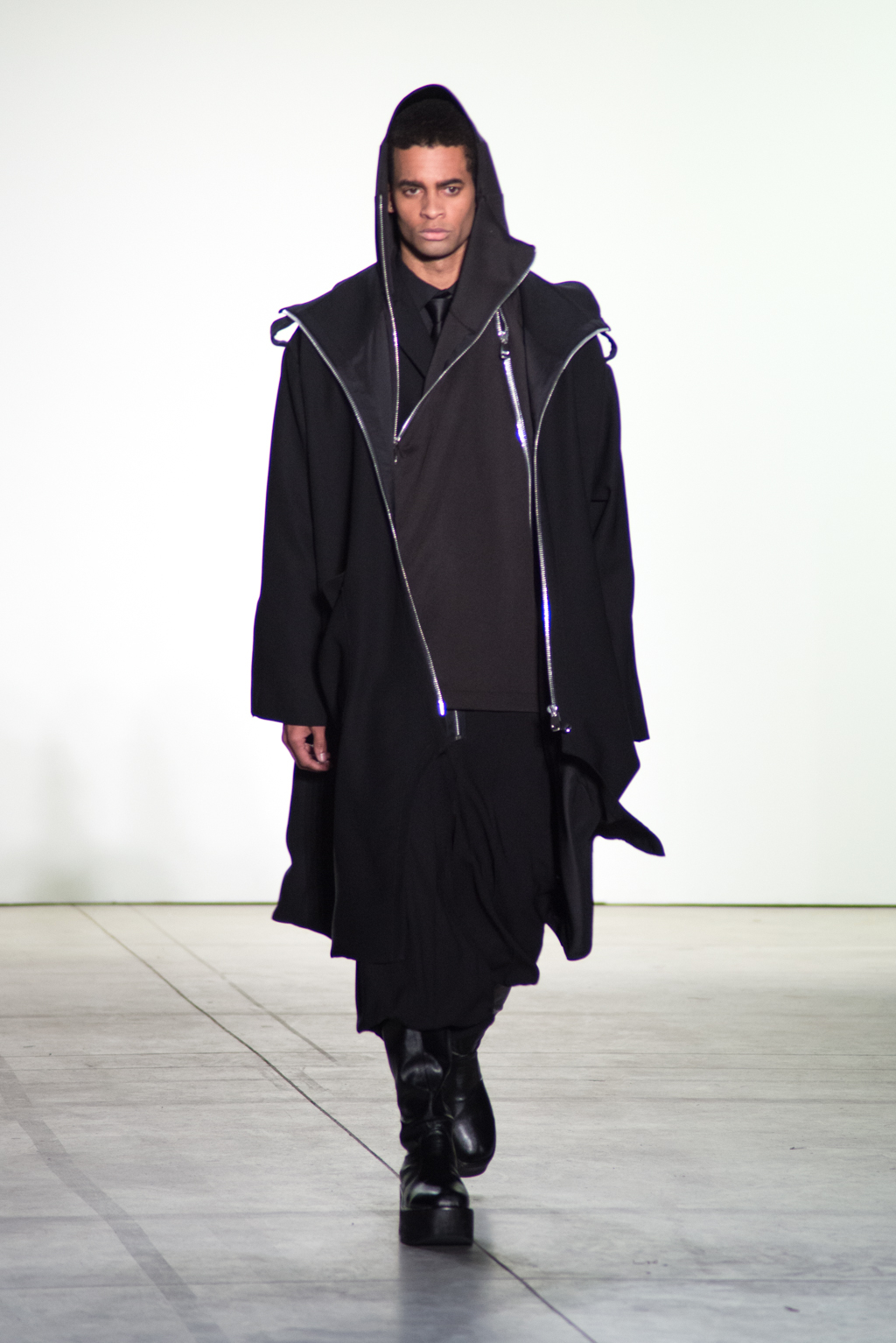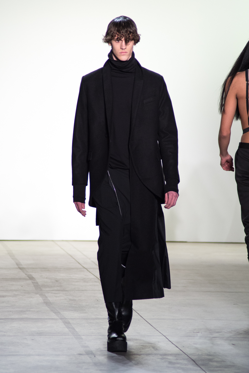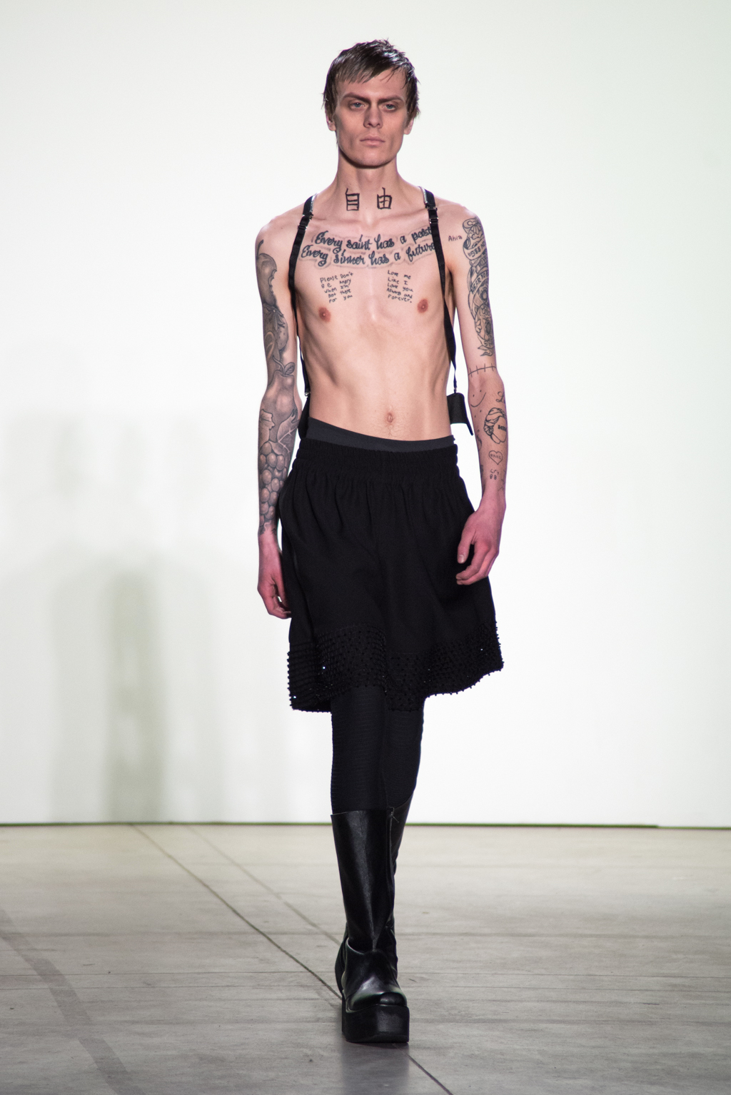 Hakan Akkaya’s autumn/winter 2017 collection revolves around the theme of “freedom”. Akkaya questions whether citizens have the freedom to live and think “as free as they want” regardless of their religion, race, language or sex. Burka-inspired one-piece jacket sharply contrasts with a topless model with a neck tattoo of “freedom” in Chinese to resonate with the theme of the collection.