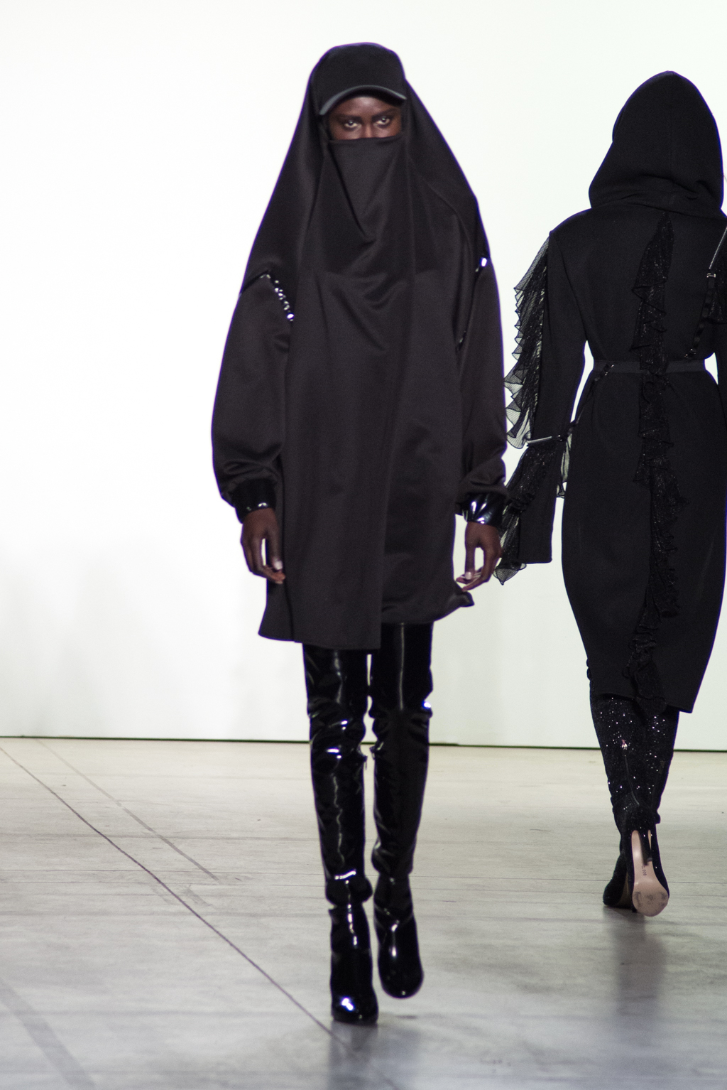 Men and women’s burka-like top with an attached head scarf stirs up the controversial discussion of religious clothing. Topless and over-revealing models present a contrast, questioning whether people really have the freedom to wear what they want and live however they want regardless of their background.