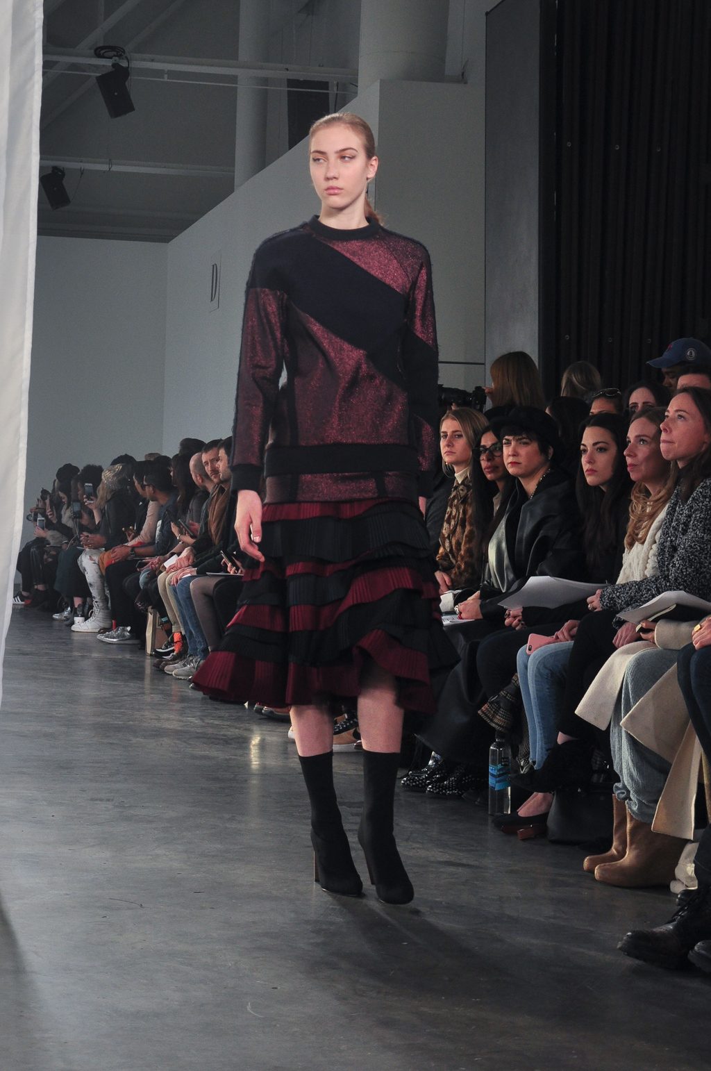 The black colour scheme faded when a model appeared in a seven-tiered swish skirt that alternated shades of black and burgundy. The skirt was paired with a sparkling red, striped wool shirt. Elsewhere, shearling arm bands reappeared on a wool cocoon jacket, featuring a bright golden zip and oversized pockets.