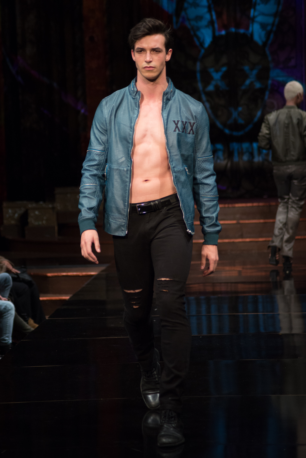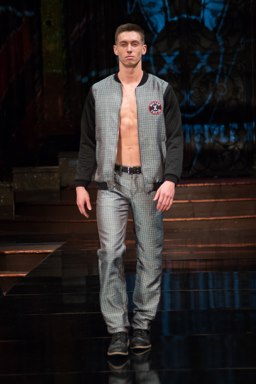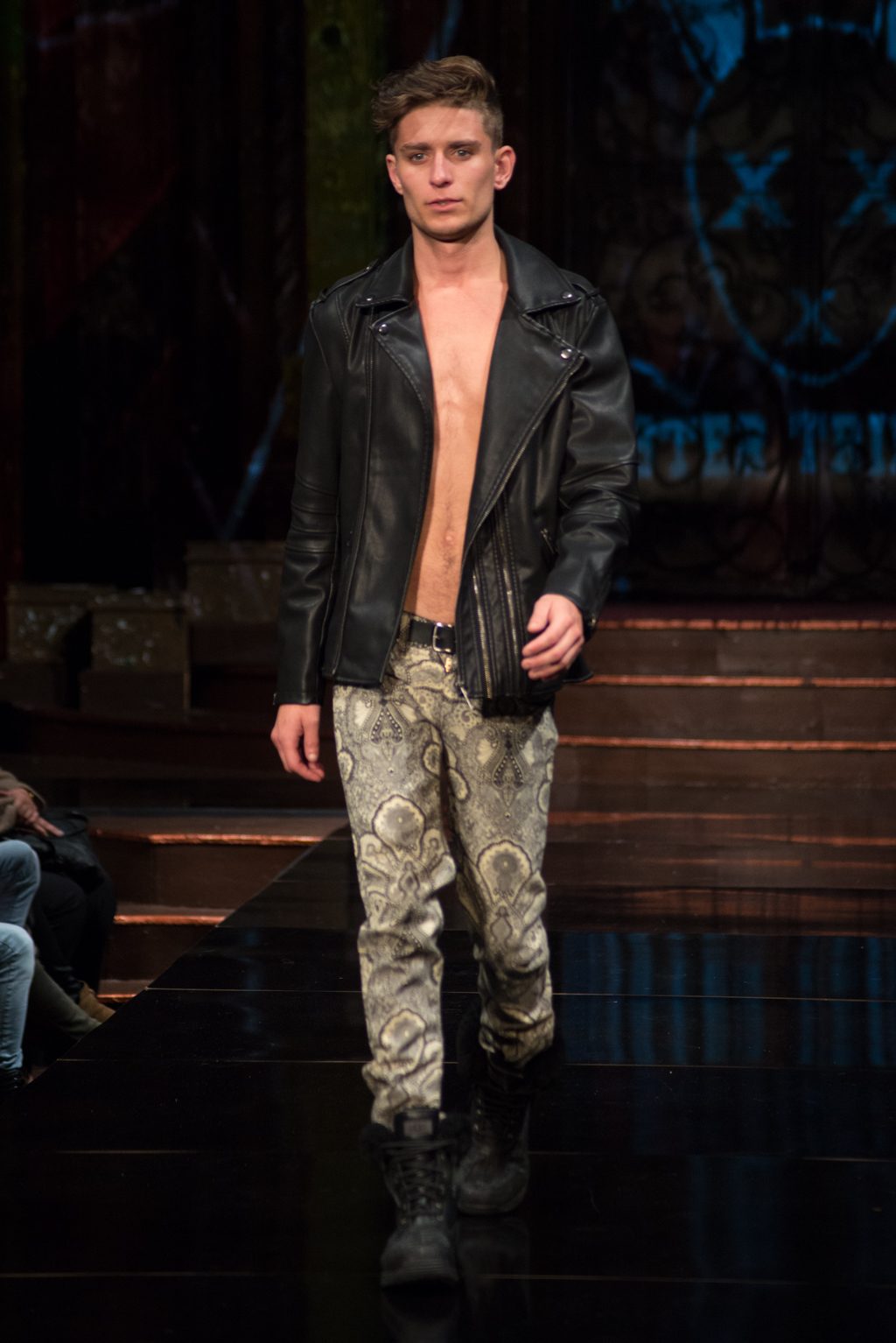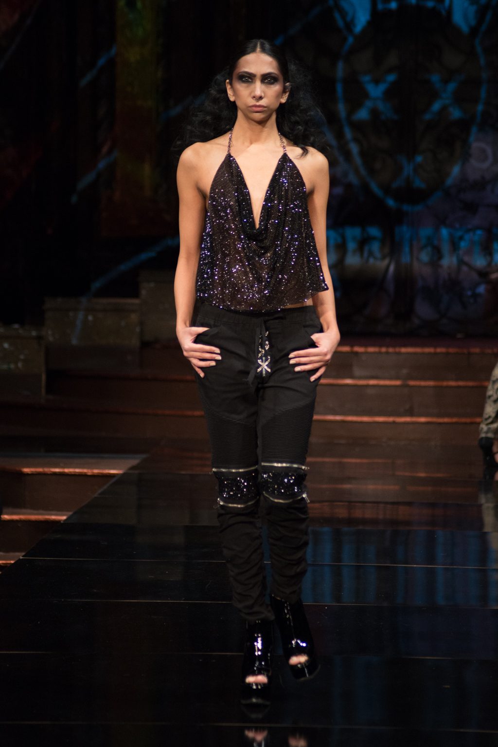 The gears totally shifted with the final designer, Mister Triple X. The pop music intensified the designer’s artistic point of view. This collection was sporty with an edge and was on trend with upscale, sophisticated athleisure. Metallics were introduced with different styles of leather and bomber jackets. Male clothing seemed to be at the forefront of this collection, and there was maybe even a sense of androgyny as both men and women were wearing similar styles of slacks and jackets. The sliver of skin that was visible with an unzipped jacket, tied the male and female pieces together.