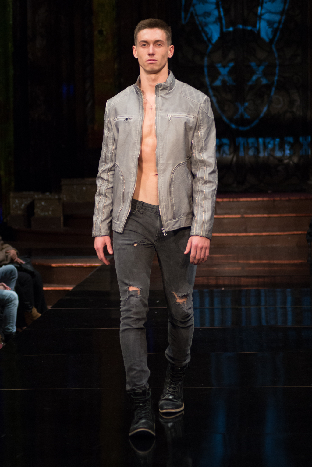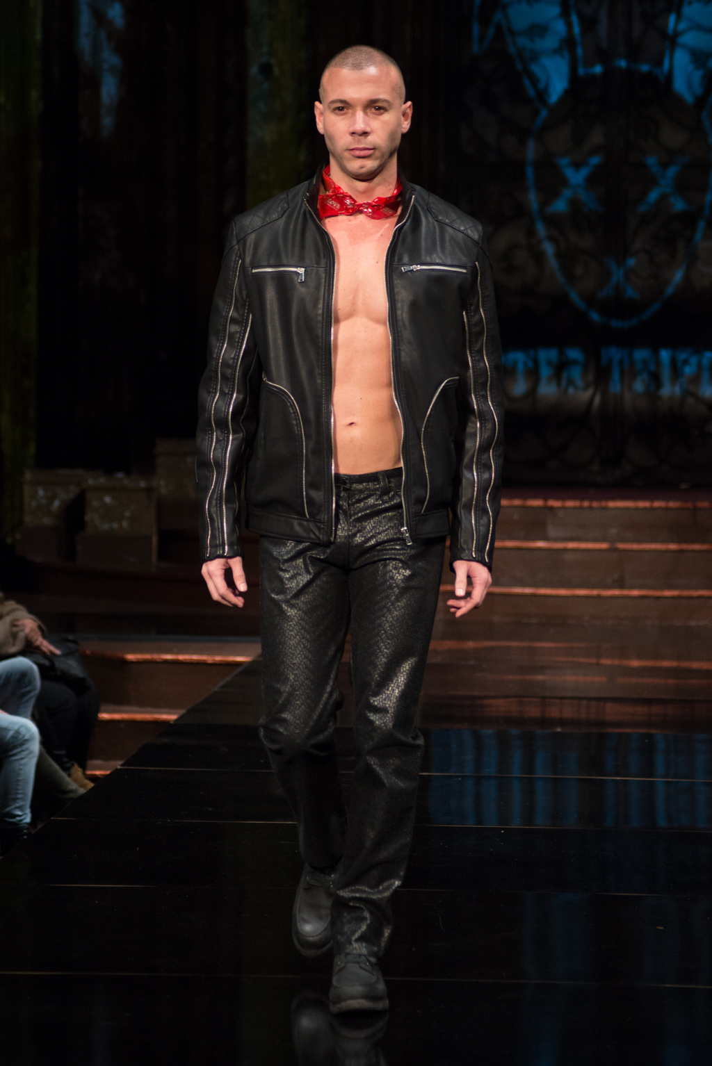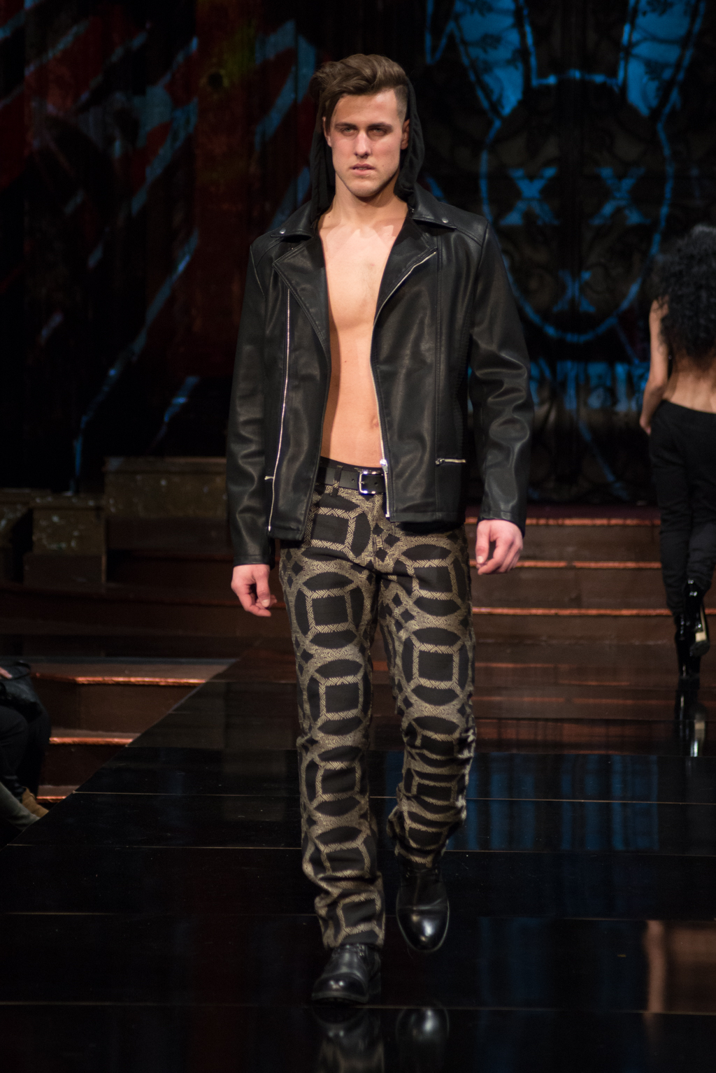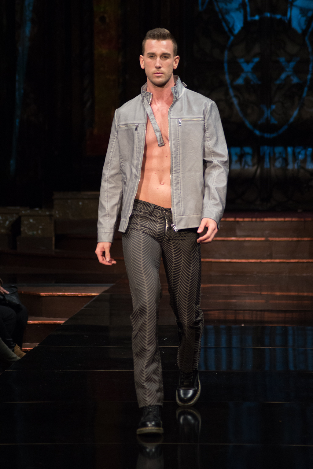 The gears totally shifted with the final designer, Mister Triple X. The pop music intensified the designer’s artistic point of view. This collection was sporty with an edge and was on trend with upscale, sophisticated athleisure. Metallics were introduced with different styles of leather and bomber jackets. Male clothing seemed to be at the forefront of this collection, and there was maybe even a sense of androgyny as both men and women were wearing similar styles of slacks and jackets. The sliver of skin that was visible with an unzipped jacket, tied the male and female pieces together.