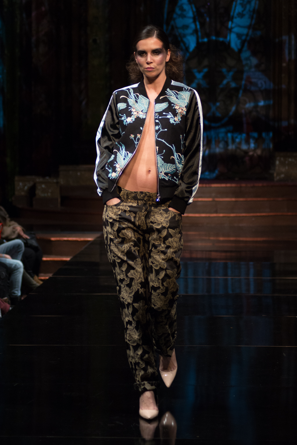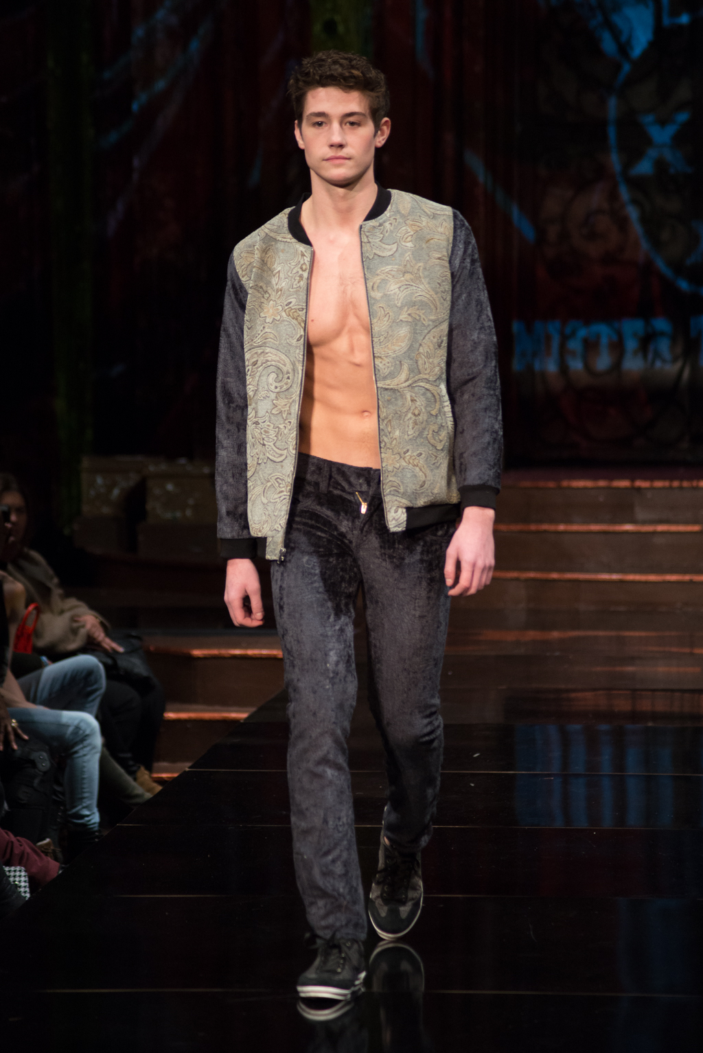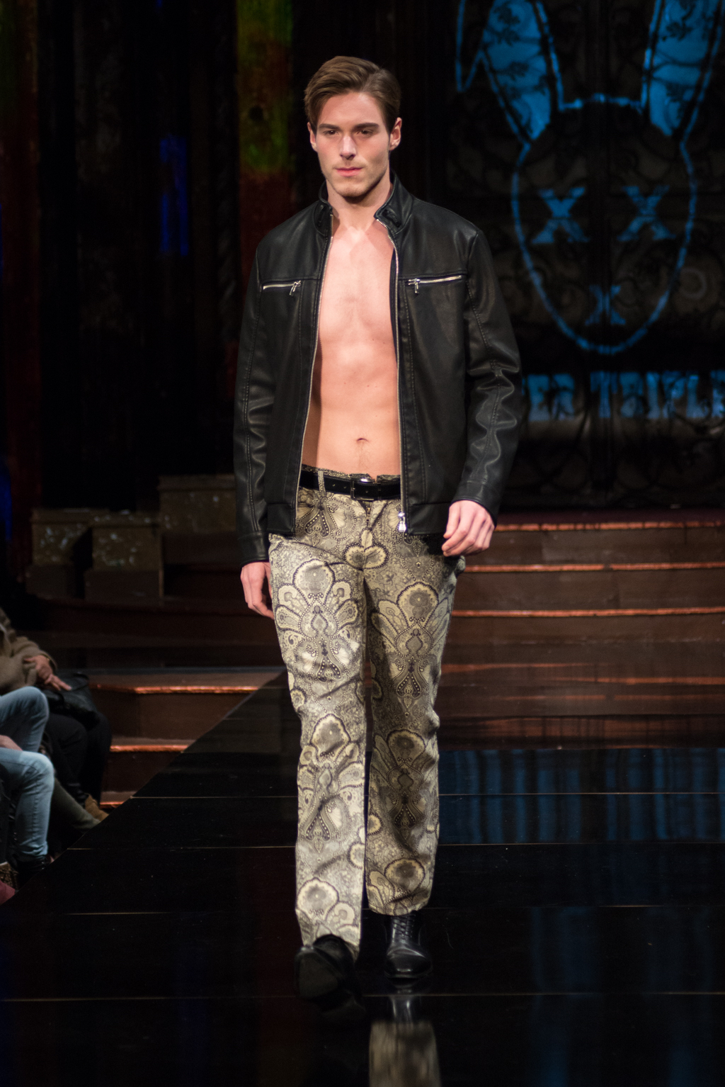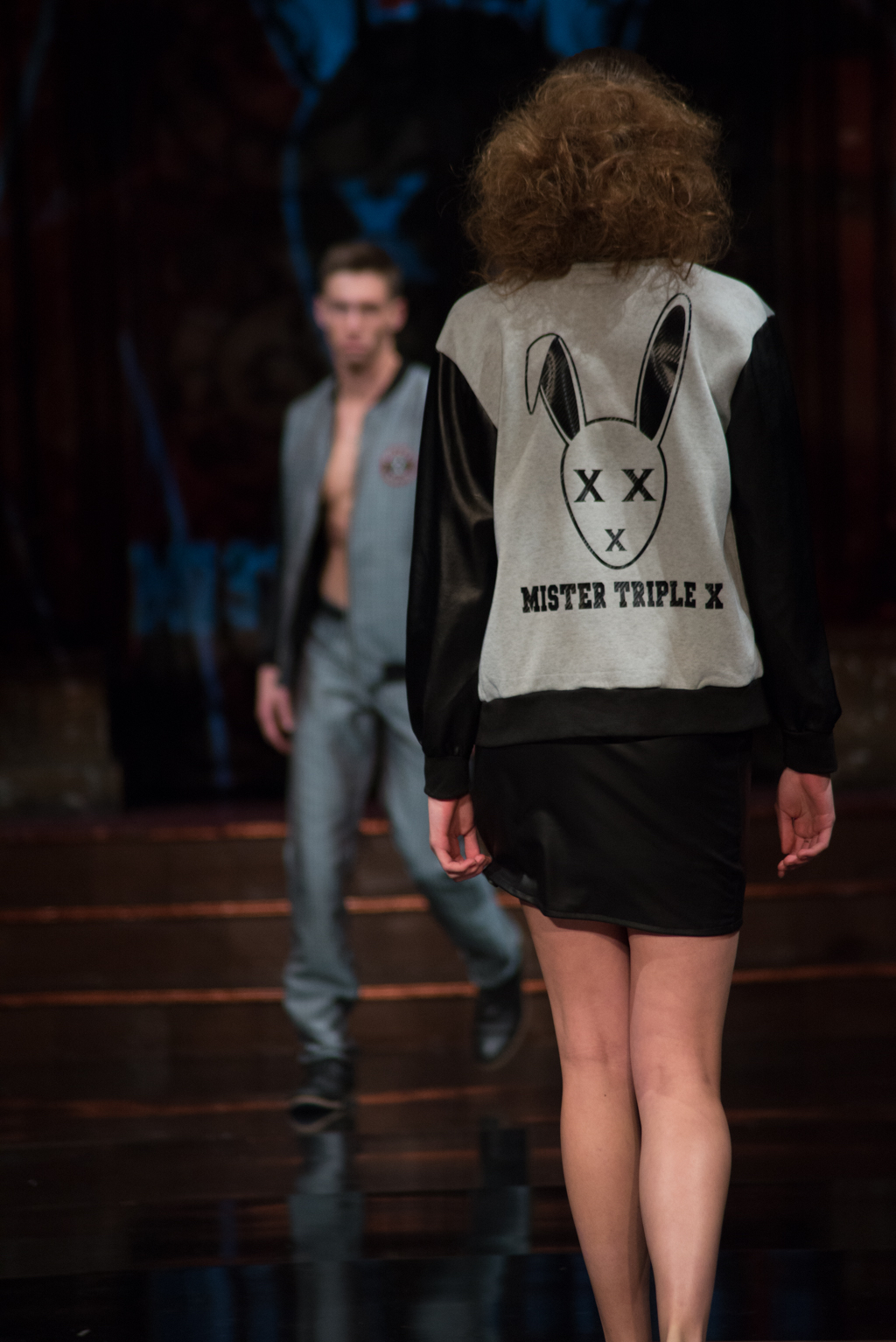 The gears totally shifted with the final designer, Mister Triple X. The pop music intensified the designer’s artistic point of view. This collection was sporty with an edge and was on trend with upscale, sophisticated athleisure. Metallics were introduced with different styles of leather and bomber jackets. Male clothing seemed to be at the forefront of this collection, and there was maybe even a sense of androgyny as both men and women were wearing similar styles of slacks and jackets. The sliver of skin that was visible with an unzipped jacket, tied the male and female pieces together.