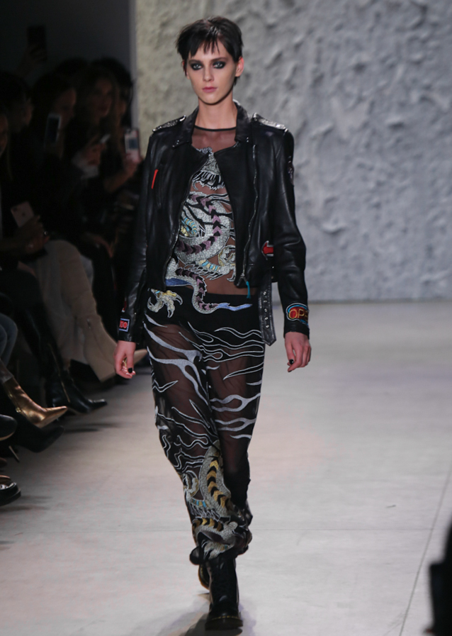 Patches and occult symbols were key elements of the collection, adorning the opening wool reefer coat, as well as denim vets, and stocking caps. Plaid and grunge tartans were reimagined in everything from harem pants to low-slung “boyfriend” tees. And no punk collection would be complete without a series of leather items including handbags, backpacks and of course biker jackets, individually festooned with patchwork and studs. Even tarot cards could be spotted on a number of pieces including mesh gowns, organza dresses and off-shoulder tops.