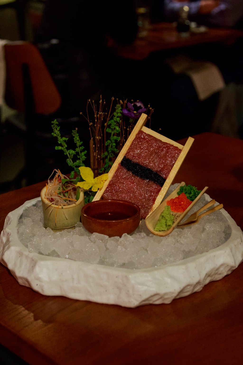Sakagura’s excellent background, though, as the union of 2-starred Michelin experience and a traditional sake brewery, mean it’s one of those few restaurants that can wear the “authentic” badge without a hint of trickery. You can see it in our incredible sake sommelier, who perfectly matches each course to a selection of sake, and in some great mixology from the bar. The limited edition Burns Night cocktail is the highlight, bathing the table in a light smoke as it is decanted, its combination of Suntory whisky and yuzu bitters ensuring that its taste is every bit as impressive as its theatrics.