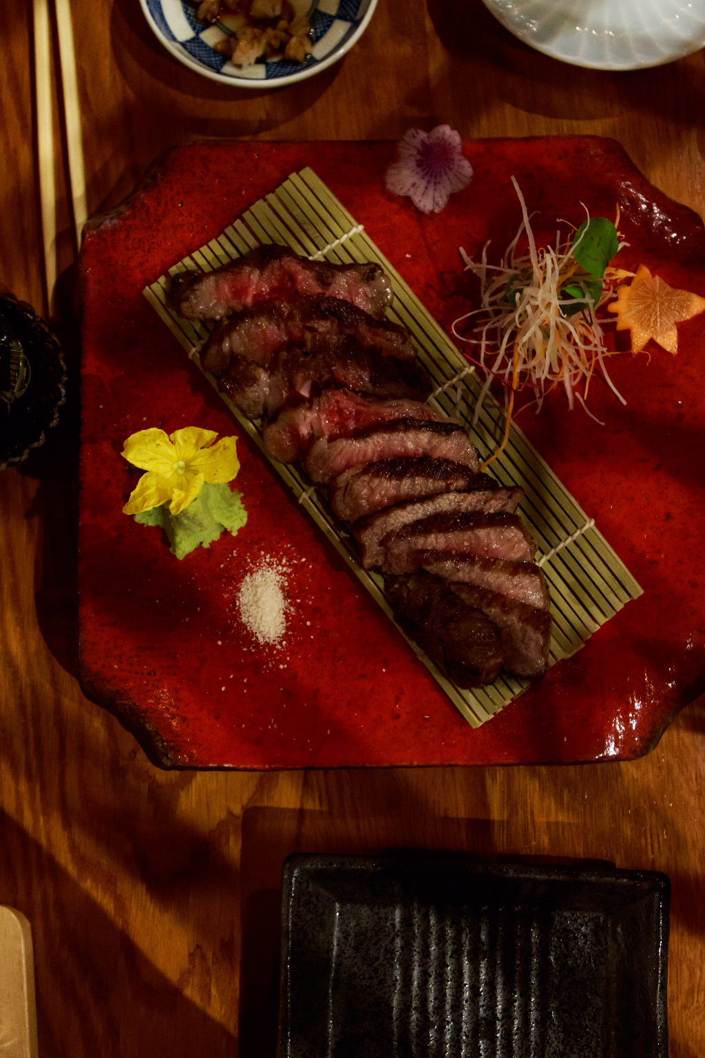 Wagyu beef is considerably better, cut into thin strips and served with light seasoning and a little optional chili powder, as it should be. This elite variety of steak is at its best when it’s allowed to shine on its own, A seared crust, all smoke and fire, gives way to buttery fat and tender beef, that you don’t so much chew as allow to melt away in your mouth.