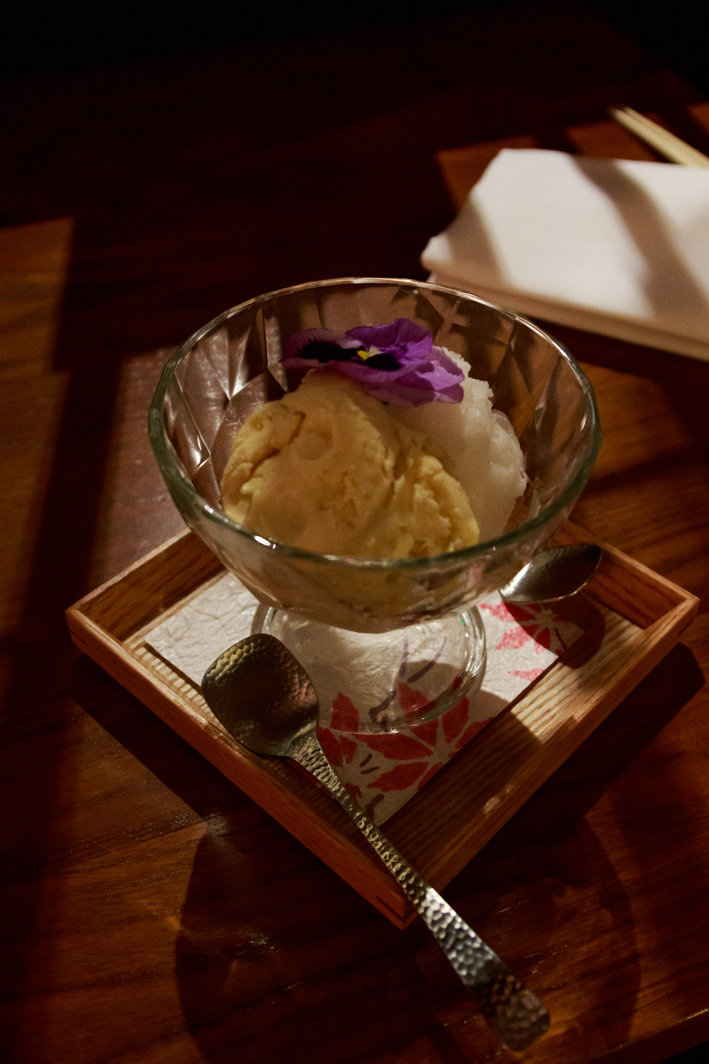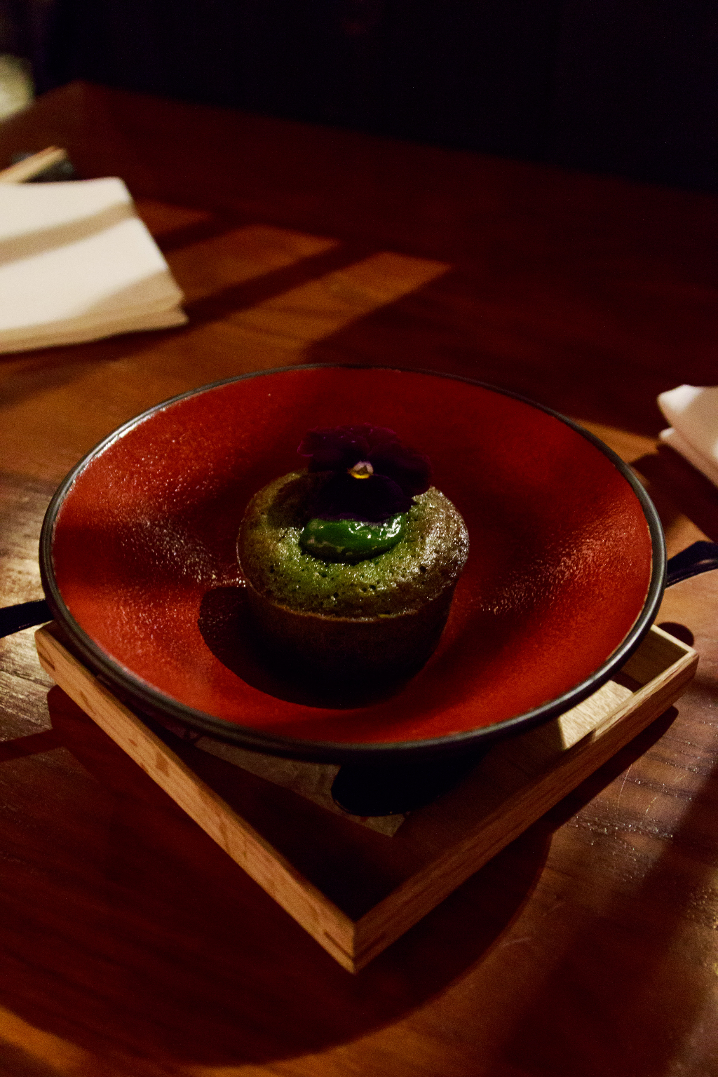Matcha Fondant is itself a nice dish, whilst the centre’s still deliciously gooey. It’s the plum wine it’s paired with though, once again a masterful call by our sommelier, that really takes it to another level. Its intense, almost jammy sweetness works perfectly with the slight astringency that the matcha gives, creating a surprisingly light but no less indulgent twist on an old classic. Our Soy Sauce Caramel Ice Cream is much the same, the sauce acting as an interesting alternative to salt that gives it the slightest savoury tang before the caramel kicks in.