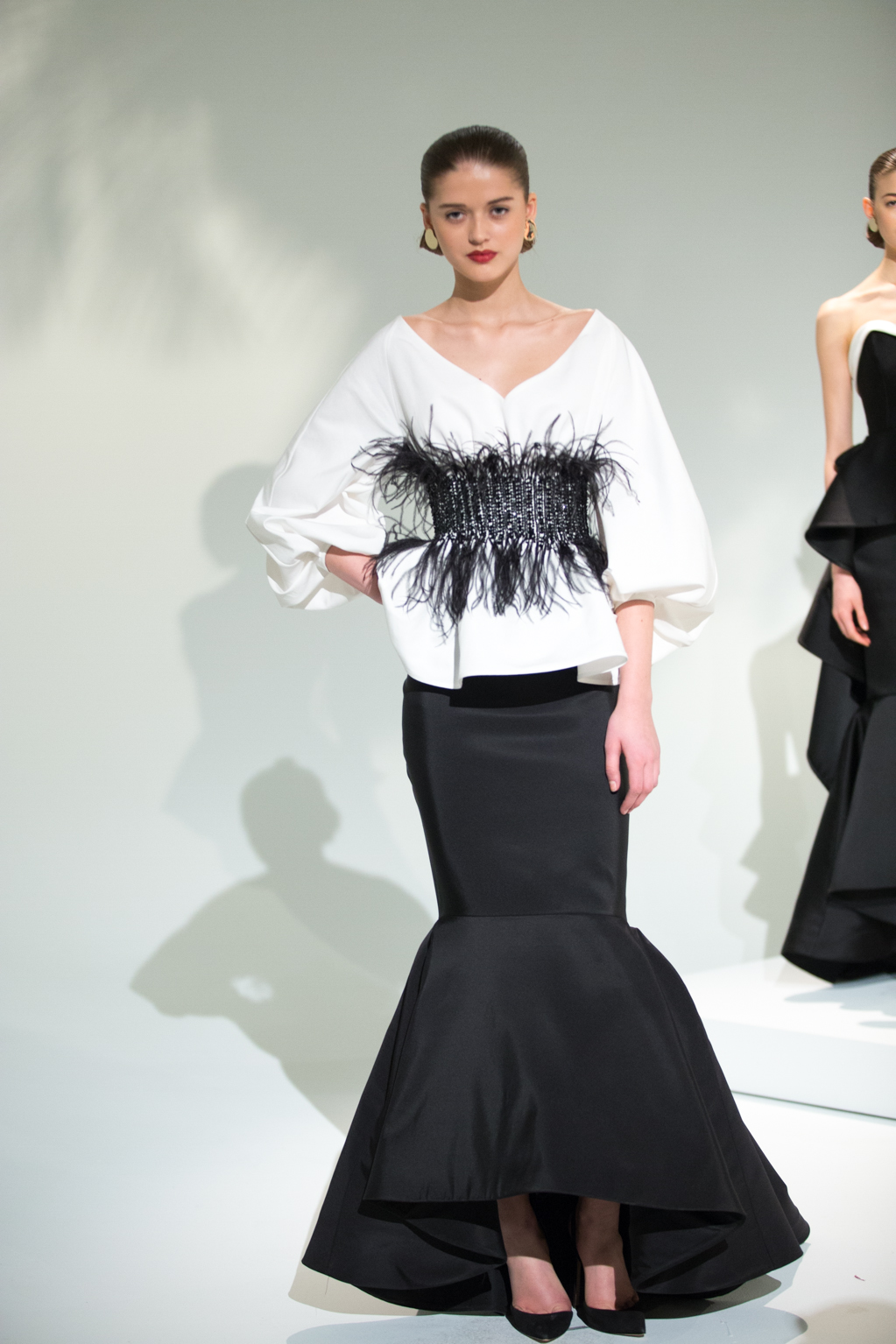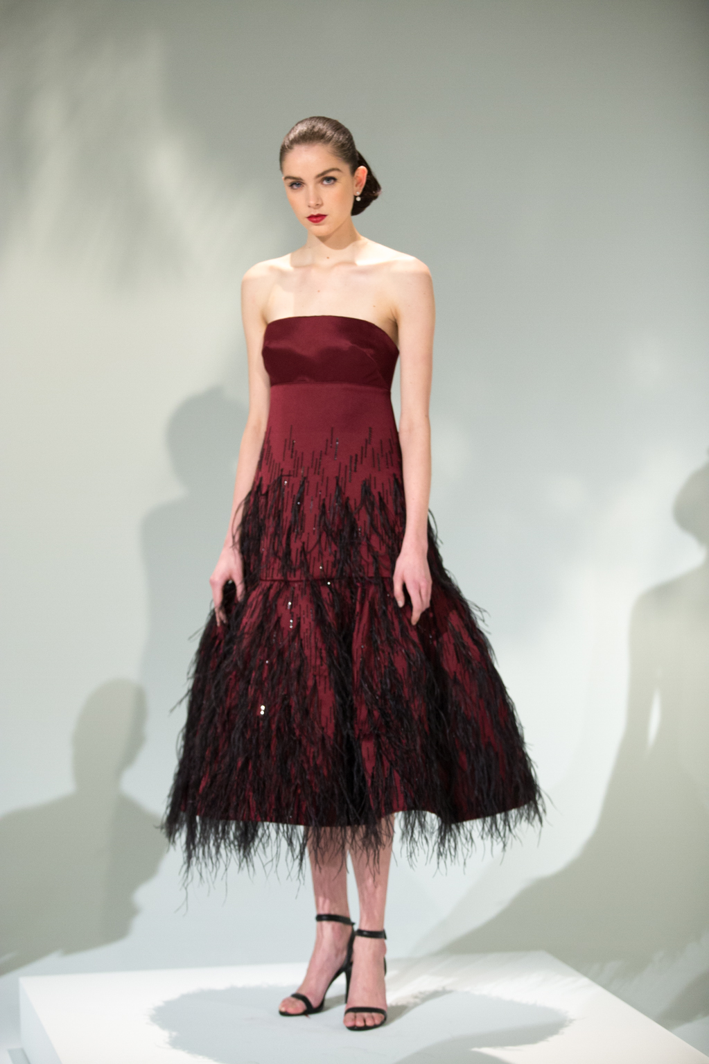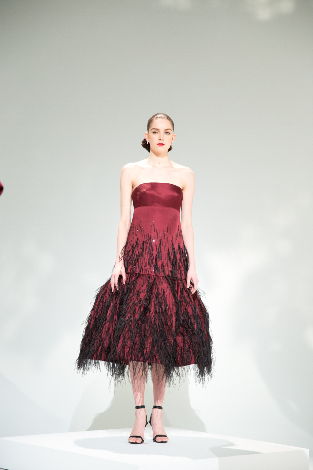 Dramatic silhouettes were the order of the day: huge ball gowns, oversized peplums, and show-stopping necklines appeared. The designer was on hand speaking to show-goers about her designs, and was overheard saying one of the skirts contained over 150 yards of tulle and took many hours to make. Feathers were delicately placed, often creating an ombré effect accented with touches of sparkle.