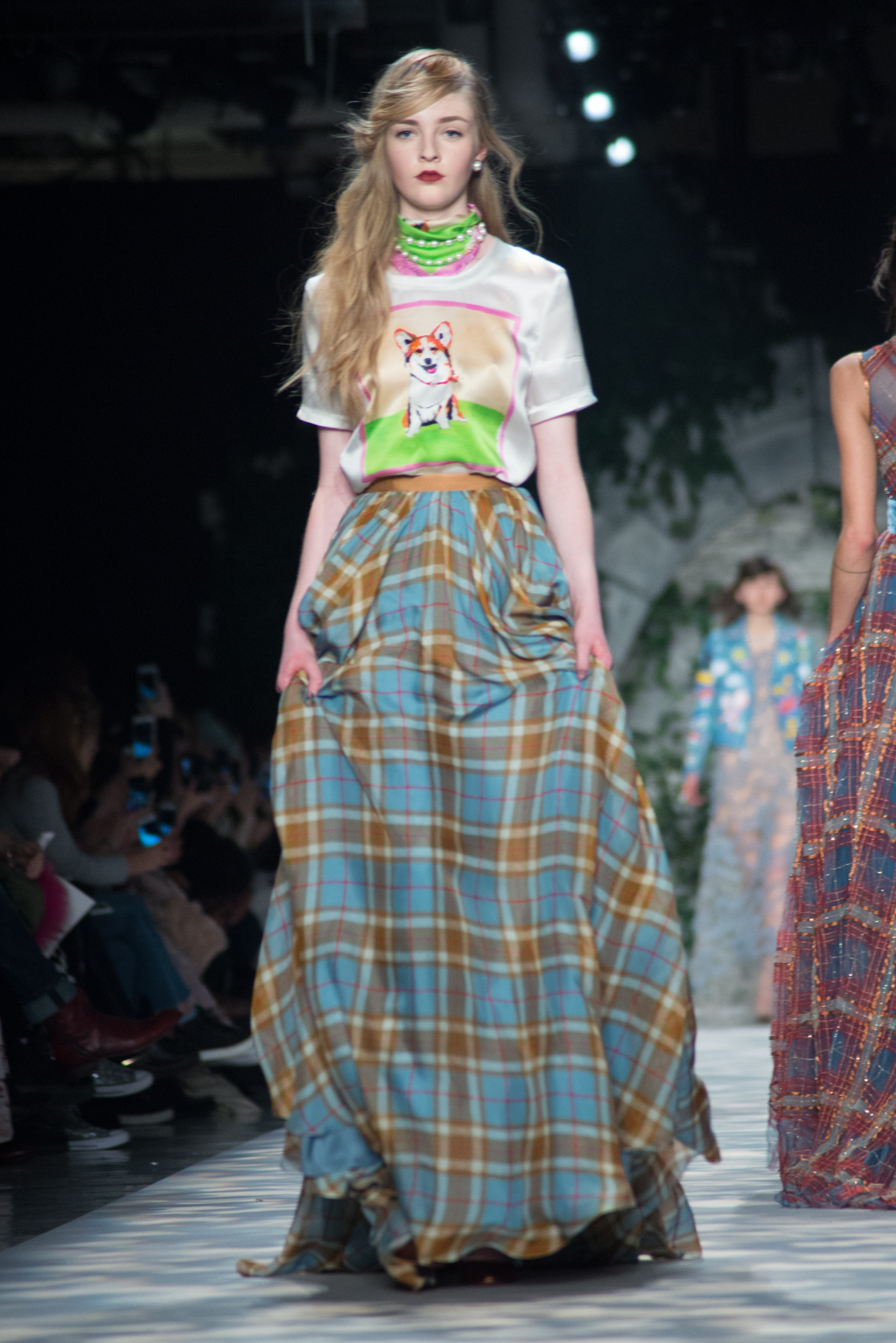 Unsurprisingly, the theme included lots of plaids given a very feminine Jenny Packham treatment. They were seen in long flowing gowns and lighter than air sheet variations as well as in a bedazzled with a swinging 60s silhouette. Playful prints on scarves and tee shirts injected the collection with little pops of delight in the form of some of England’s most recognisable symbols and were just the touches that were needed to tie the theme together.