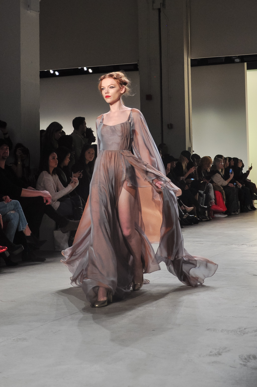 The balance between structure and ease was perfectly executed in the cropped black silk wool off-the-shoulder jacket layered over a taupe silk charmeuse draped dress. The dark black colour added to the thick wool fabric, allowing the creation of a dense jacket. This piece was in opposition to the see-through, delicate fabric of the dress, yet the pieces worked together and added to the overall effect. The ability of these fabrics to connect is due to the simplistic nature of each piece; neither one was commanding attention, and they reflected one another effortlessly.