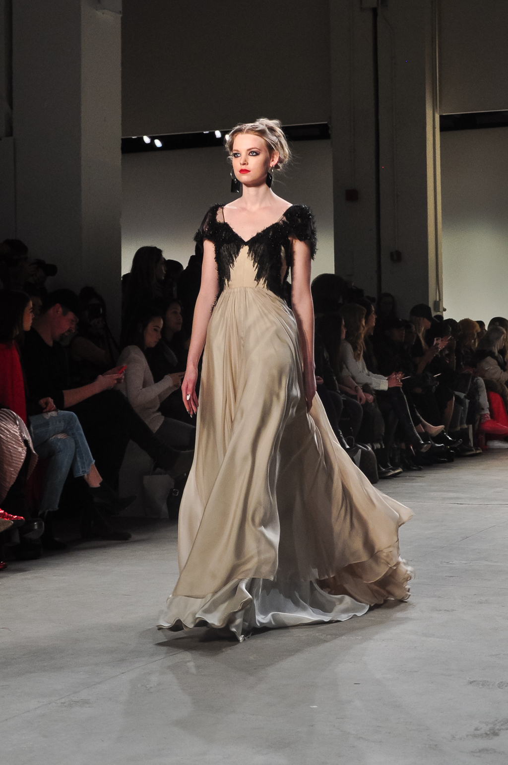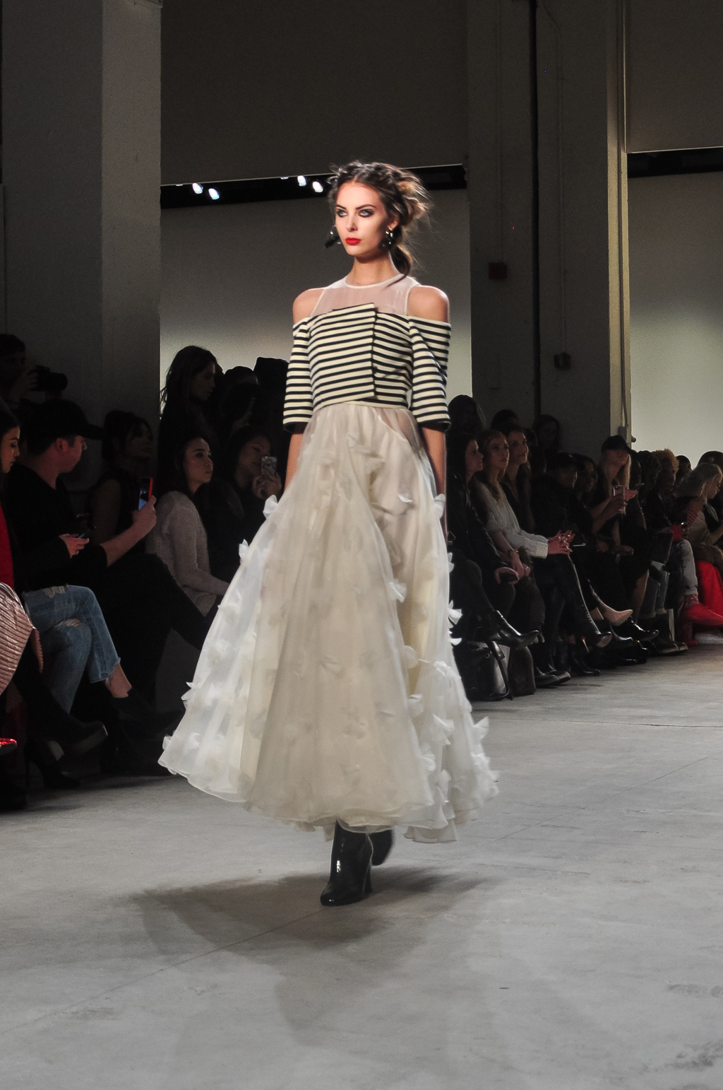 Marshall was able to create looks which presented diverse material and design aesthetics. The gallant black and ivory striped geometry displayed in the cropped jacket was uniquely paired with an ivory silk organza embellished dress. These textures play with the eye and instil within the piece a lighthearted element. This displays sophistication in a fun manner and shows that sensuality knows no bounds.