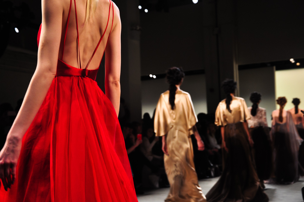 Romance was in the air this afternoon as Leanne Marshall presented her collection full of intricate beading and lace details. The colour palette progressed from soft neutrals to bold stripes and vibrant red. The boldness of the eyeliner, tousled hair and bright lips beautifully complimented sensual air.
