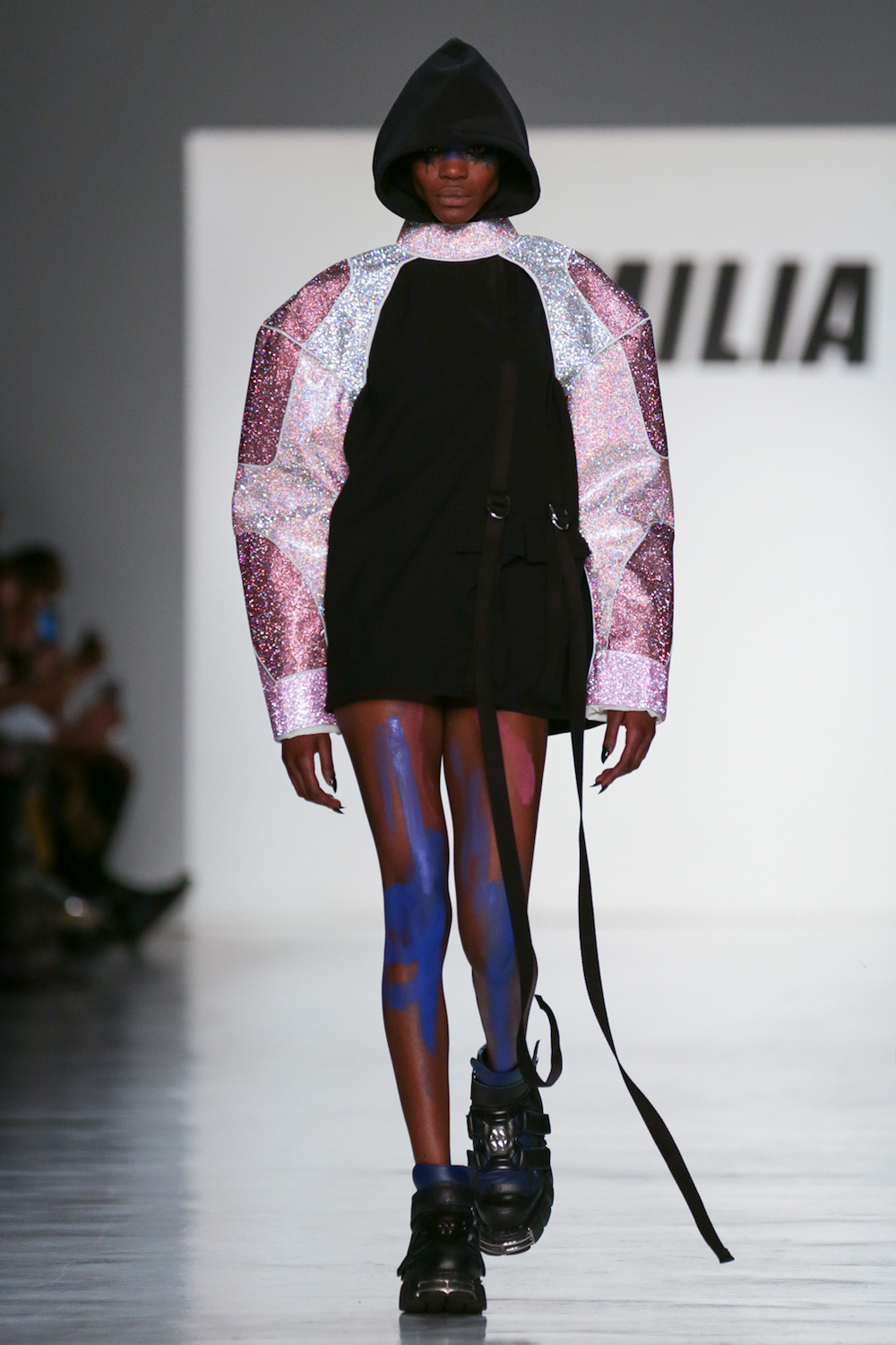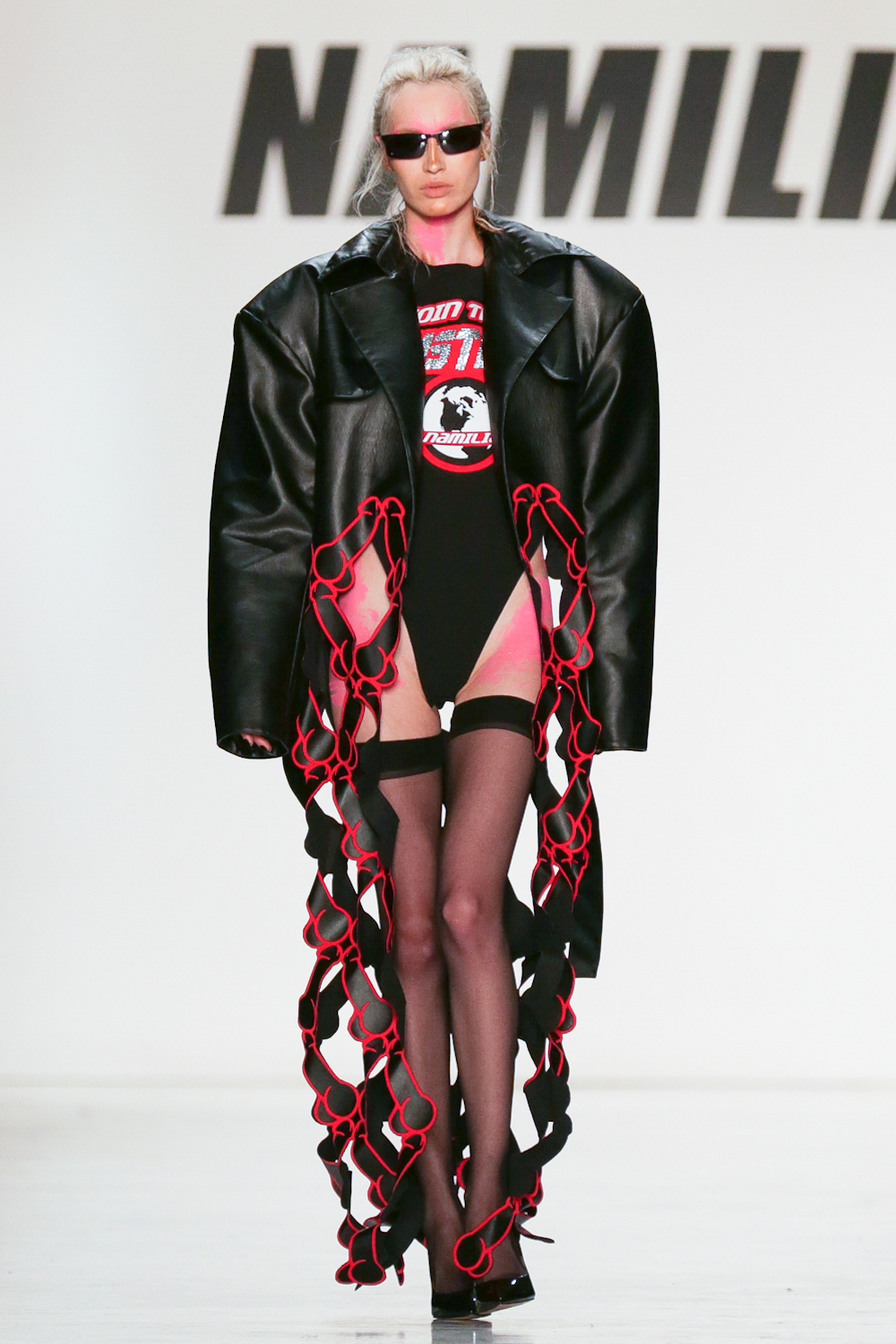 The Namilia autumn/winter 2017 collection followed a colour scheme of silver, red, black, purple, and orange. The bright neon colours were truest in the trimmings of a fire addition and in the cross layering of the bottom of a short set and leather jacket. The fire look was the most dramatic when these additions and trimmings would drag along behind the model.