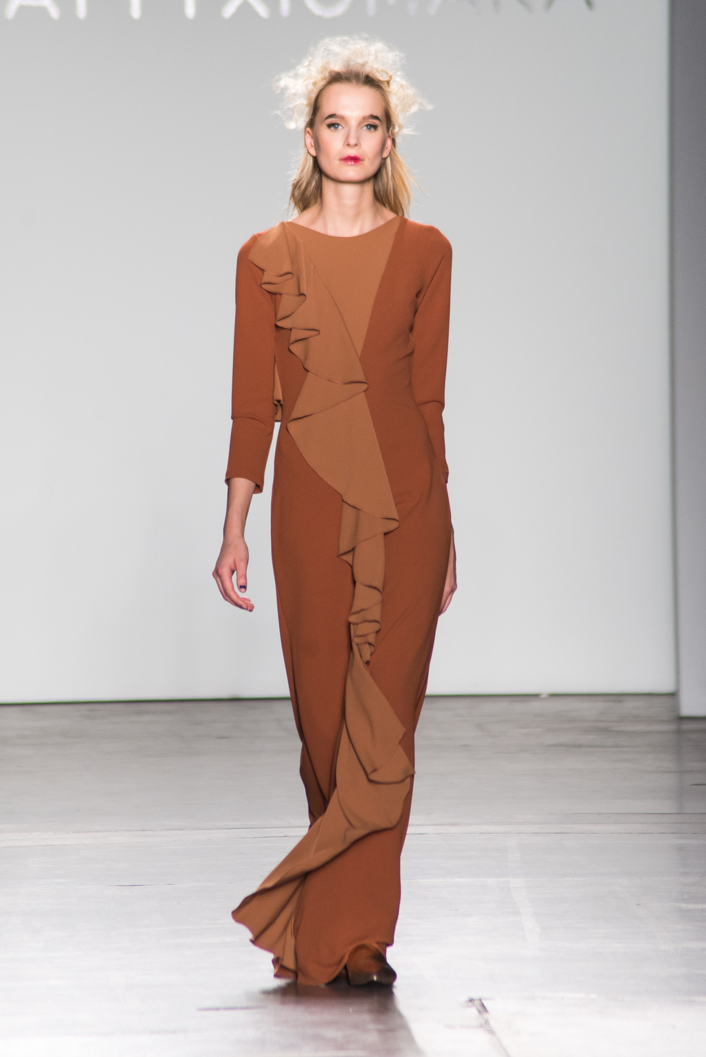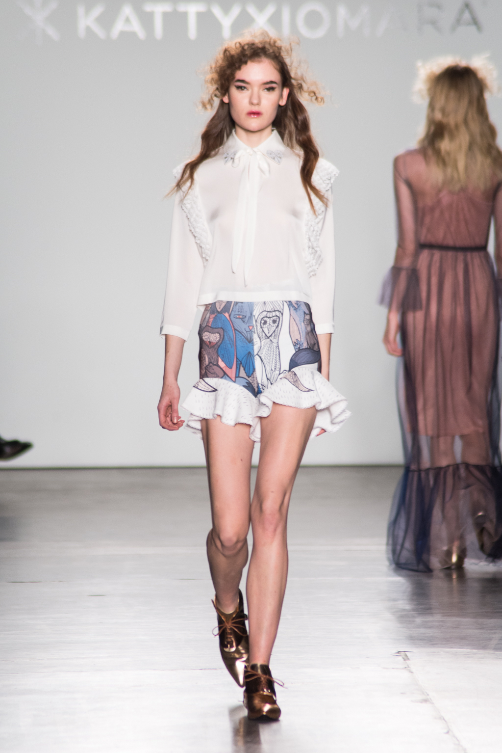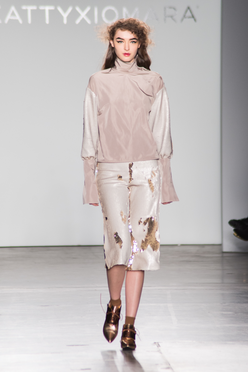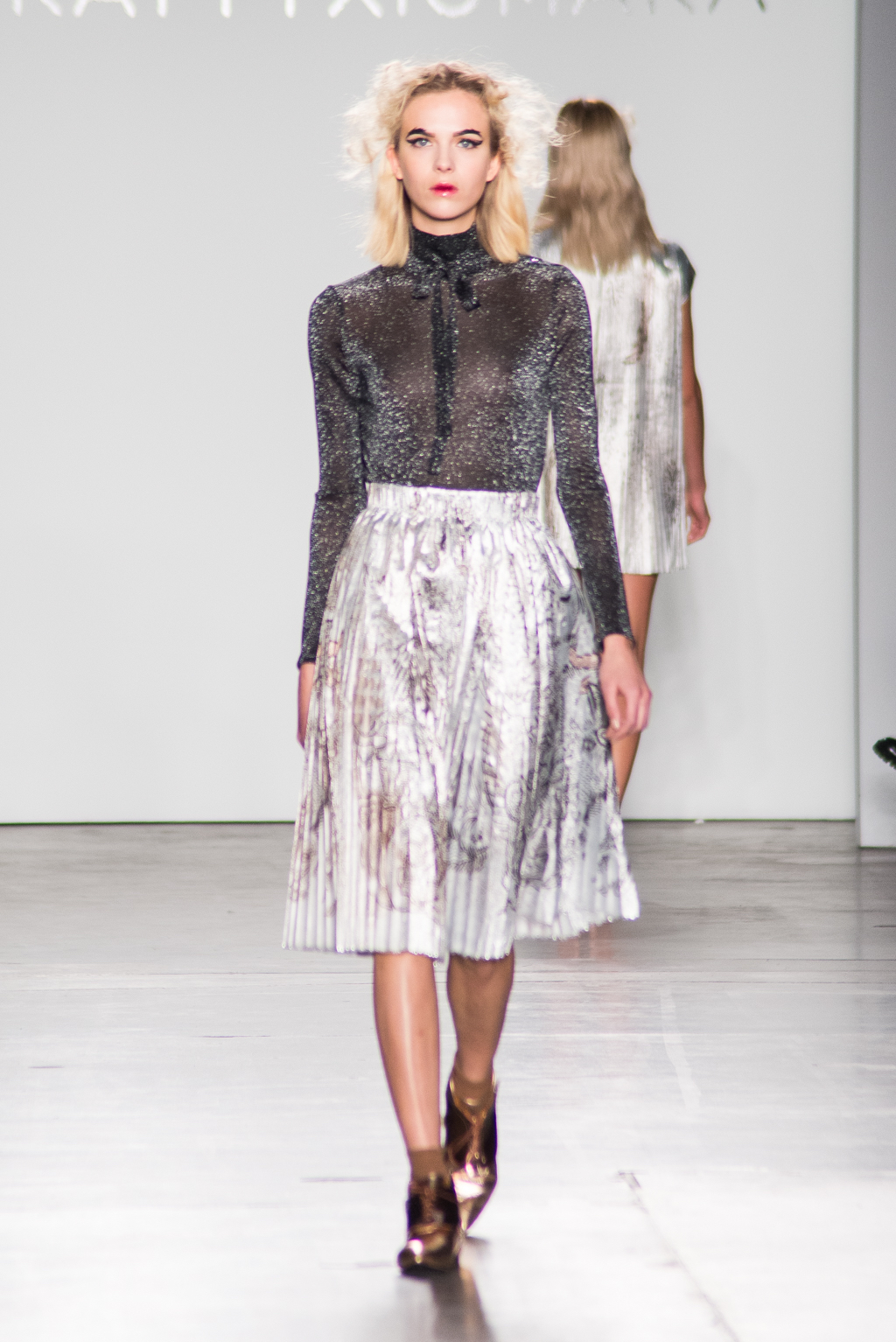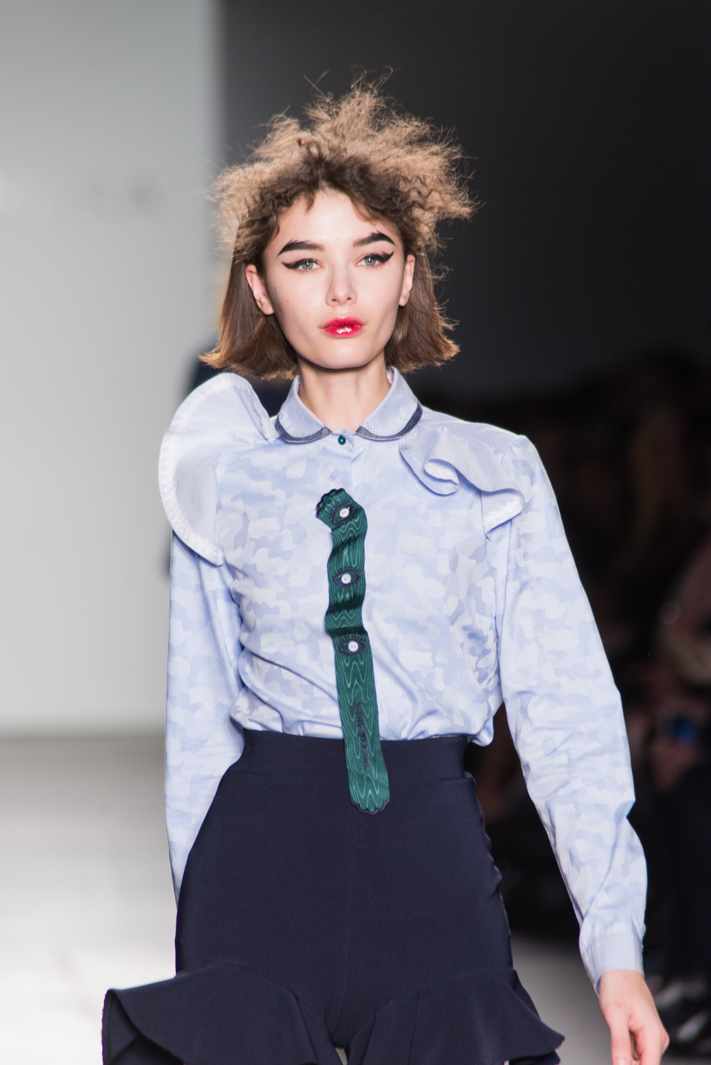 An ultra feminine edge was the point of focus for designer Katty Xiomara. Her designs were perfectly complimented by intense geometric eye make-up with pink, dewy lips and textured hair styling. The whole ensemble exuded an air of sophisticated modernism while retaining a romantic, sensual nature.