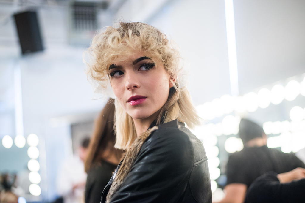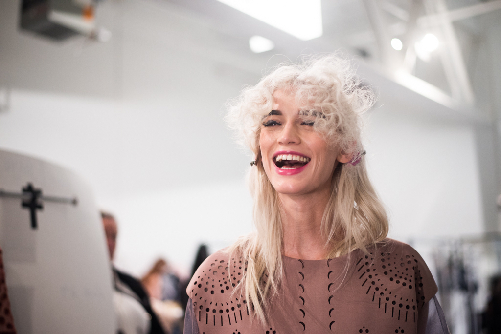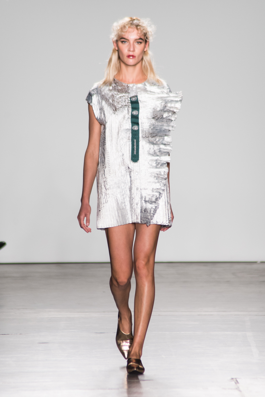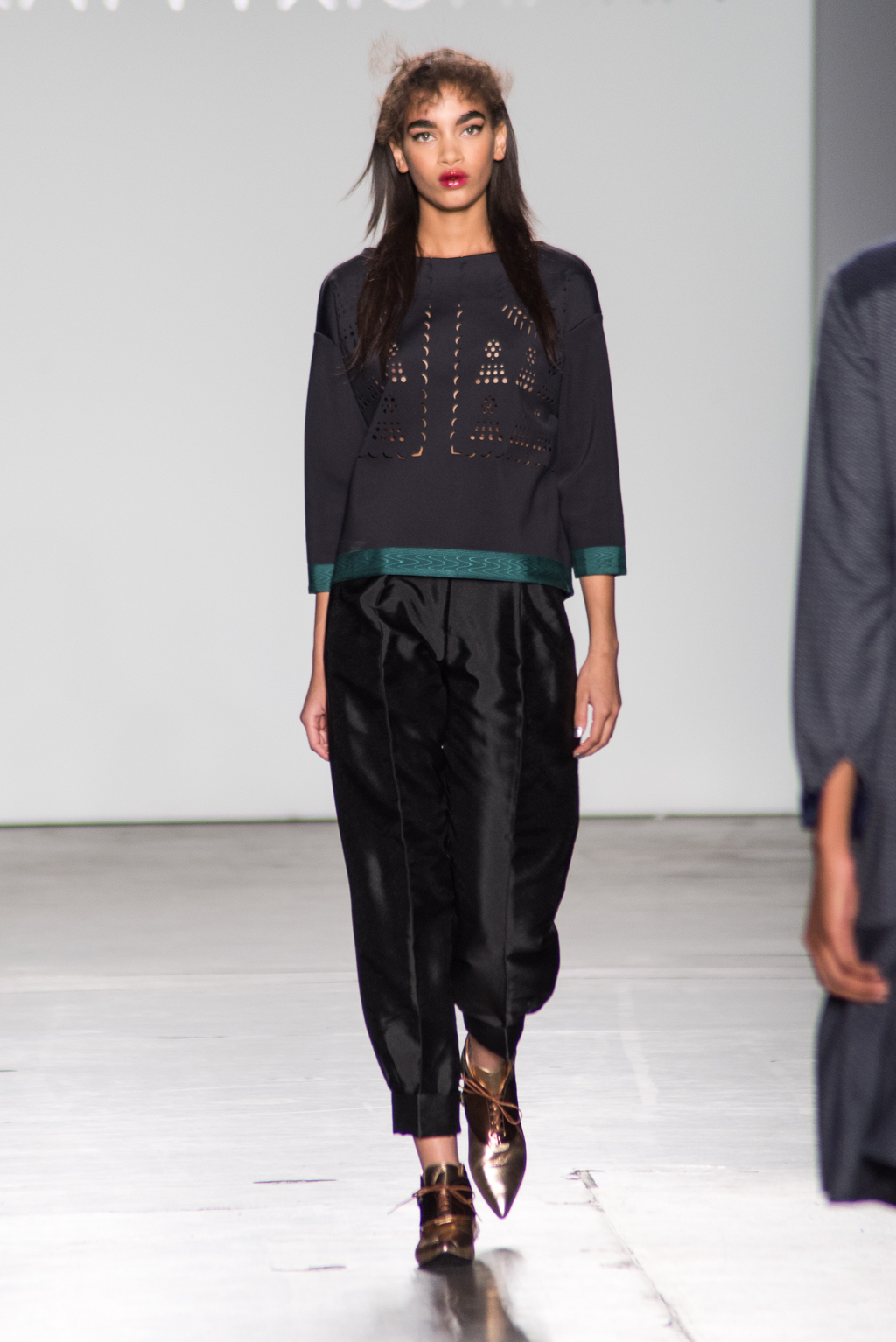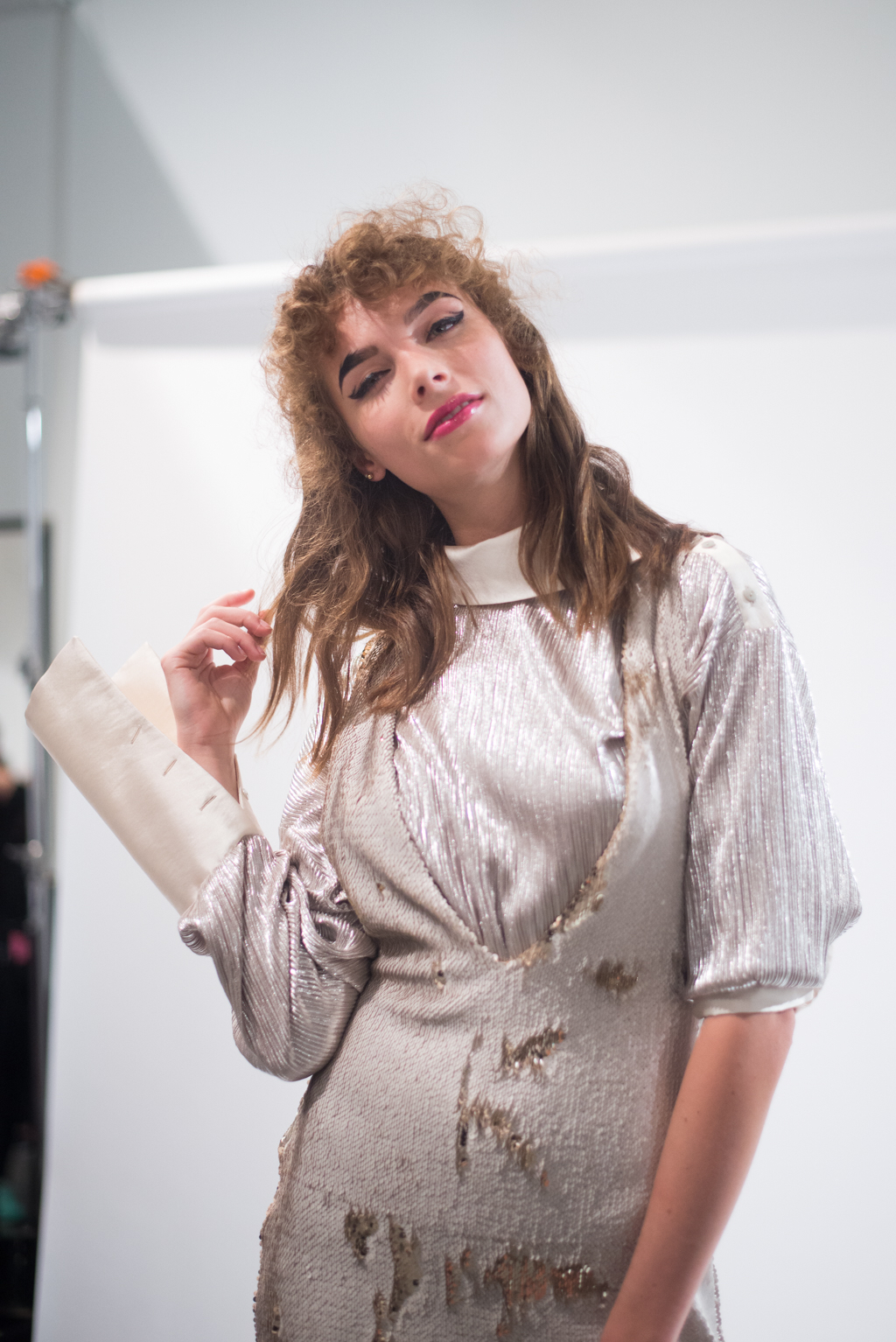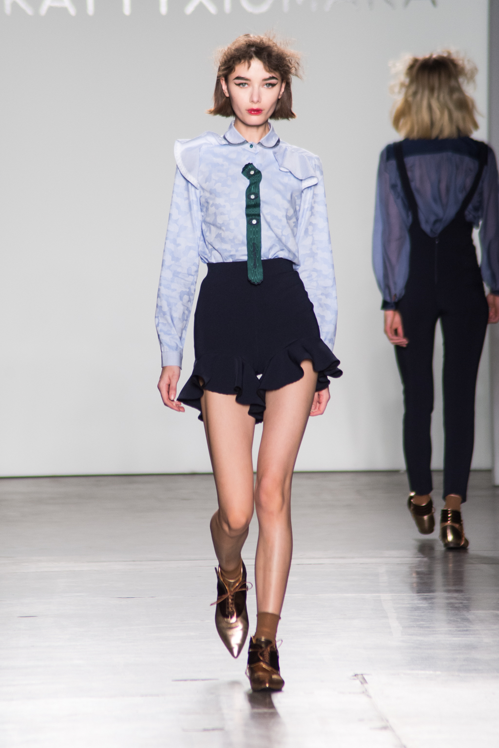 An ultra feminine edge was the point of focus for designer Katty Xiomara. Her designs were perfectly complimented by intense geometric eye make-up with pink, dewy lips and textured hair styling. The whole ensemble exuded an air of sophisticated modernism while retaining a romantic, sensual nature.