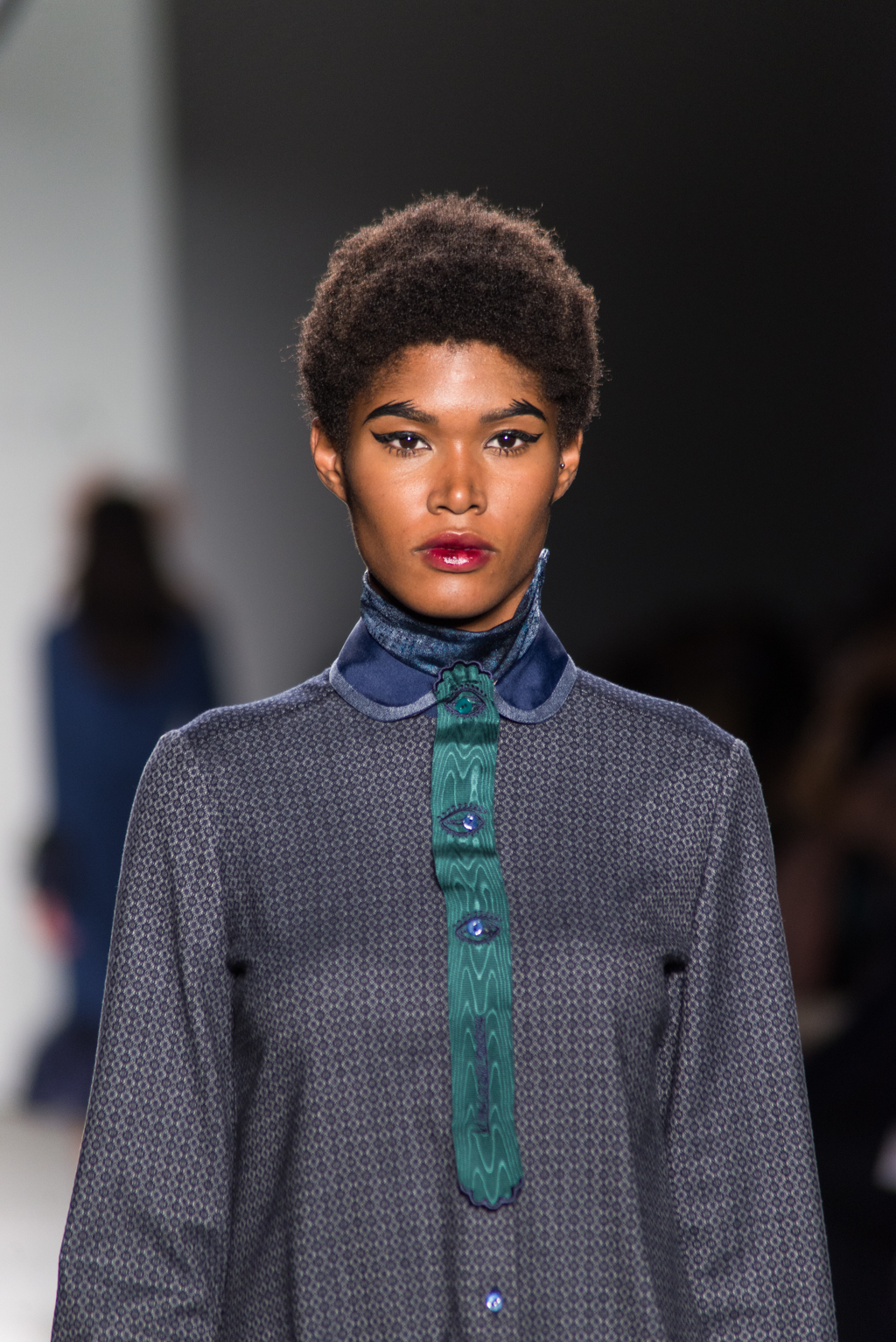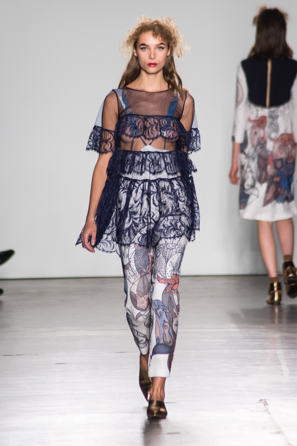 Playful graphic print was embedded in a number of looks. The animal and nature inspired graphic pattern is detailed in a patterned overall with a navy blue lace overlay. One would think that these two patterns may be a mishap when merged; however, the combination of the two works surprisingly well together and compliment one another amazingly. The pattern of the blue lace moves effortlessly into the intricate detail of the graphic print. The flow is seamless between these two aspects.
