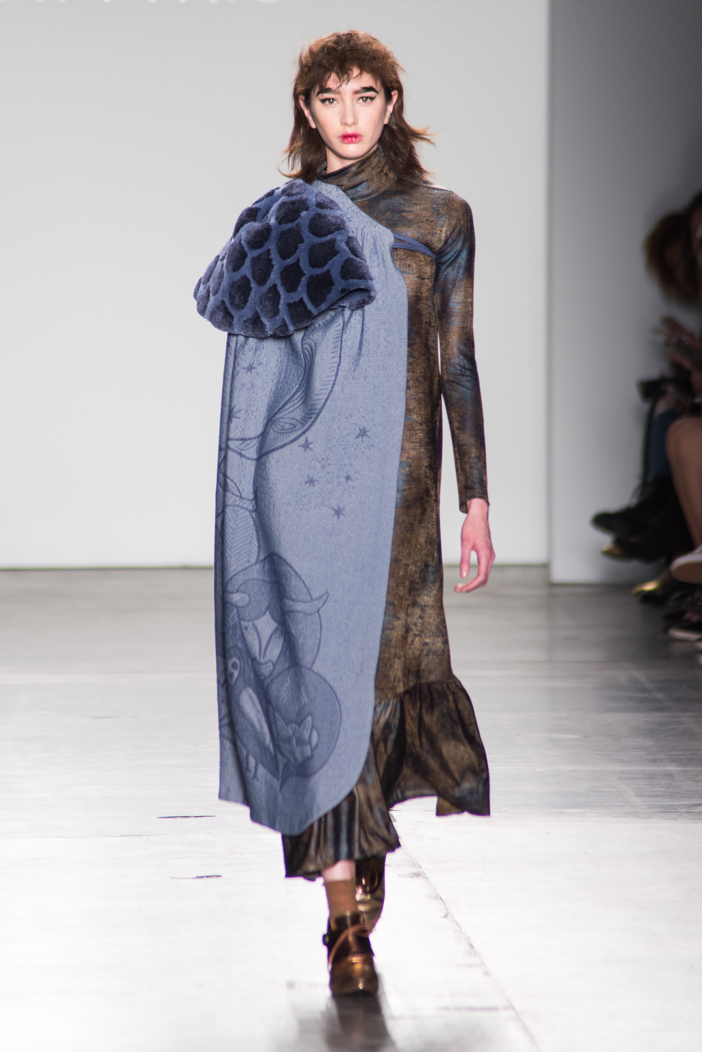 Xiomara’s ability to create cohesion between different fabrics is specified in the long sleeve turtle-neck brown and blue dress that was paired with a light blue cape and plush shoulder detailing. The metallic hue of the dress works with the contrasting blue coat. The organic flow between the brown and blue in the dress is met in sharp contrast to the illustrated design on the cape. This cape, too, has opposing personalities: the blue design base is met with a fluffy, spotted shoulder detail. Although these elements are seemingly contrasting within the look itself, Xiomara’s keen eye for design is able to refine these elements and incorporate unity in relation to one another.