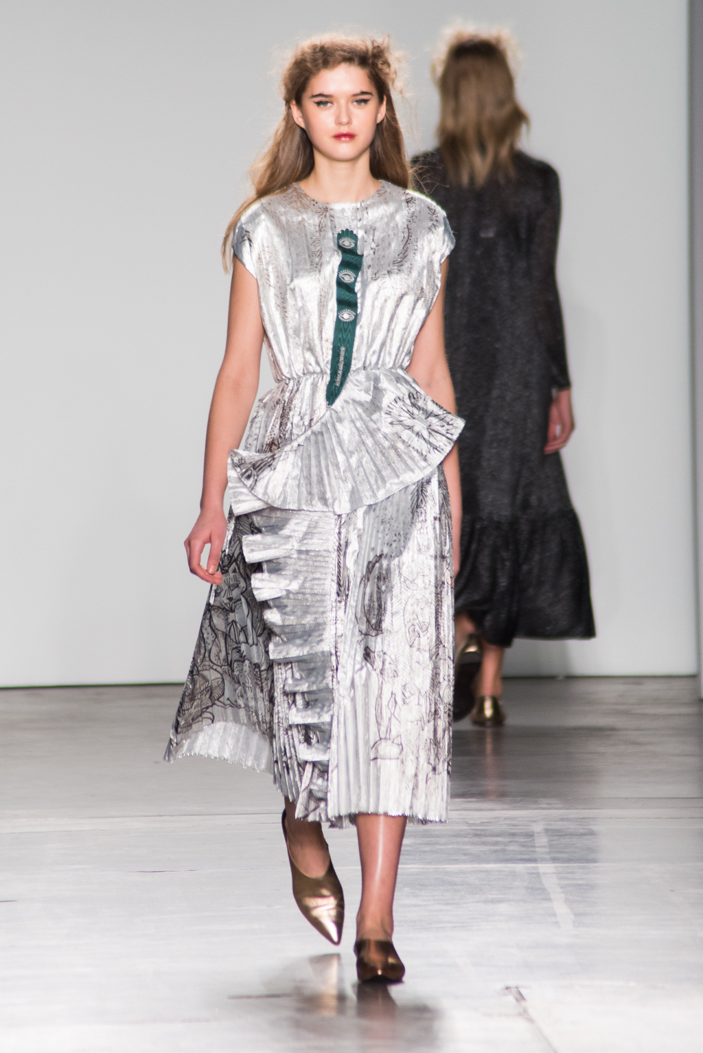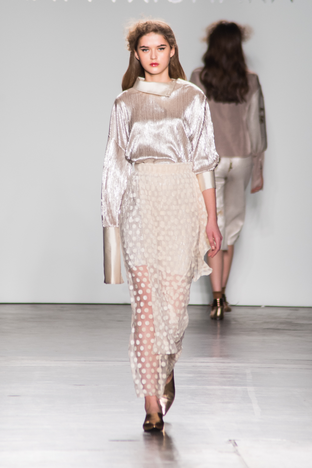 It was sequins on sequins for the first look that hit the runway. The beige sequin dress was layered on a sequin top with satin collar and wrist detailing. Xiomara manipulated the sequins to reflect light in different ways and therefore appearing in slightly different beige colours, and this effect caused a pattern of sorts. The ultra reflectivity paired with the high sheen of satin was a stimulating combination. This nature was sensualised with the exaggerated V-neckline; however, no skin was revealed thus adding an intrigue with this romantic element.