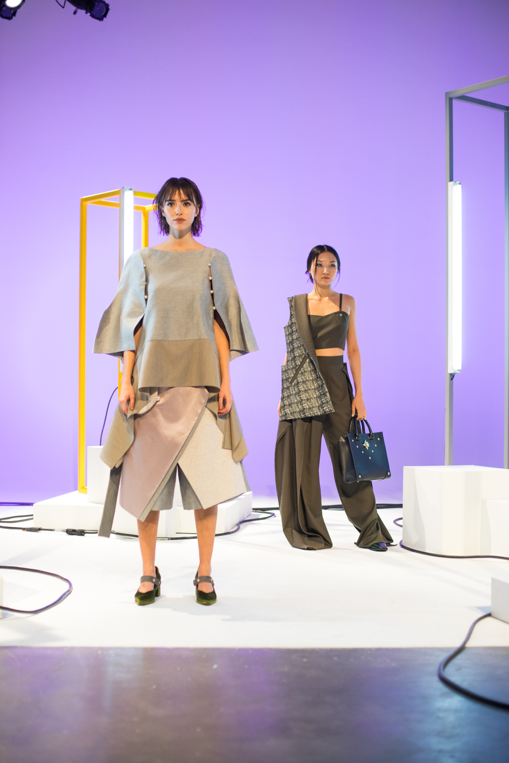 Lujin Zhang’s autumn/winter 2017 collection followed a colour scheme of silver, red, black, purple, and orange. The bright neon colours were truest in the trimmings of a fire addition and in the cross layering of the bottom of a short set and leather jacket. The fire look was the most dramatic when these additions and trimmings would drag along behind the model.