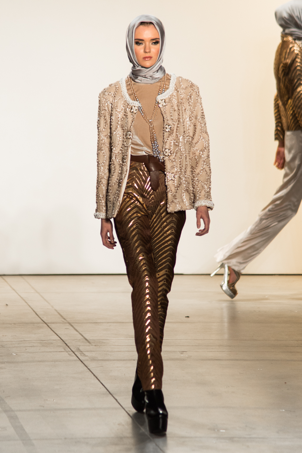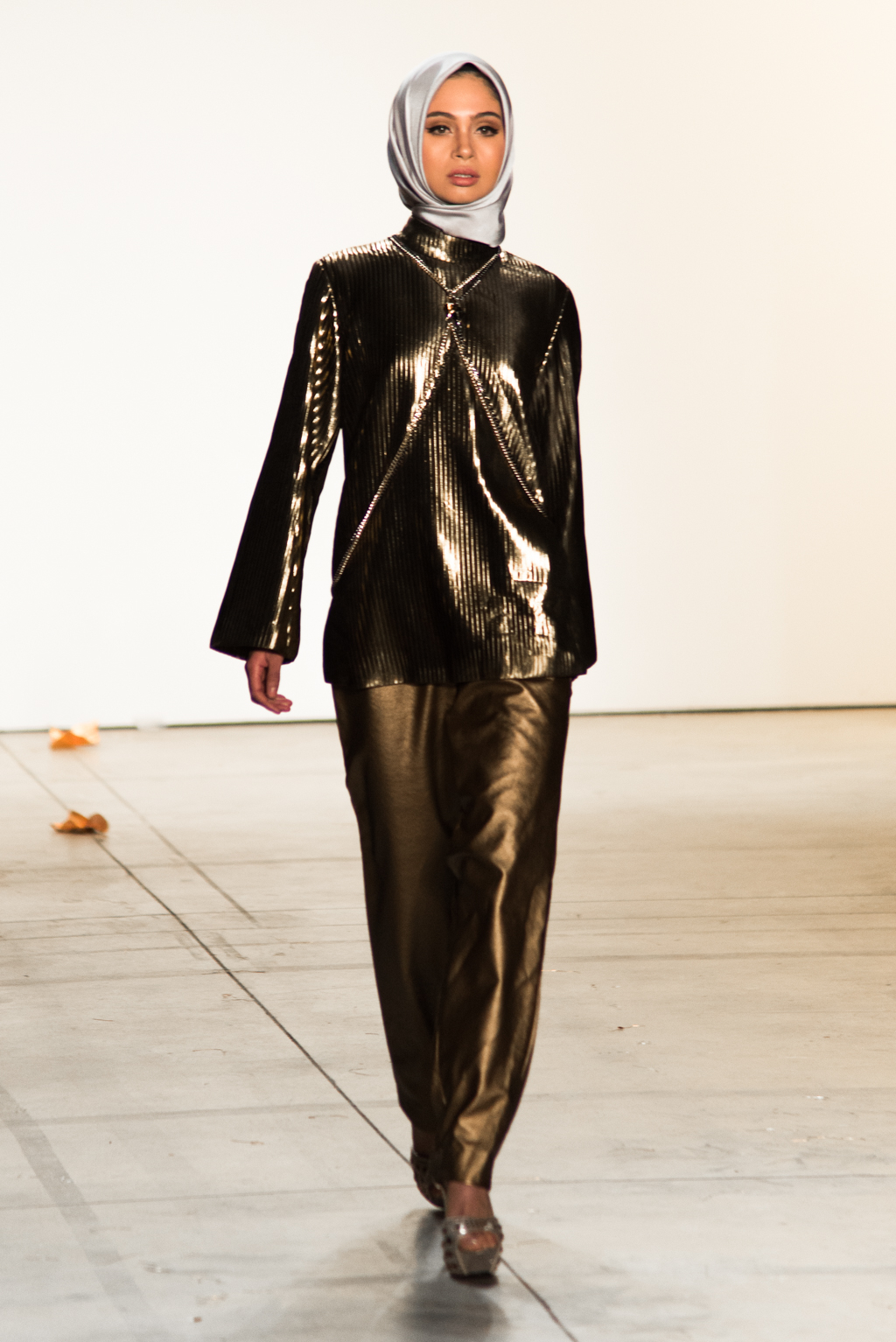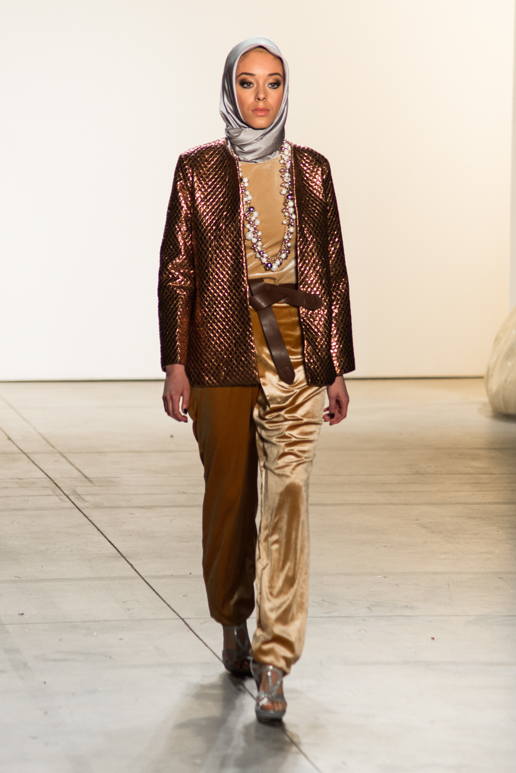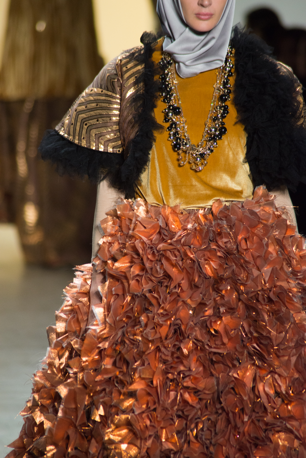 The Indonesian designer continues to pair each outfit with a headscarf, presenting us a pride in her religion. Foiling, pleats, jacquard and sequins were mixed and matched. The classic, dynamic and modern collection also features winter gloves designed by Swarovski, featuring pearls and beads. Warm, bold colours were used, including shades of bronze, silver, gold and broken white. These colours present women as pure, strong, confident, and gracious.