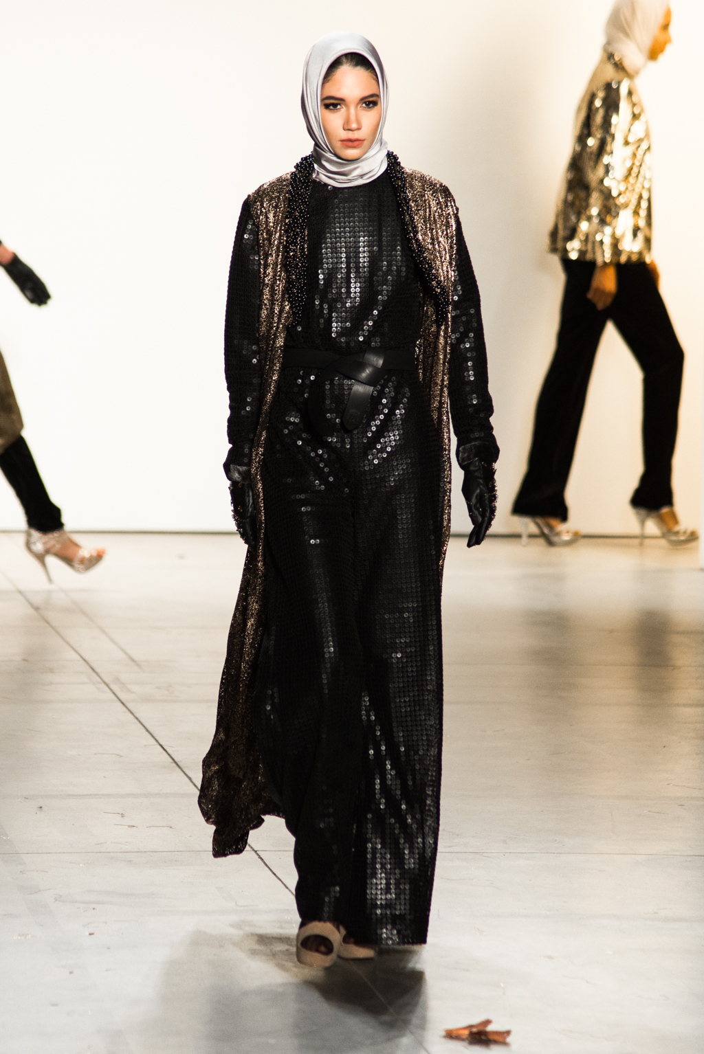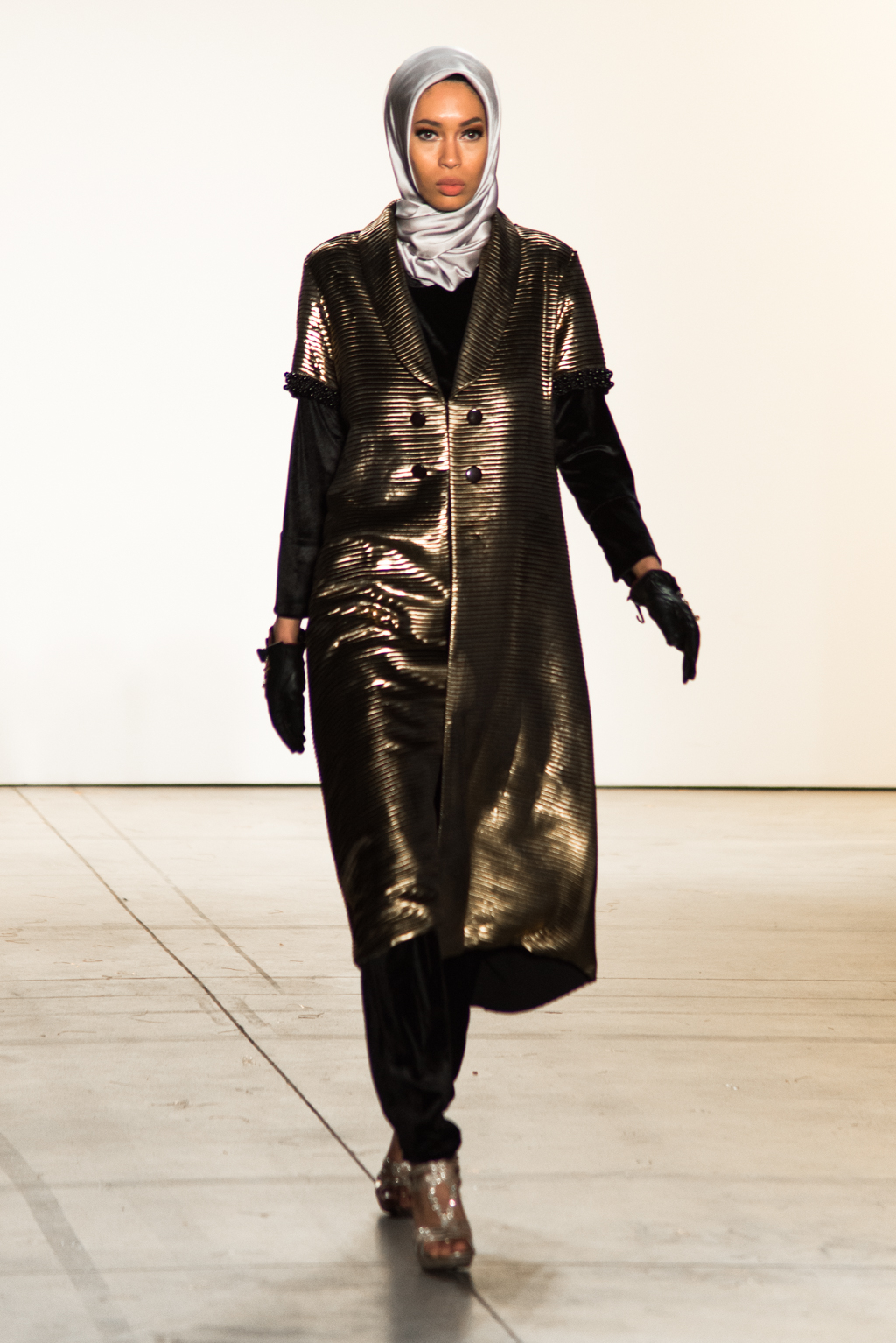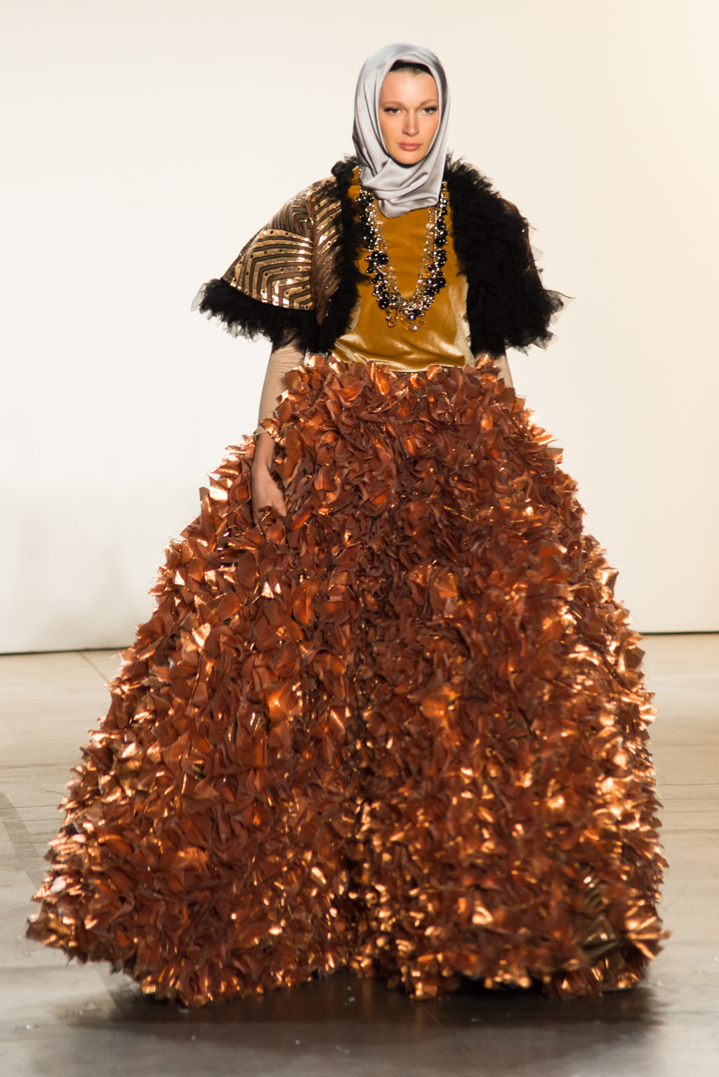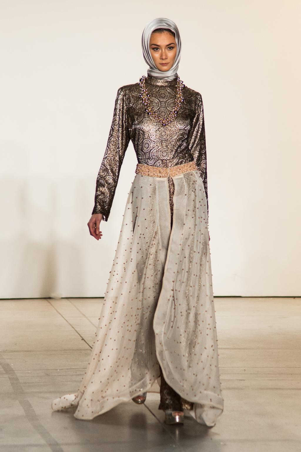 The Indonesian designer continues to pair each outfit with a headscarf, presenting us a pride in her religion. Foiling, pleats, jacquard and sequins were mixed and matched. The classic, dynamic and modern collection also features winter gloves designed by Swarovski, featuring pearls and beads. Warm, bold colours were used, including shades of bronze, silver, gold and broken white. These colours present women as pure, strong, confident, and gracious.