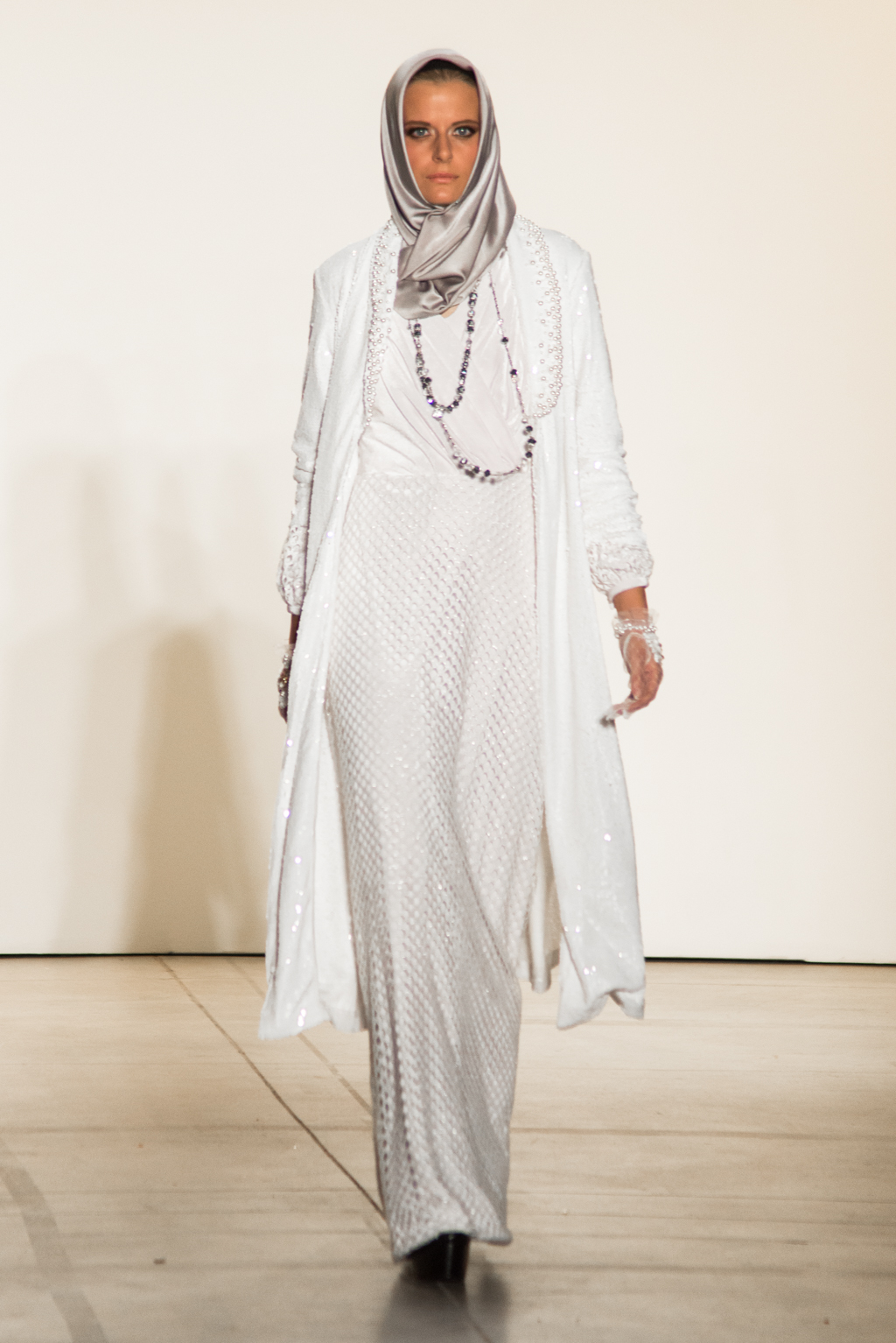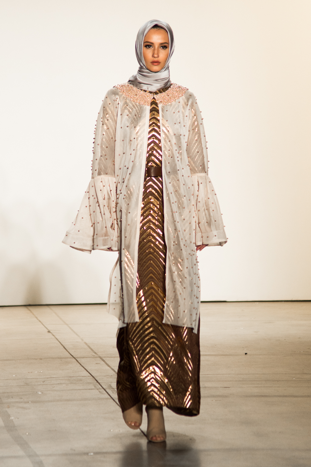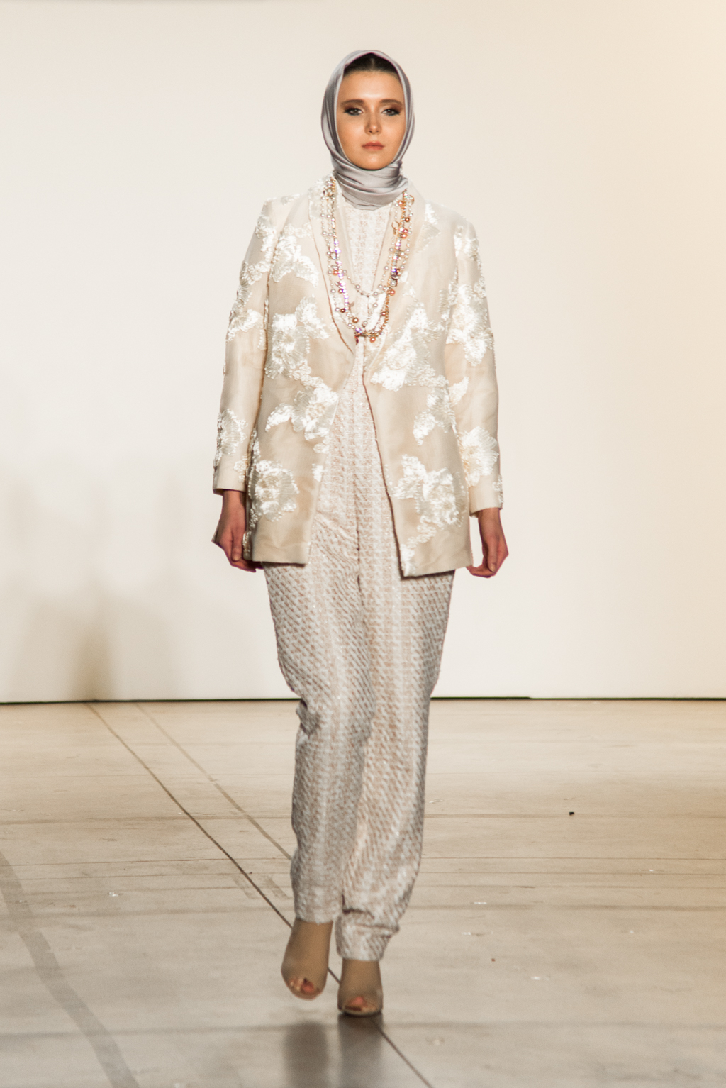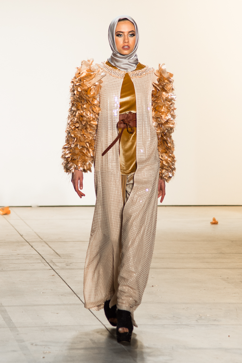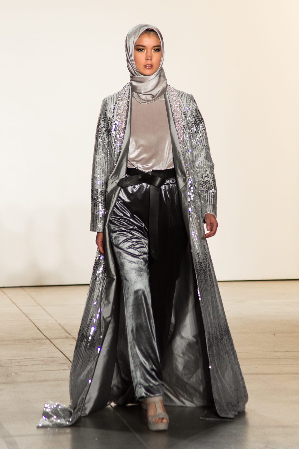 The Indonesian designer continues to pair each outfit with a headscarf, presenting us a pride in her religion. Foiling, pleats, jacquard and sequins were mixed and matched. The classic, dynamic and modern collection also features winter gloves designed by Swarovski, featuring pearls and beads. Warm, bold colours were used, including shades of bronze, silver, gold and broken white. These colours present women as pure, strong, confident, and gracious.