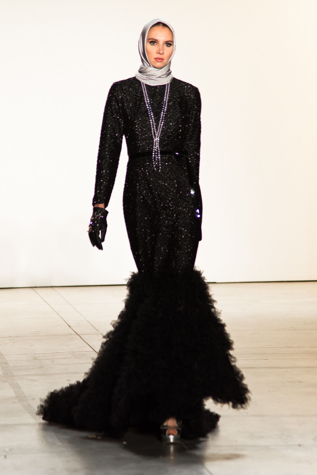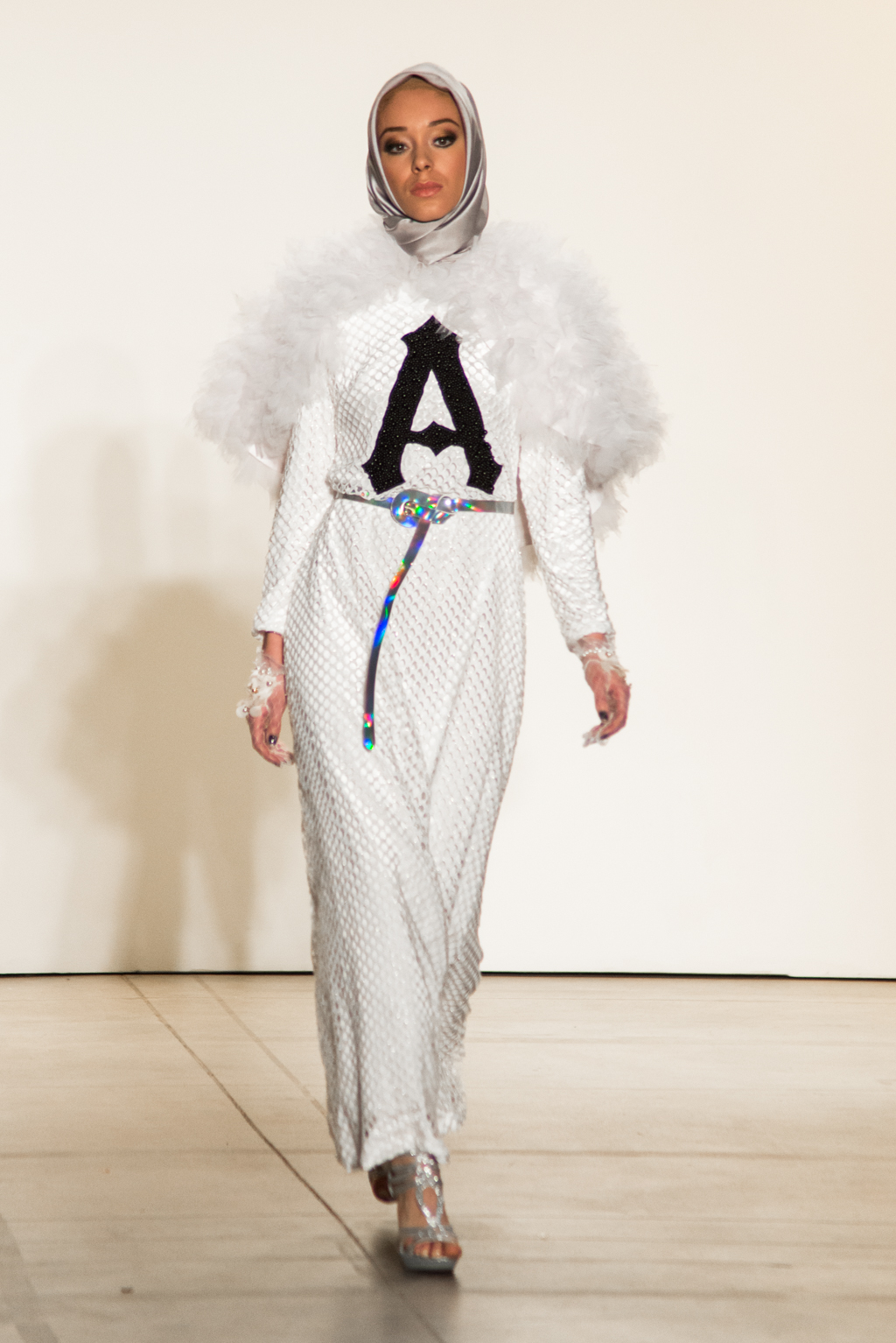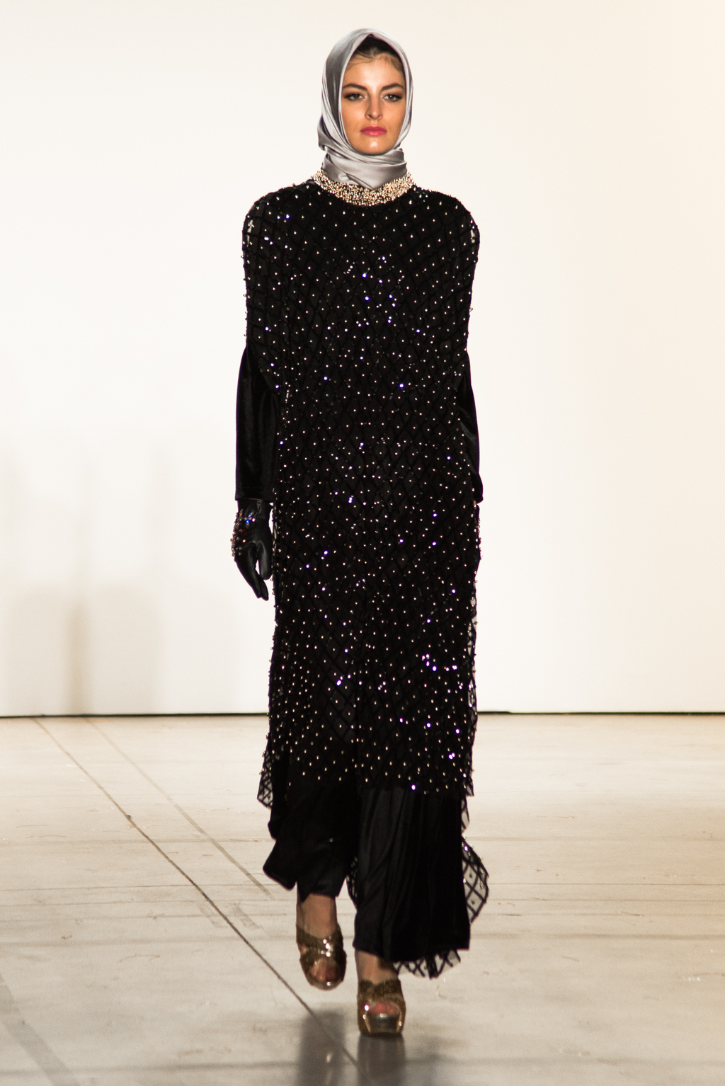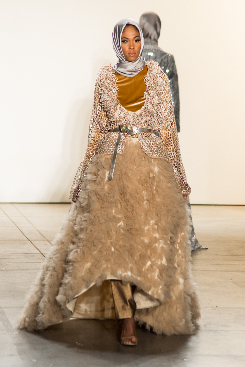 The Indonesian designer continues to pair each outfit with a headscarf, presenting us a pride in her religion. Foiling, pleats, jacquard and sequins were mixed and matched. The classic, dynamic and modern collection also features winter gloves designed by Swarovski, featuring pearls and beads. Warm, bold colours were used, including shades of bronze, silver, gold and broken white. These colours present women as pure, strong, confident, and gracious.
