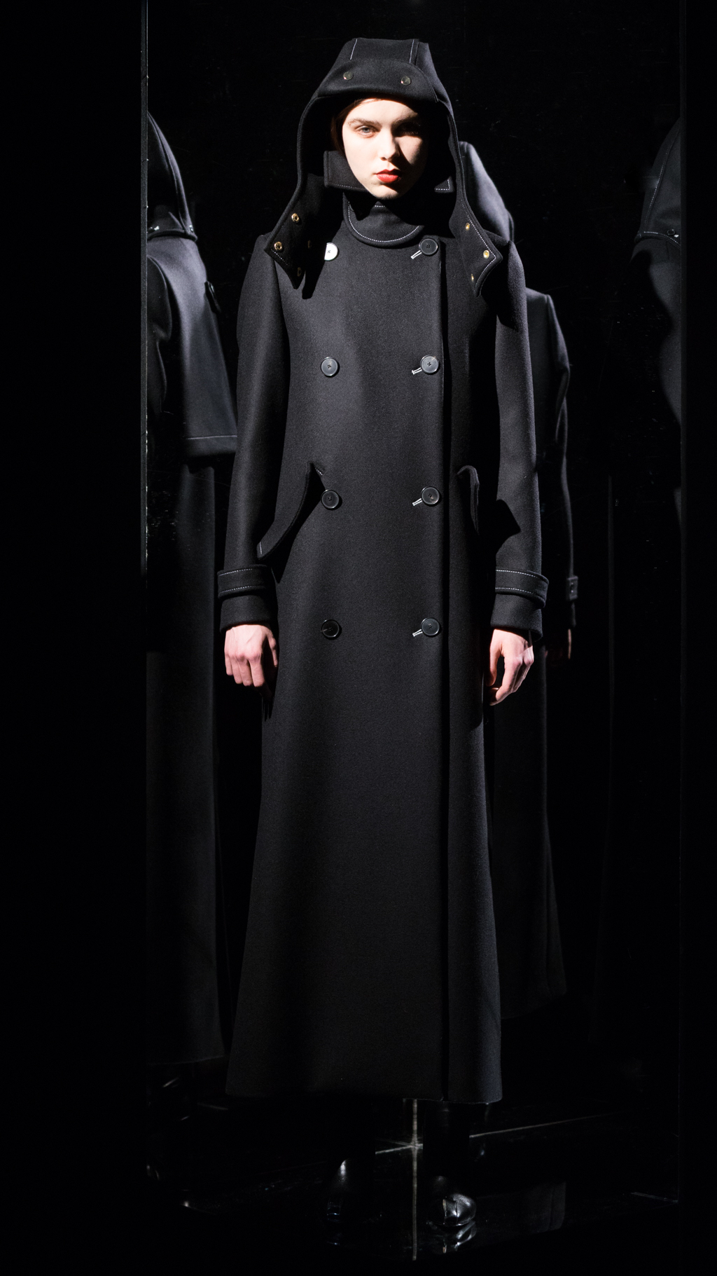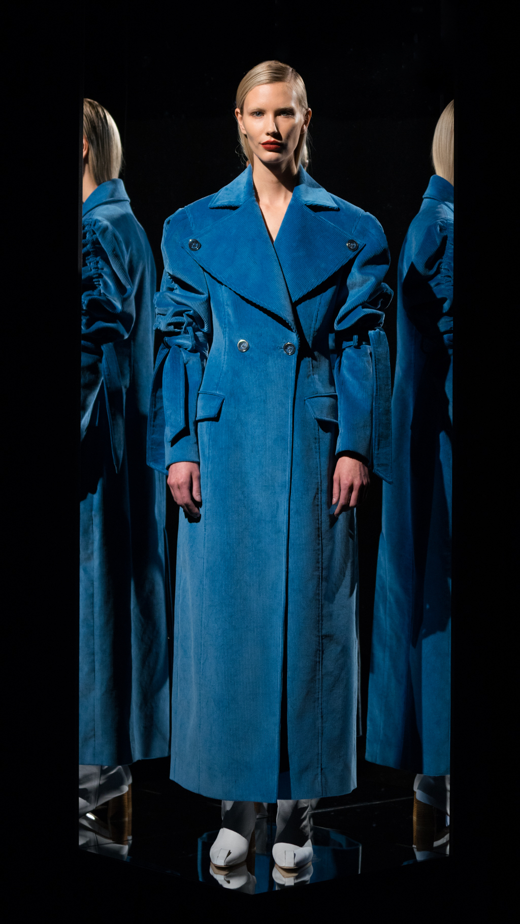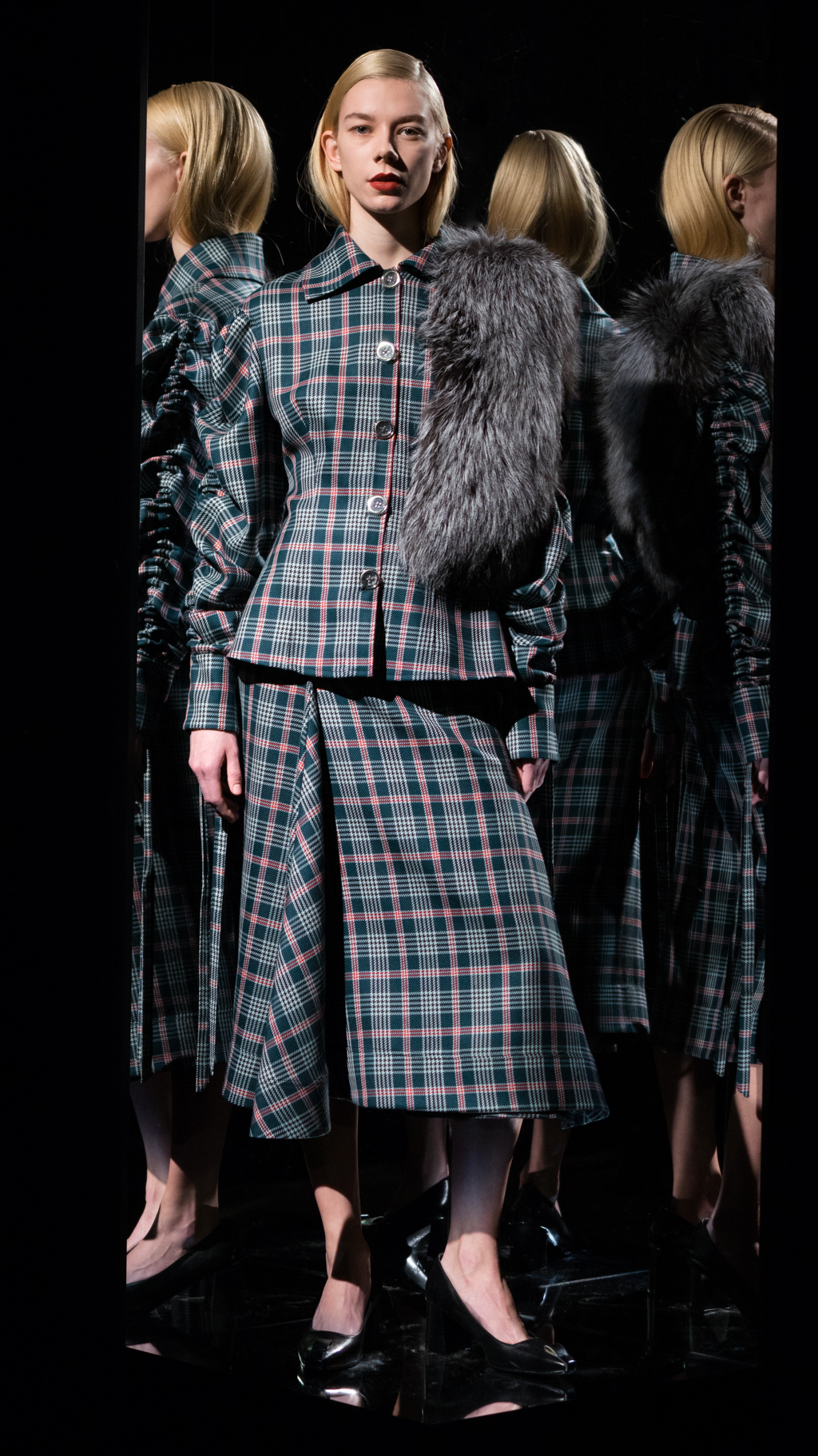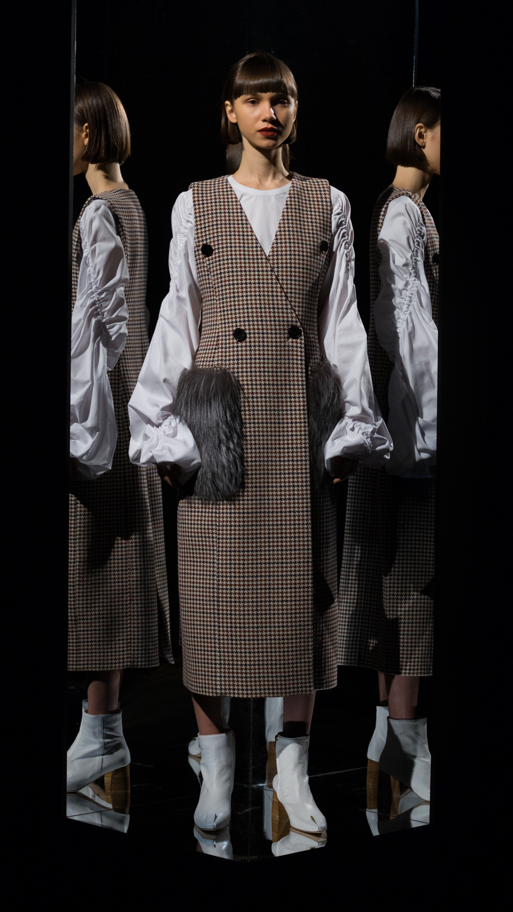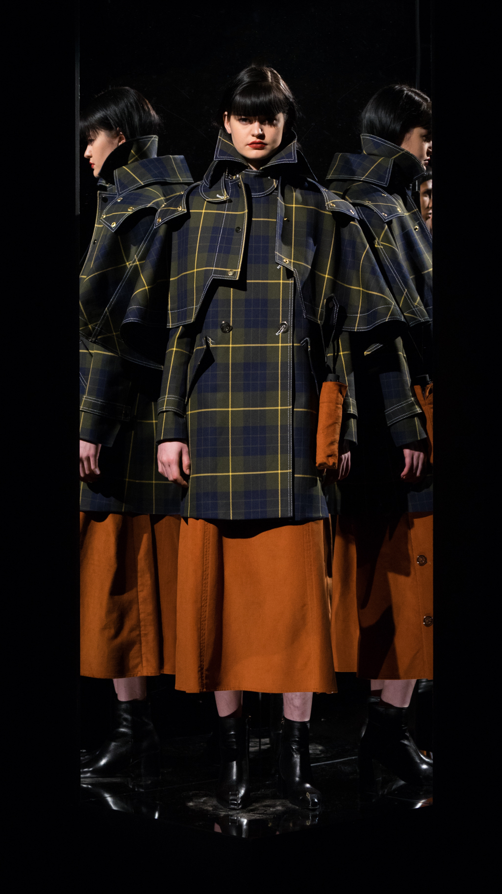 Atop of the rouched sleeves, the variety of overlays present were impeccable. From a vast array of plaid, corduroy and fur, each piece showcased a new vision. Specifically, a conspicuous combination was the use of a bold, deep, burgundy corduroy. The daring shade allowed for the plaid, mid-length, water-proof overcoat to align perfectly with the look. The importance of details upon the plaid, including the black horn buttons and hue arrangement displayed the delicacy of the style. The use of grey, olive green and a vibrant yellow of a raincoat granted access to the clean cut, bottom layer.
