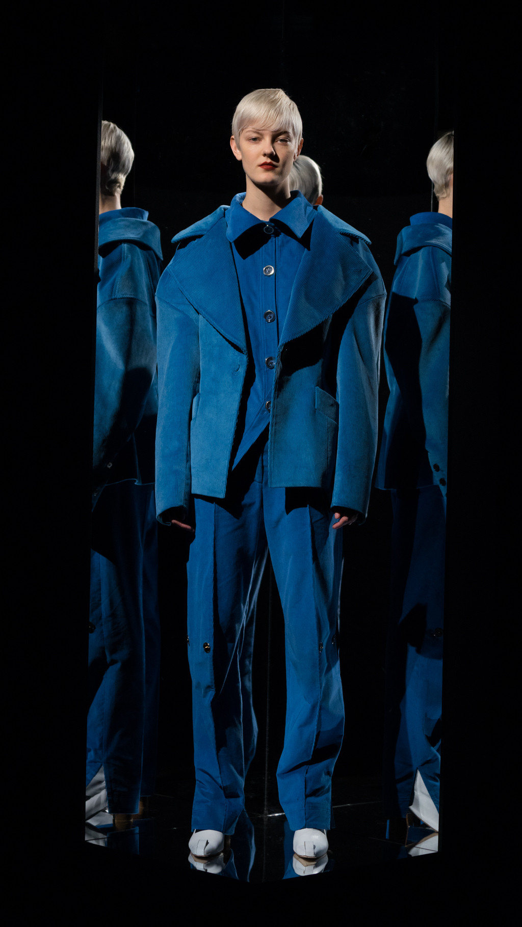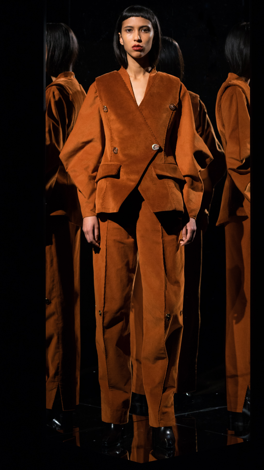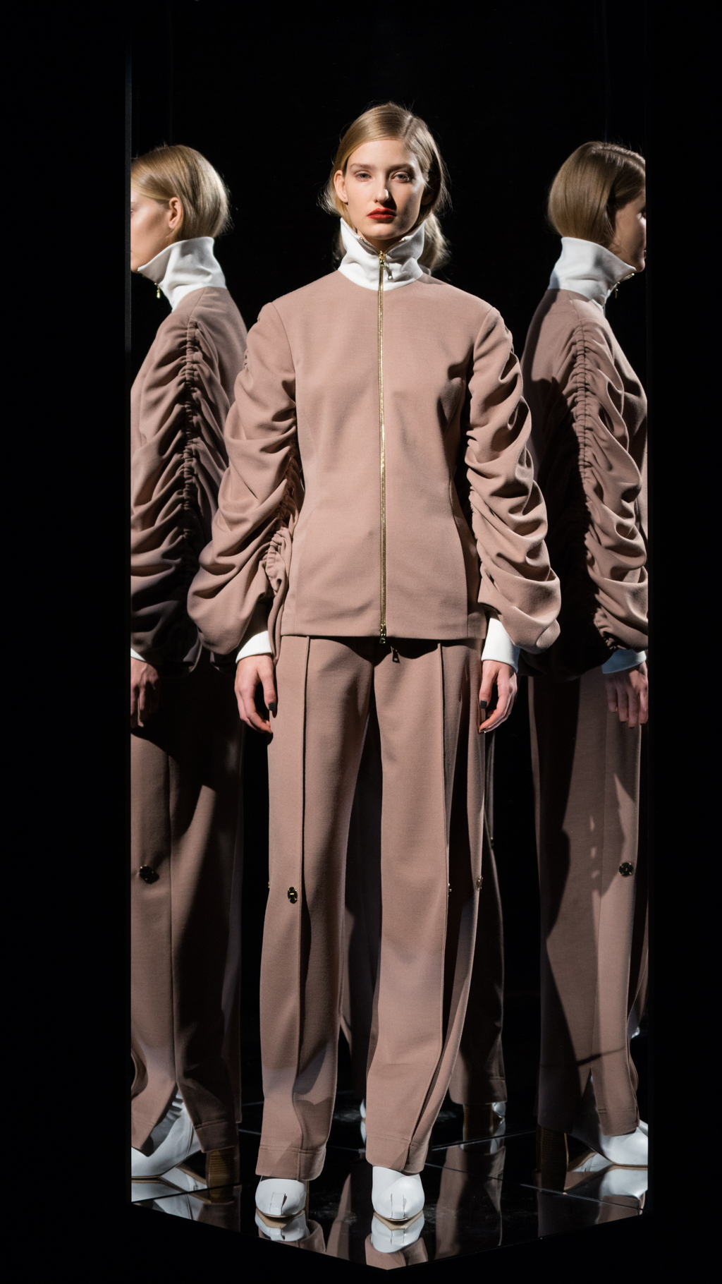 Alongside the shapes and complex arrangements, Li displayed some smoother, yet distinct items. A silk, cream, cuffed long sleeve blouse laid on the model and the rouching up the side provided a different ambience. In comparison to the more straightforward pieces, this looser look and bulkier wrists allowed for the trilateral top vest to shine.