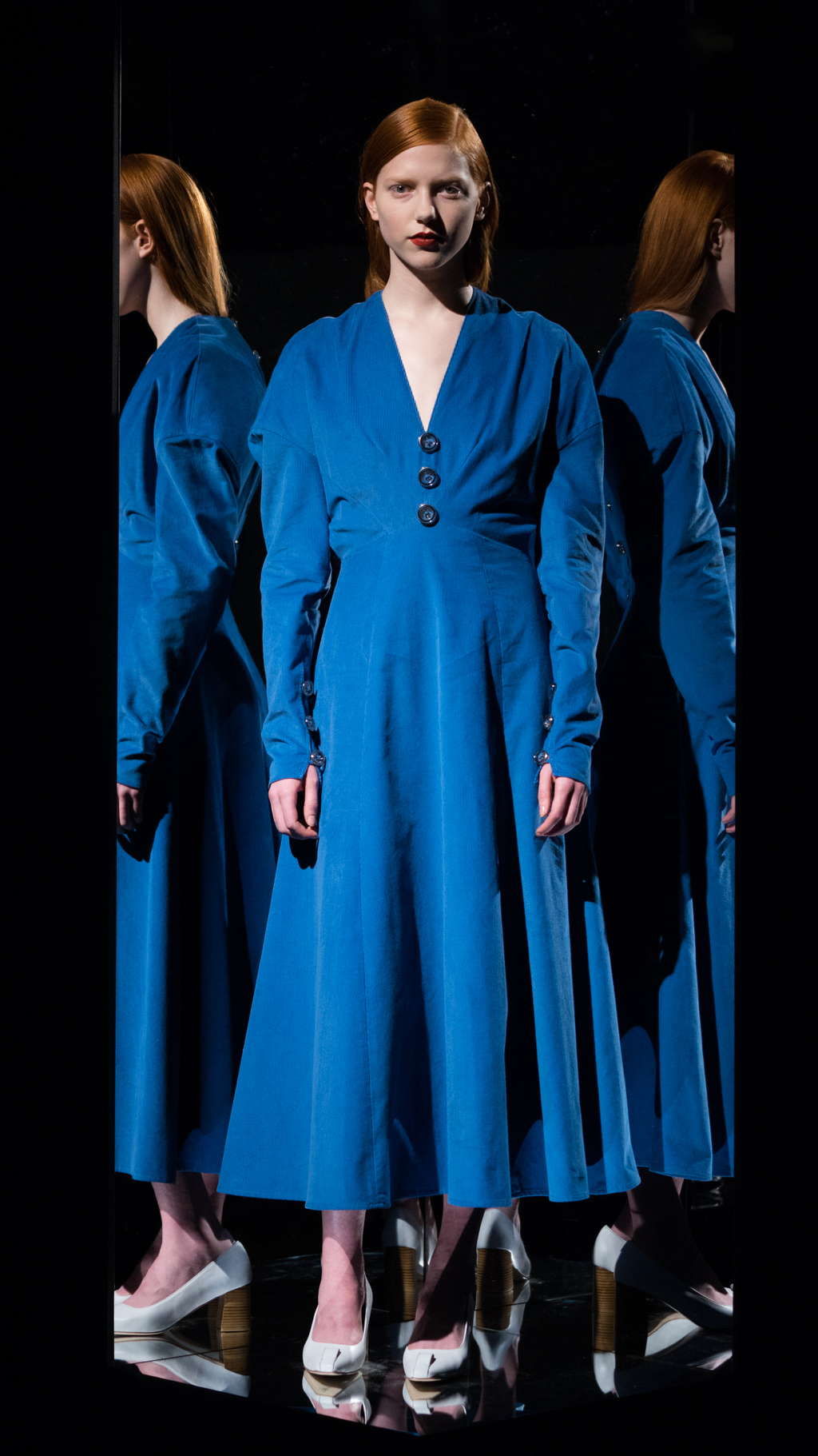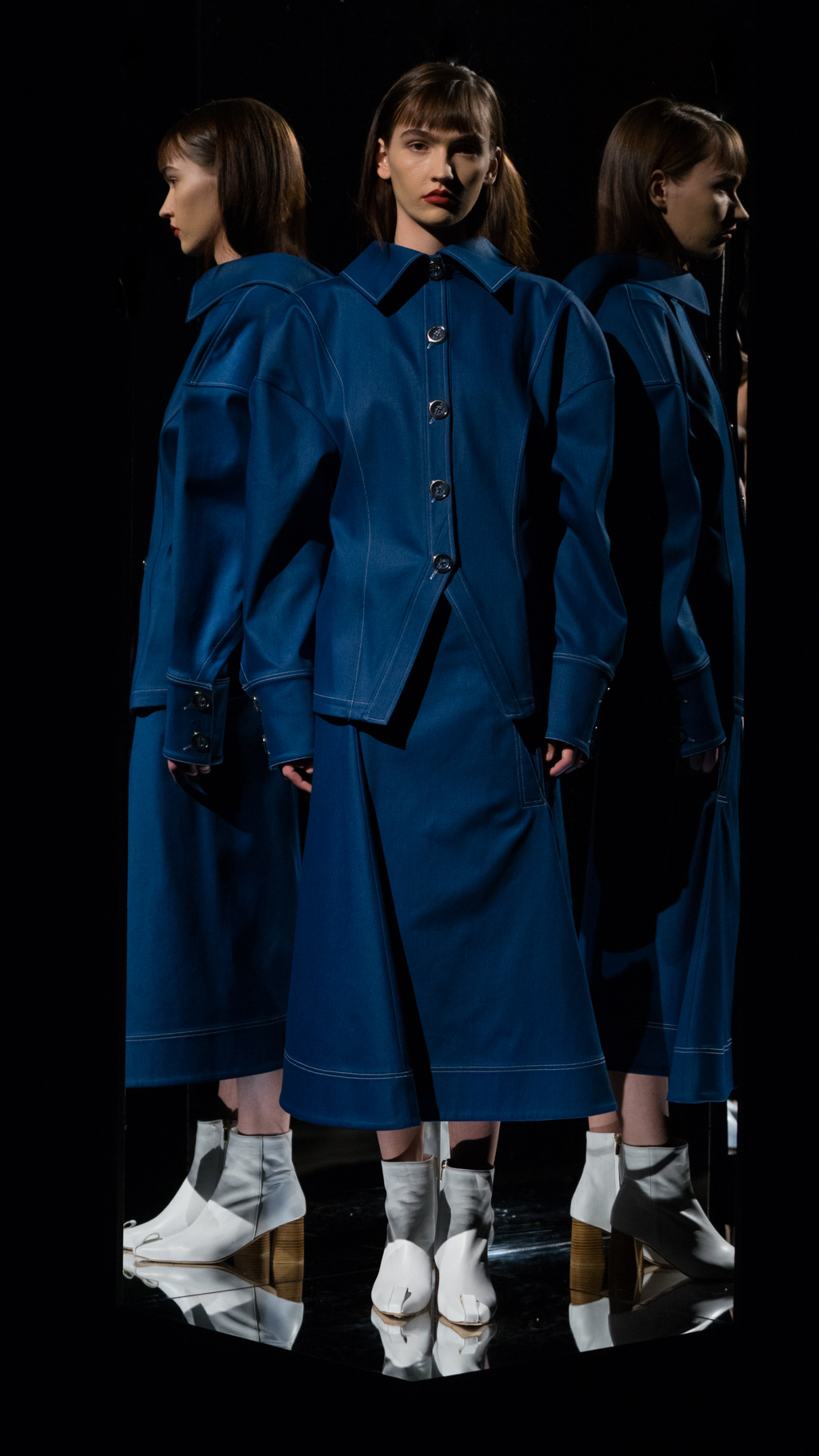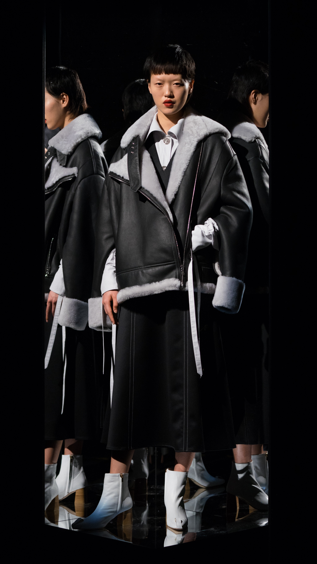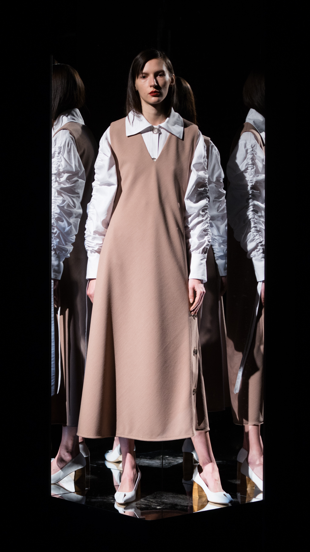 The simple, exquisite atmosphere and music allowed the audience to examine the delicate details of Li’s unique, yet mysterious display. The models’ smooth, natural make-up with a coordinating daring lip strengthened the techniques of Li’s work. The long, underlays shaped each model’s body by flowing right to the bone of the ankle, allowing for the discreet details of the shoes to shine. The capsule footwear collection was a prominent feature, with the smooth white texture and fine, three-inch wooden heel, showcased on its own, or paired with a geometric design.
