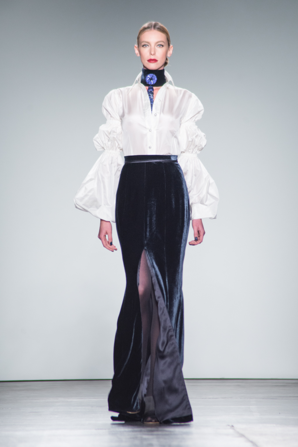 The modern took a sharp turn for vintage and classically inspired looks, as pantsuits and skirts began the transition to the couture gowns. A noted ensemble elicited applause, featured white silk taffeta gown with puffed sleeves that was paired with a slender royal blue velvet dress, which had a distinct Edwardian silhouette. This gave way to a similar outfit styled with trousers. A metallic blue curve clinging gown with crystalline epaulette embellishments was runway ready.
