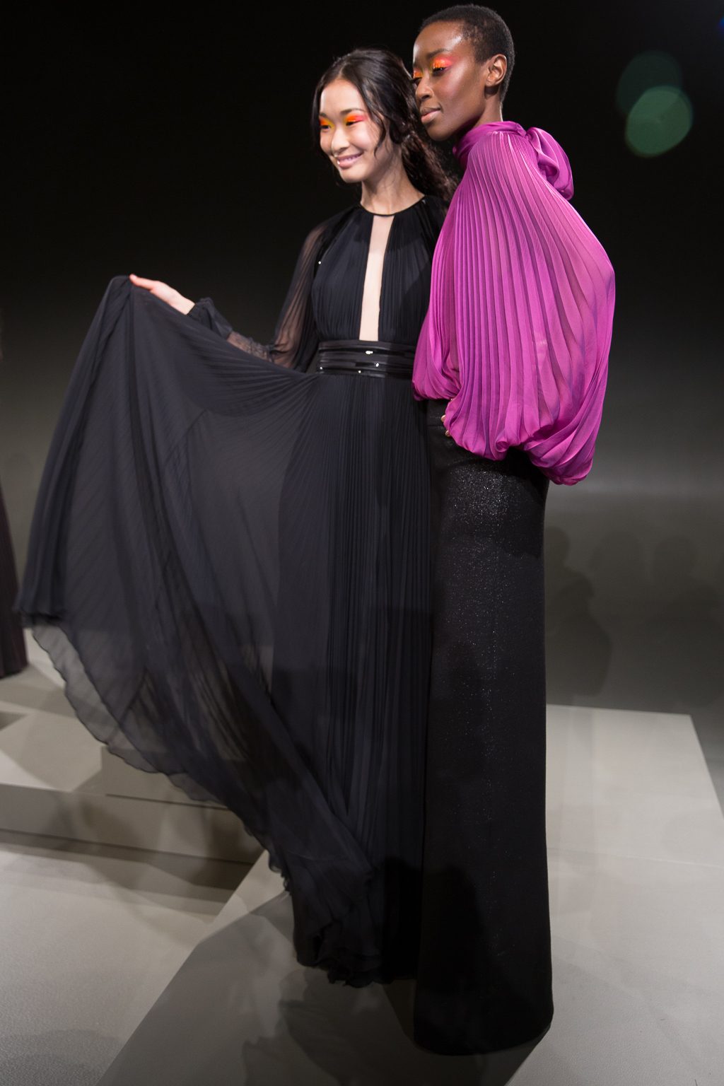 The sweeping floor-length accordion silk and chiffon gowns could also be seen with coordinating trousers and tops. Fun pleated pinks, fanned out with artful flair, were mirrored in the couture gowns nearby. Dramatic gowns in black of course were a mainstay, serving as a neutral springboard from which the richness of the other colours in the collection could emanate, several cinched with sparkly bead-embellished belts.