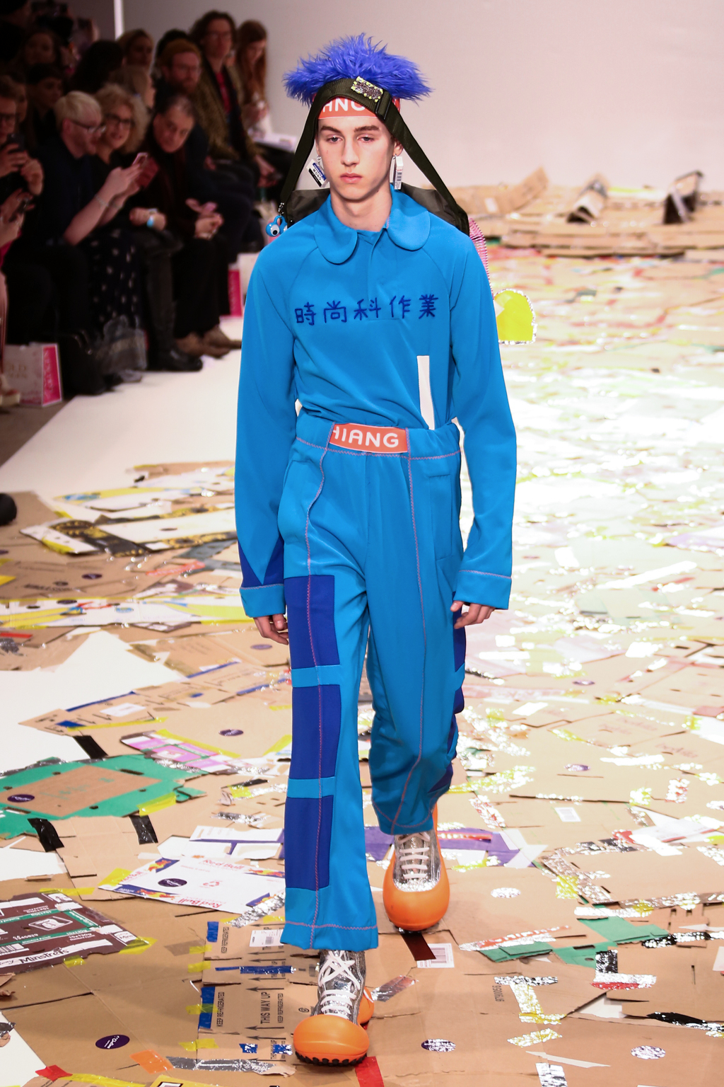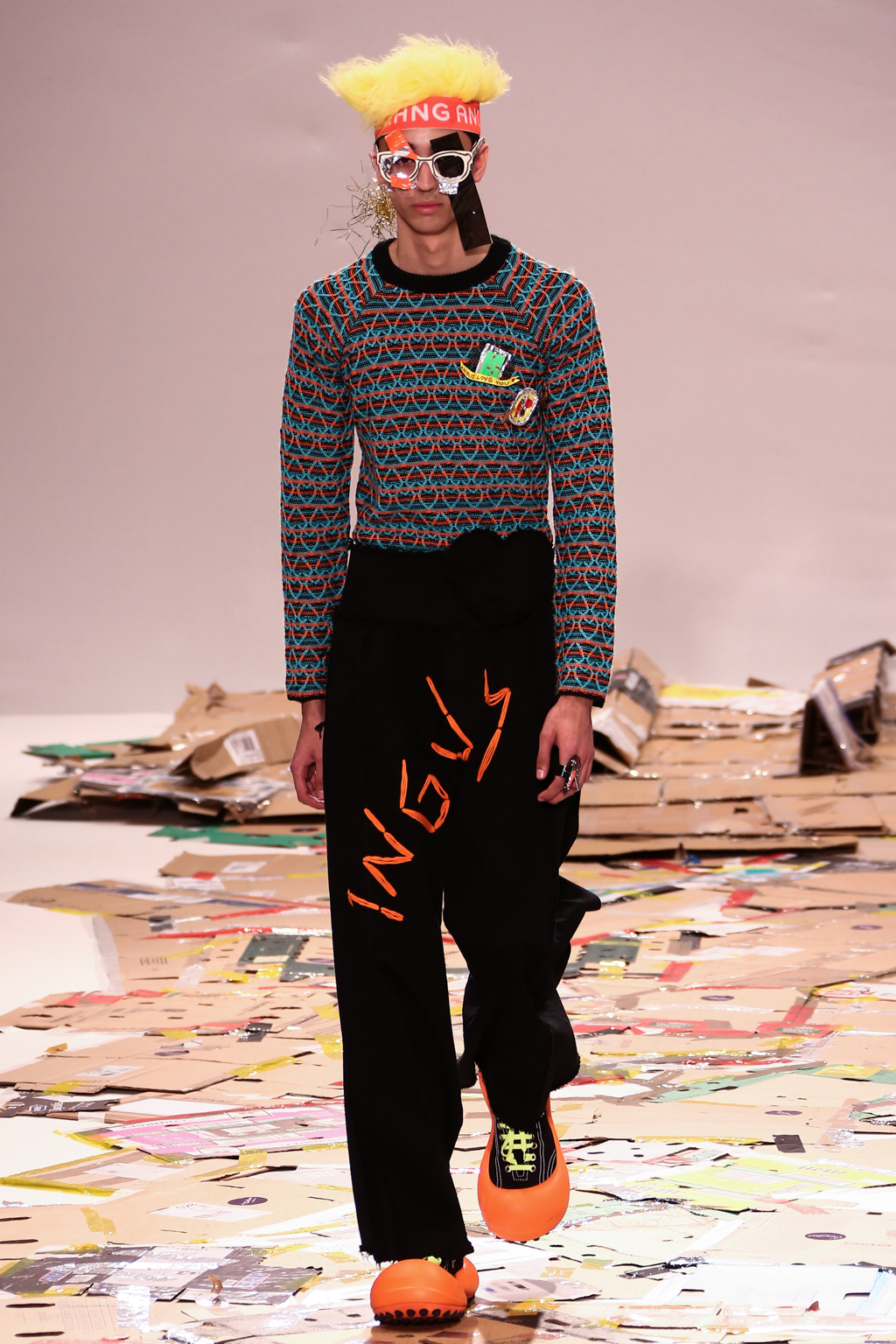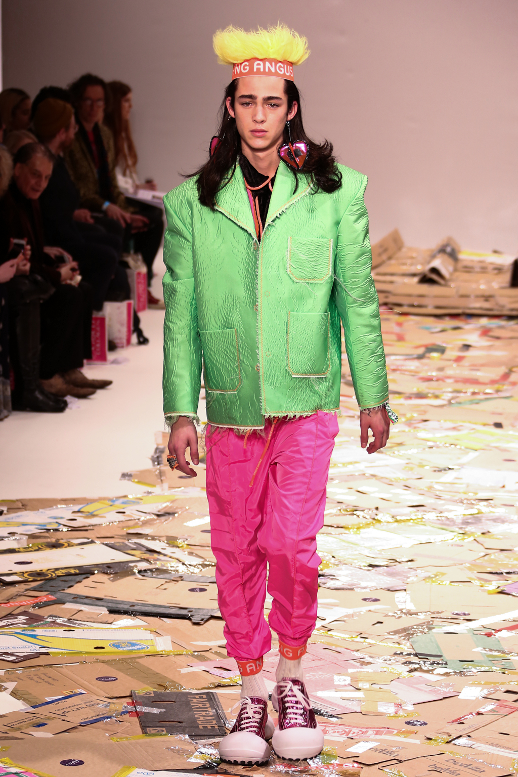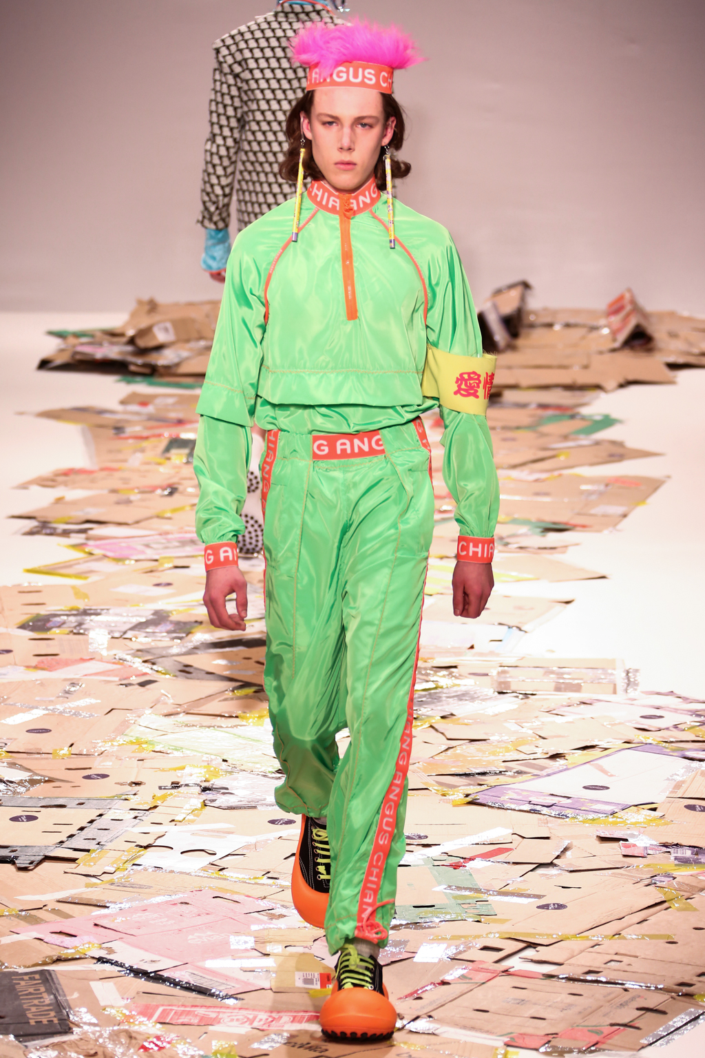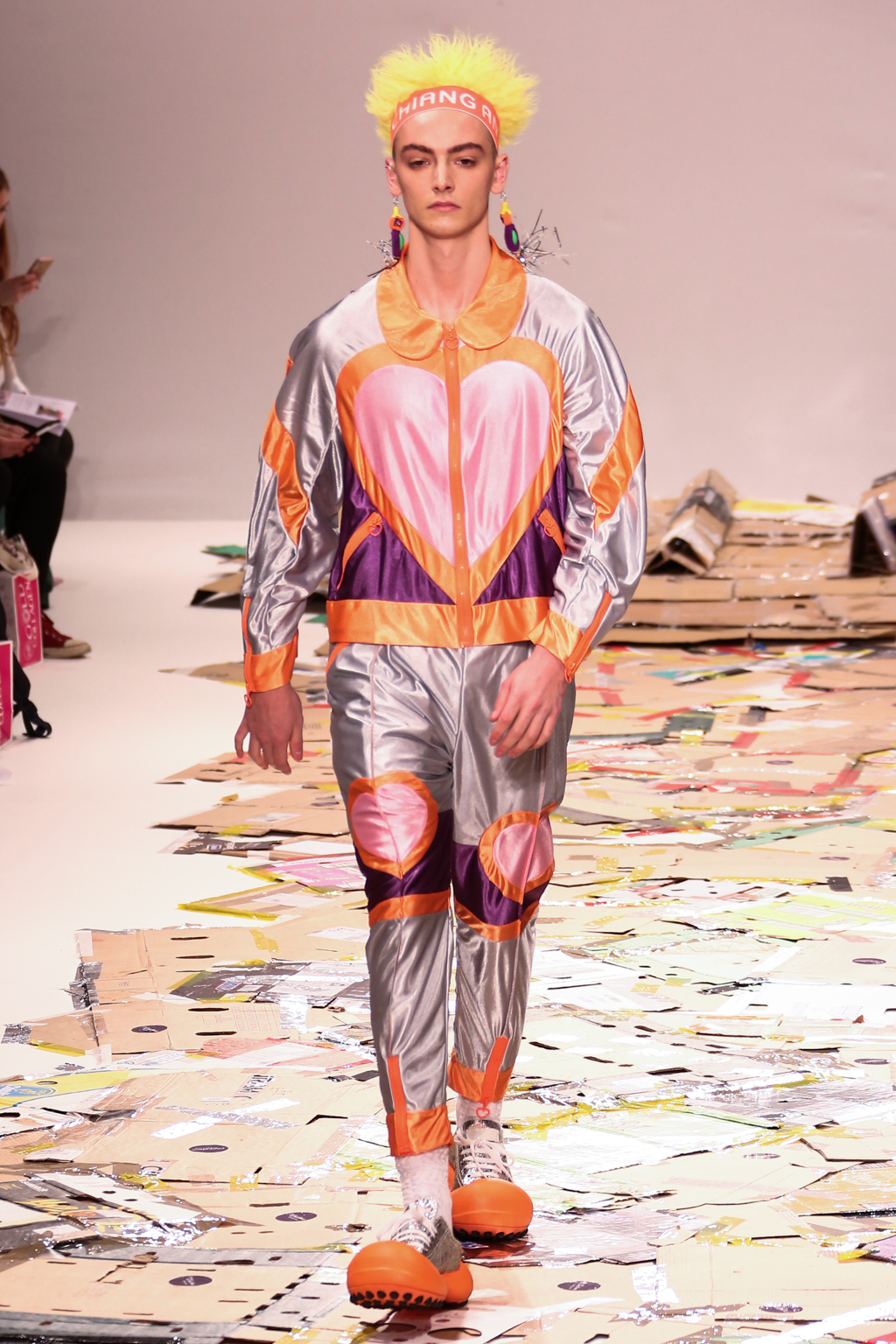 Angus Chiang’s collection Credit Sheet took the audience back to the schoolyard. Continuing his playful take on menswear, Chiang’s models walked out onto a cardboard catwalk in his signature oversized rubber shoes in colourful outfits inspired by 90s electronic music and hip-hop culture. The runway, held together by neon tape, juxtaposed beautifully with the grand setting at the Freemason’s Hall.